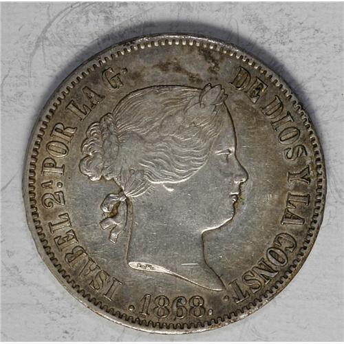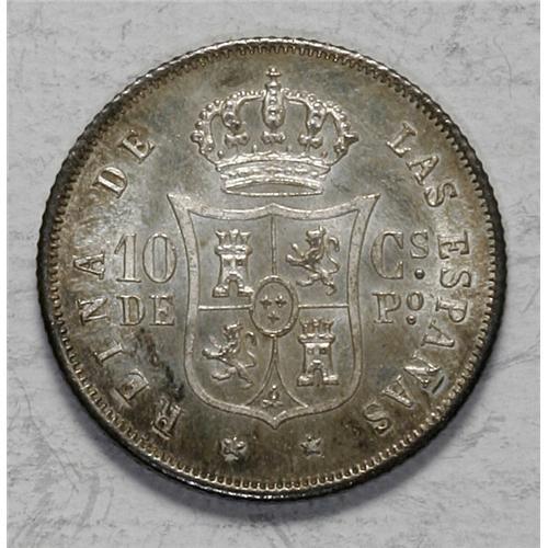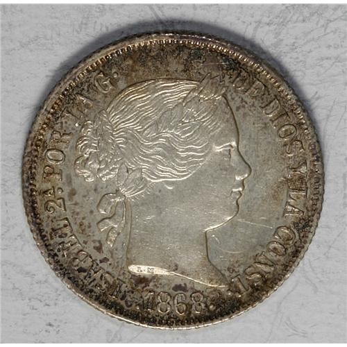<B>Spanish Philippines. Isabella II silver coins:</B></I> 10 Centimos 1868, KM-145, Gem Uncirculated, gorgeous iridescent golden blue toning, a superb piece; 20 Centimos 1868, KM-146, nicely toned AU; 50 Centimos 1868, KM-147, Choice XF, soft strike obverse, light toning and attractive. <BR><I>From the Monedas Oro Collection</B></I><BR><BR><b>Shipping:</b> Coin/Currency (<a target="_blank" href="http://www.heritageauctions.com/common/shipping.php">view shipping information</a>)