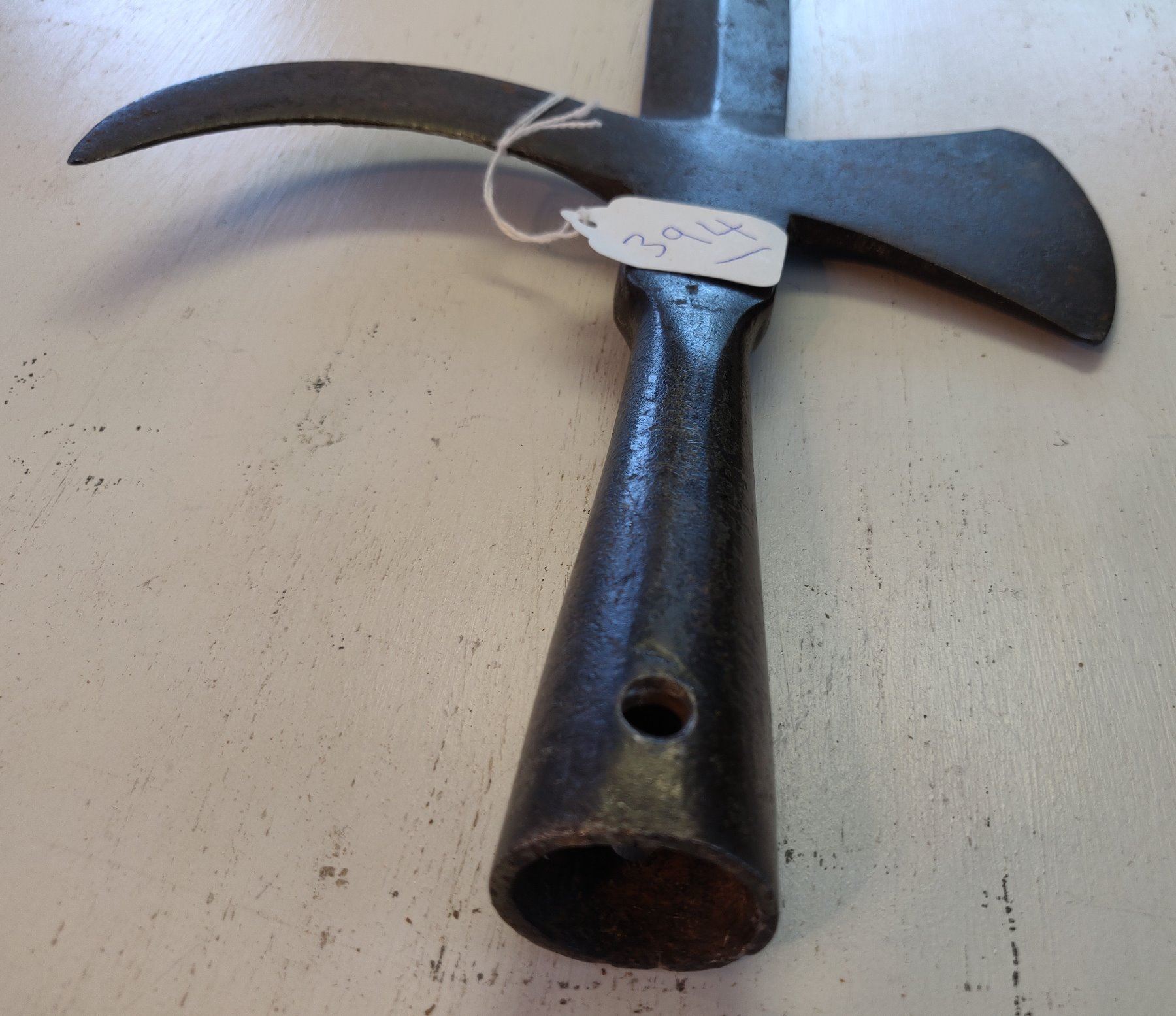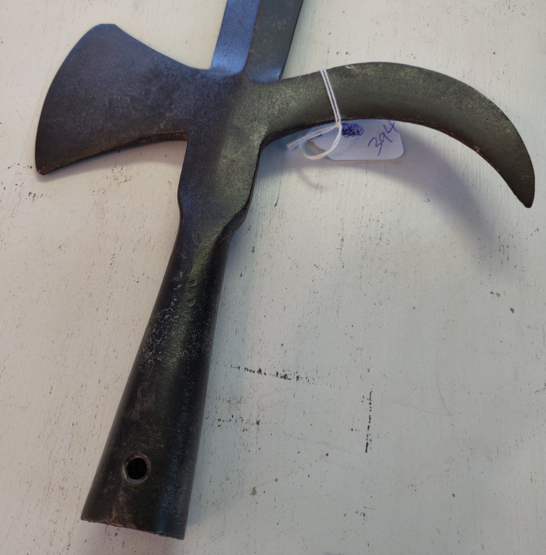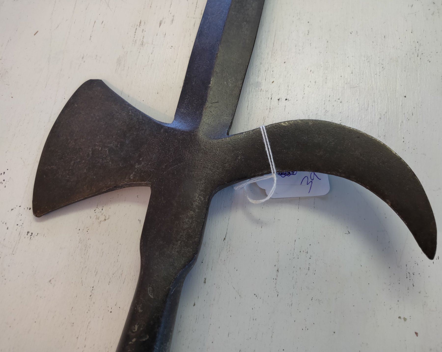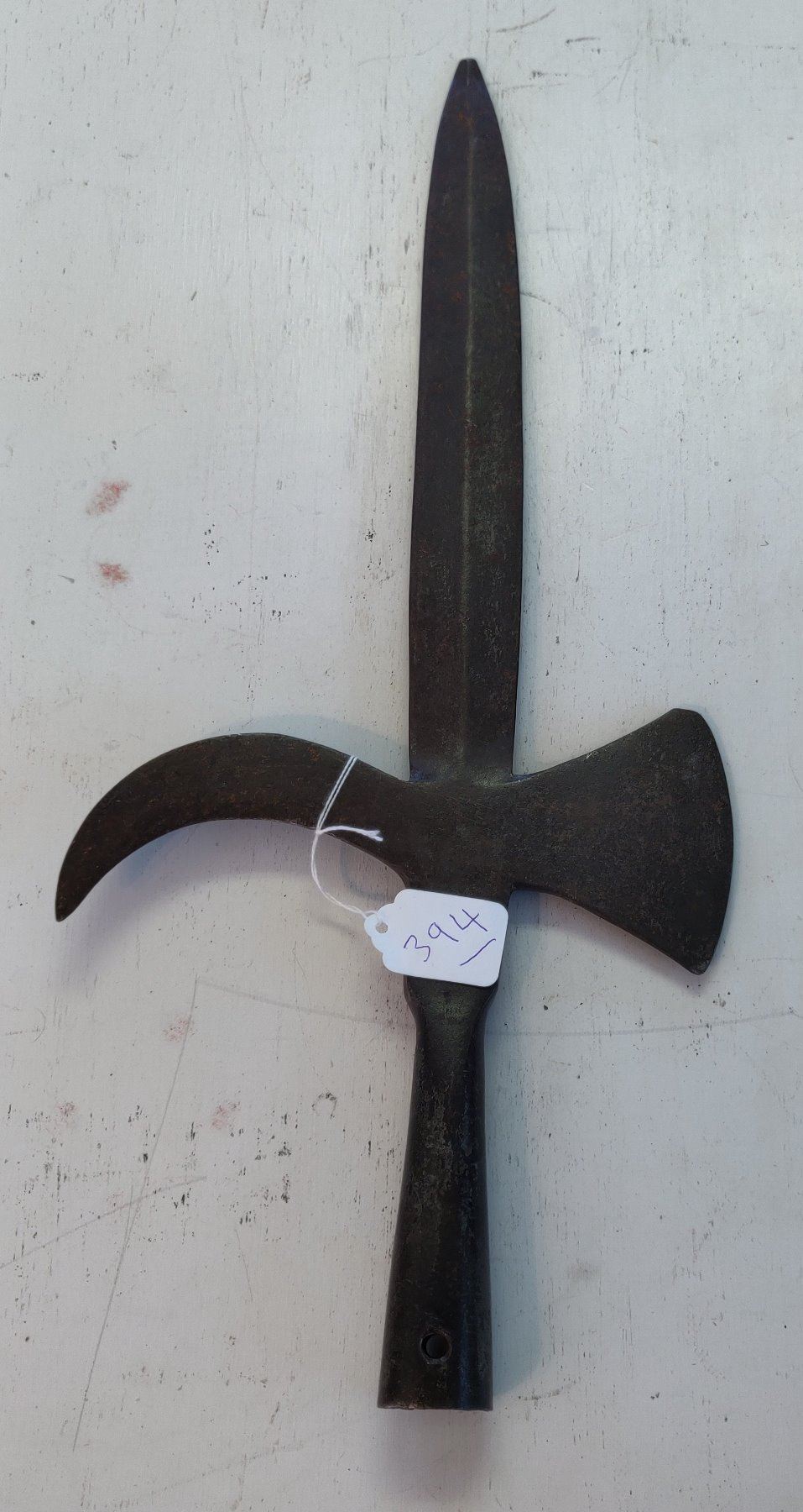 Spanish Pole Arm Head, c. 1600s. Made of hand-forged steel, the item measures 19" long. Spain. Probably had a handle over 6' long. Condition: Tip damage, nick on axe bit, see images. Shipping: $26.50 USA estimate only, w/insurance and signature, due to size, value and weight.