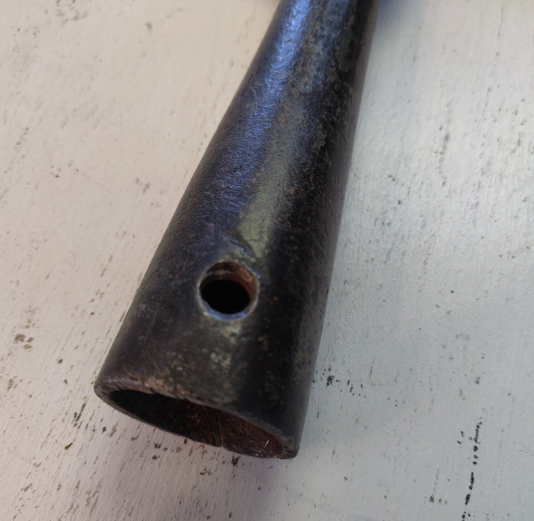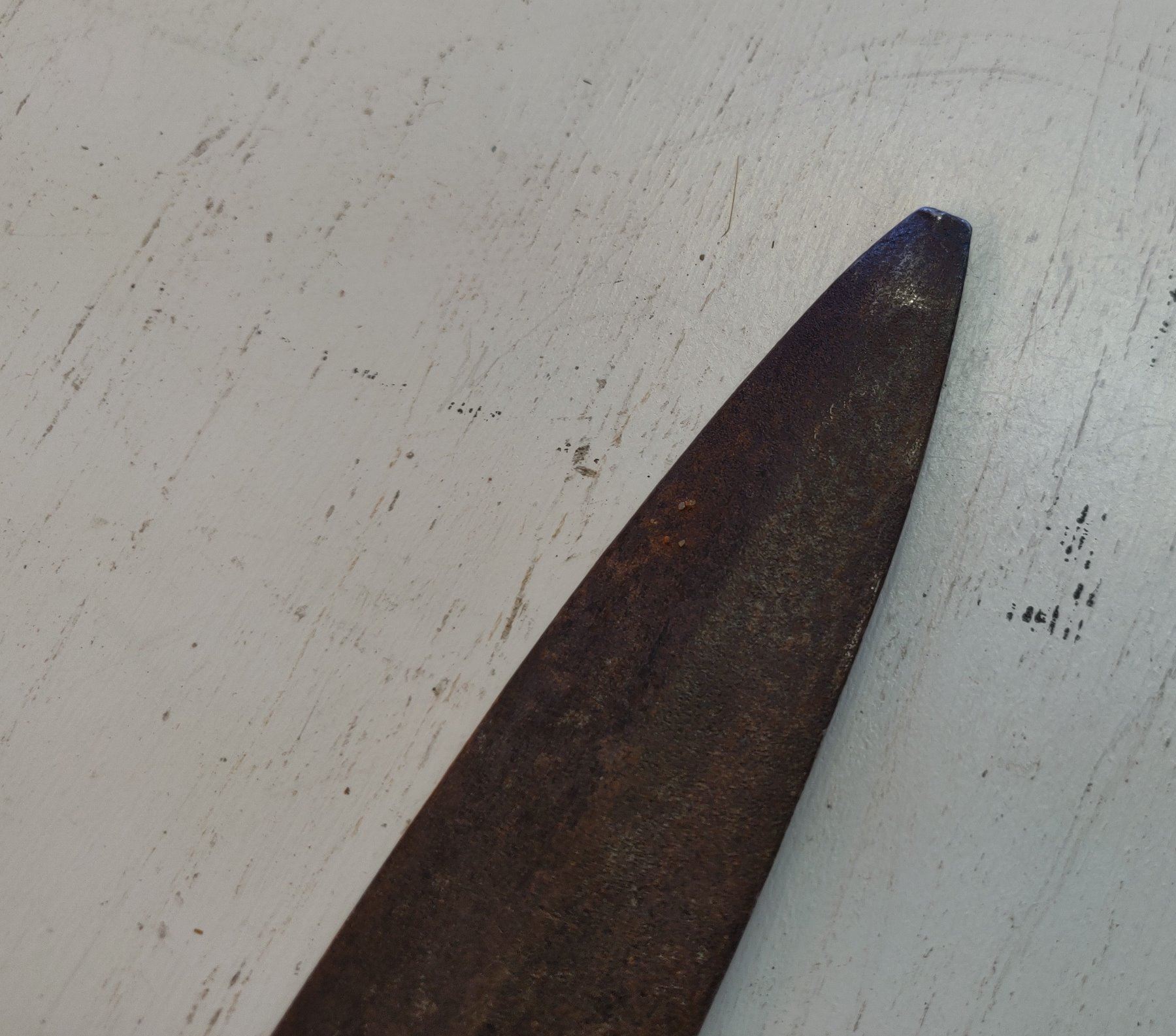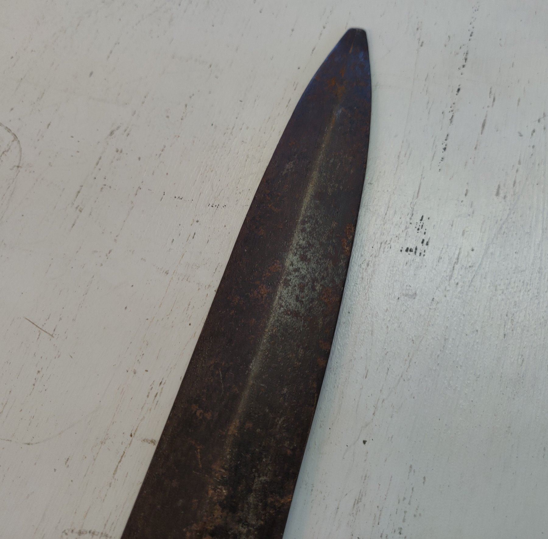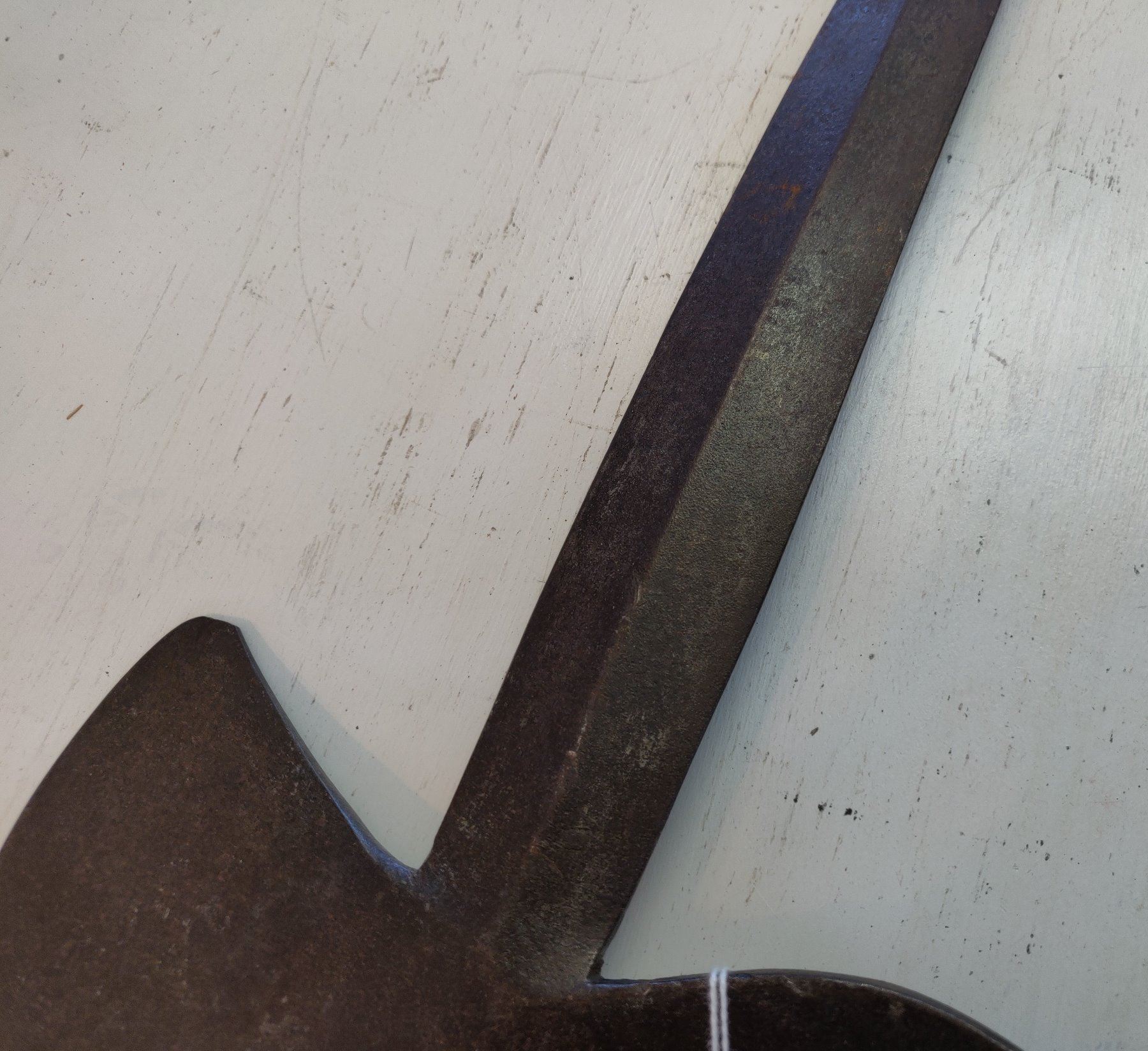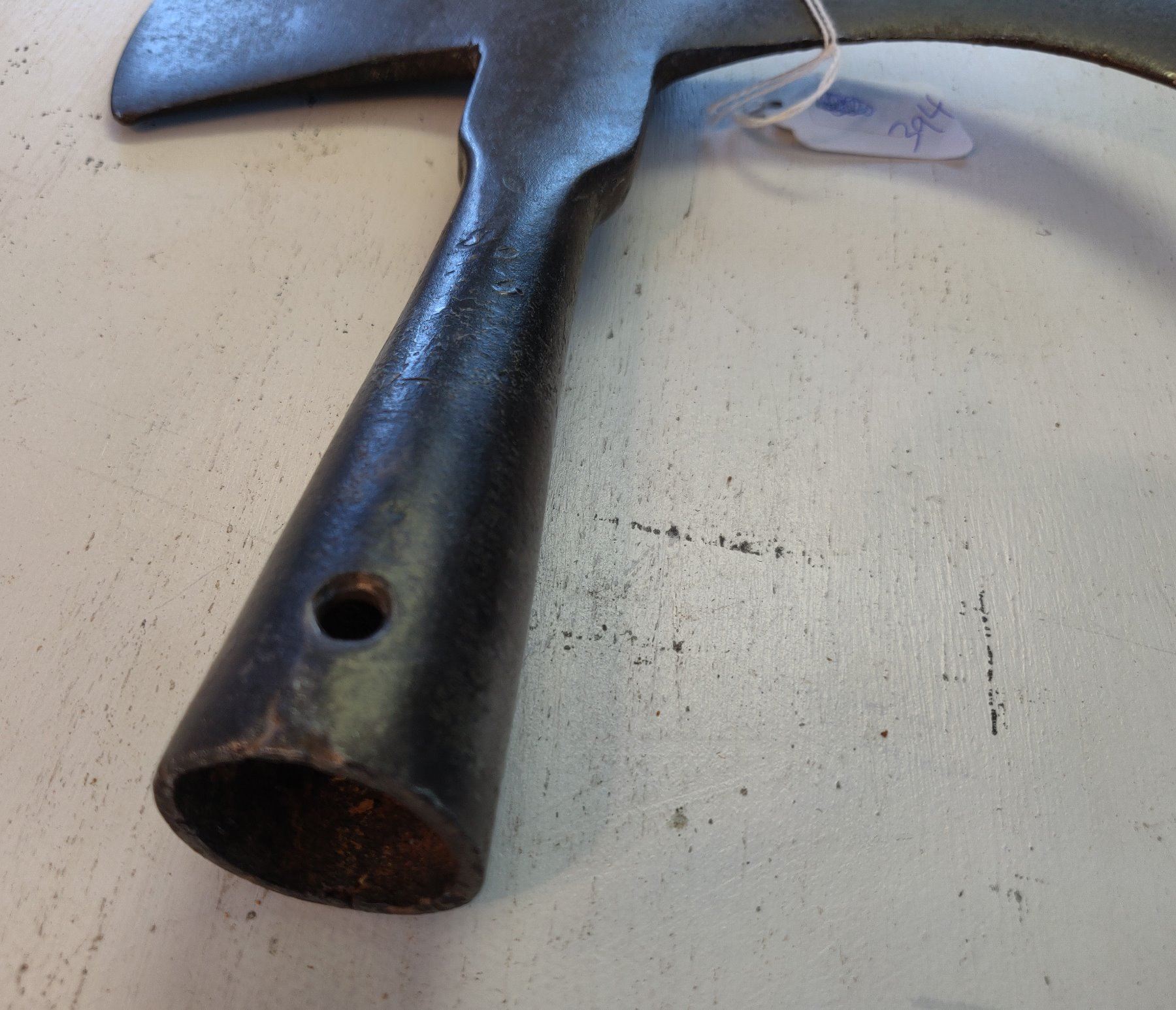 Spanish Pole Arm Head, c. 1600s. Made of hand-forged steel, the item measures 19" long. Spain. Probably had a handle over 6' long. Condition: Tip damage, nick on axe bit, see images. Shipping: $26.50 USA estimate only, w/insurance and signature, due to size, value and weight.