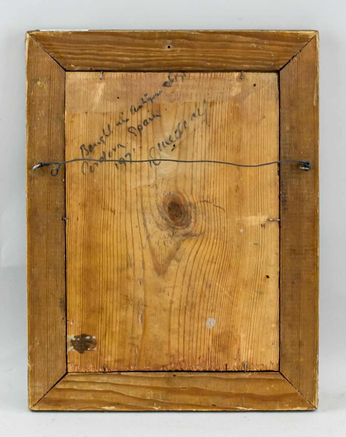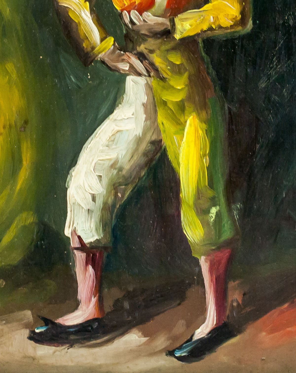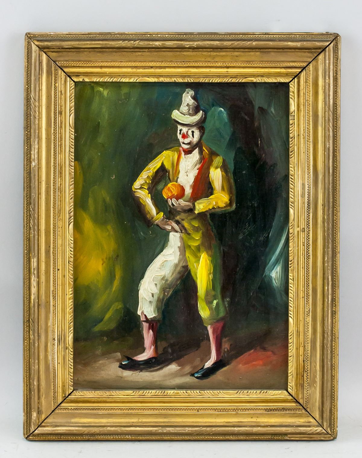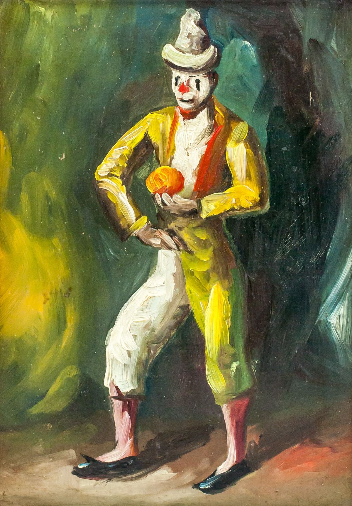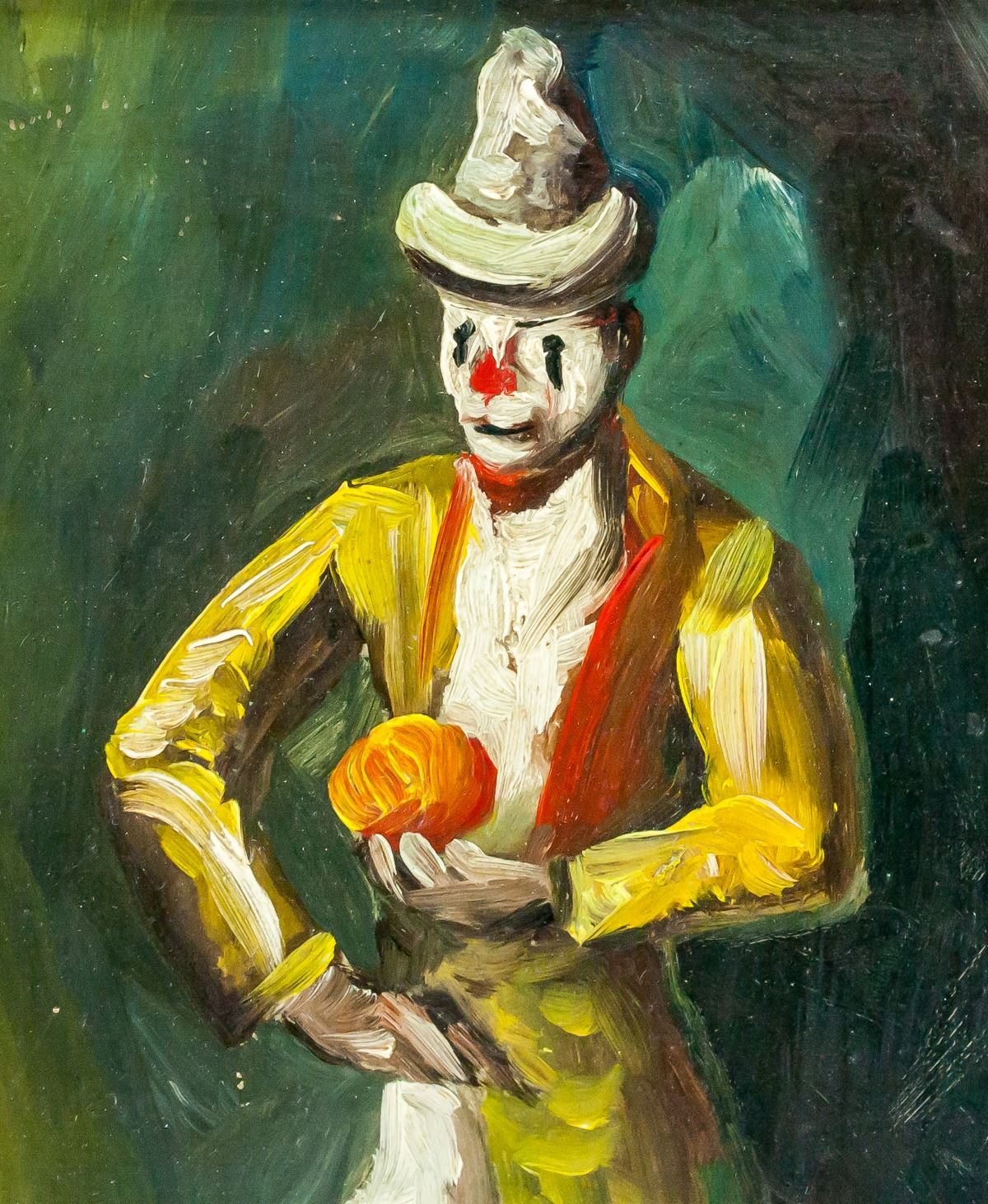 Oil on panel, framed. Featuring a portrait of a clown. Inscribed on verso in pen, "Bought in Antique ? Cordova, Spain, 1971" with illegible signature. 28 x 20 cm (11.0 x 7.9 inches)