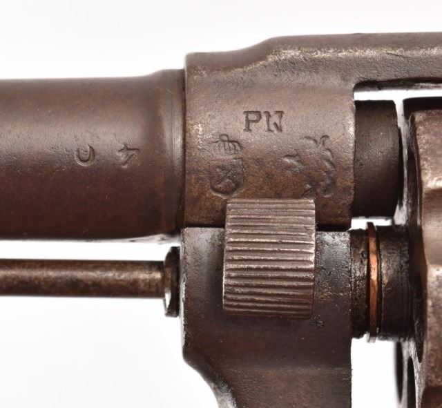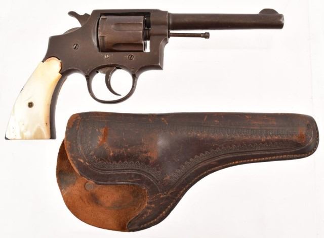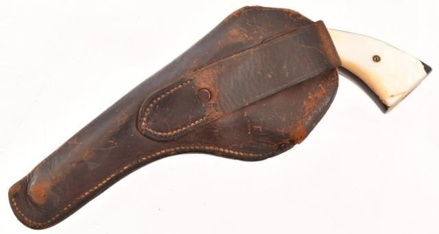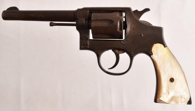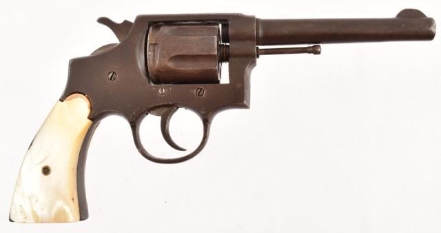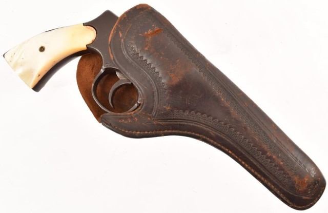 Spanish made copy of S&W. Pearl grips, approximately 5" barrel. Showing Mexican and border use, with accompanied leather holster. Serial #8021
