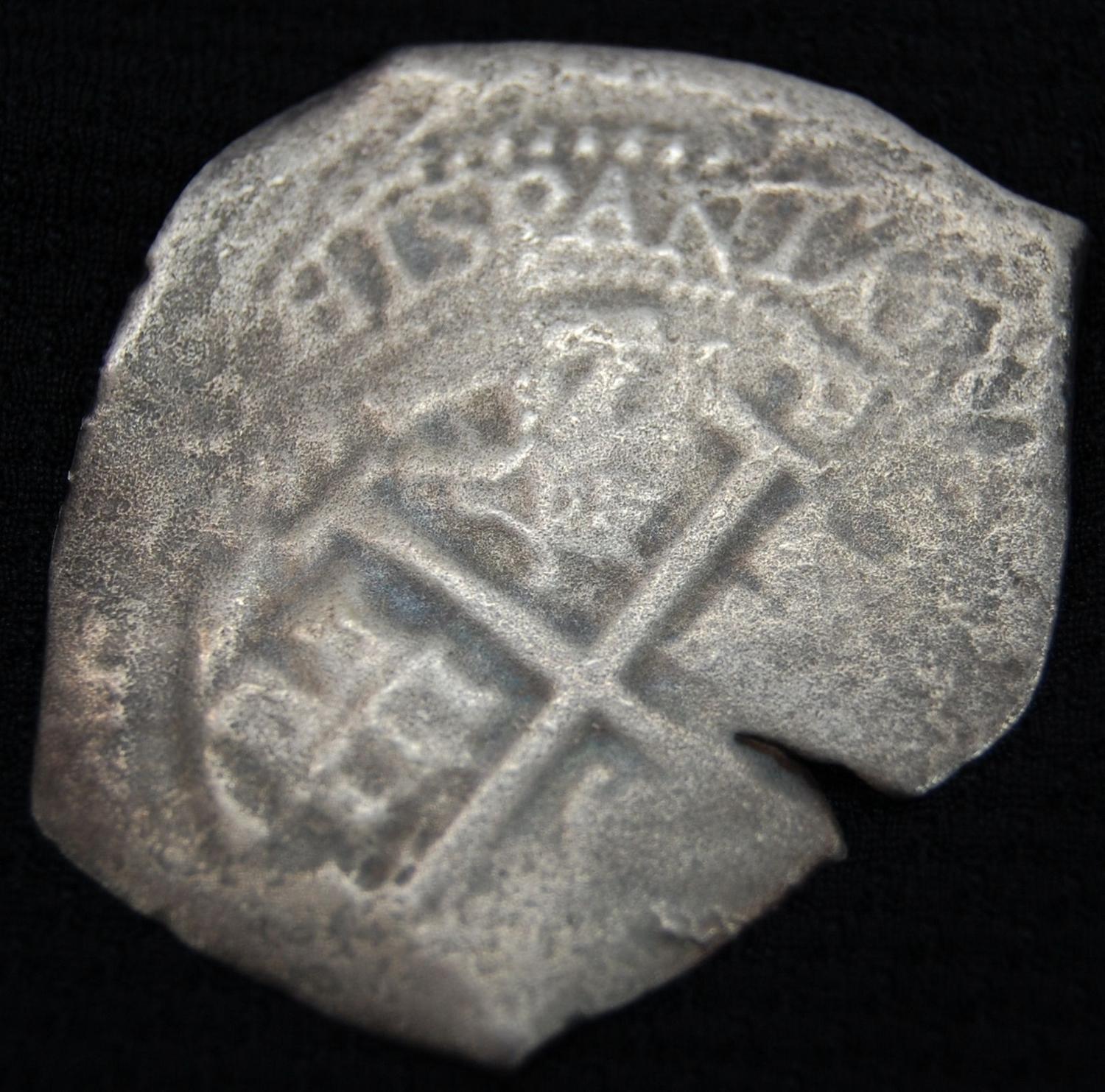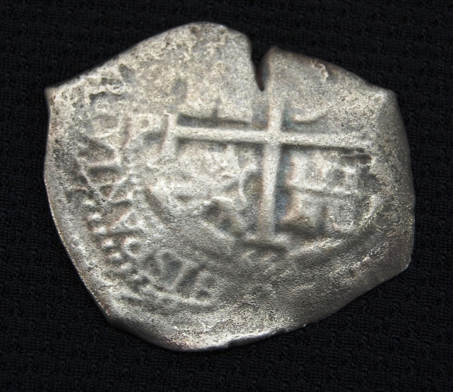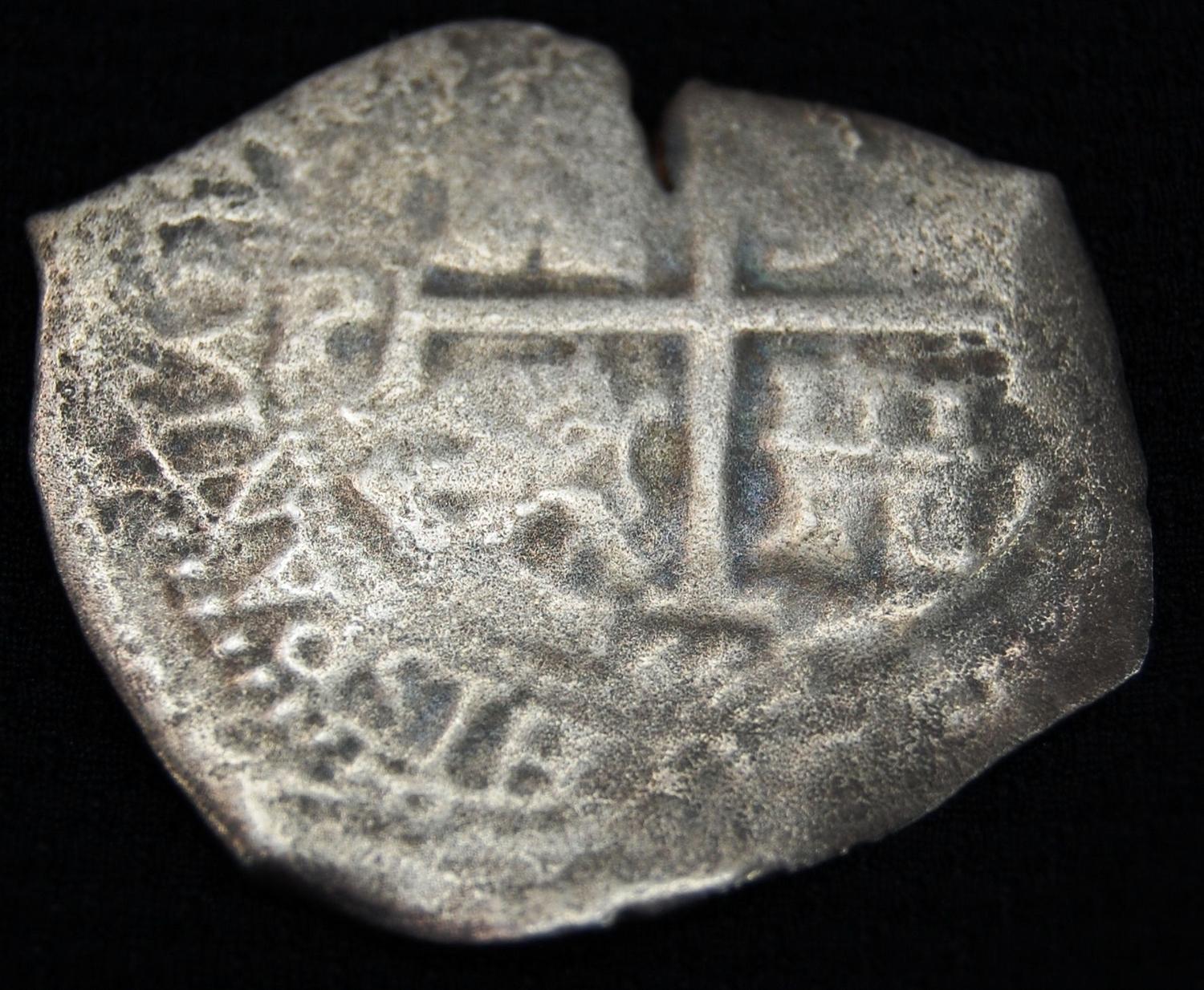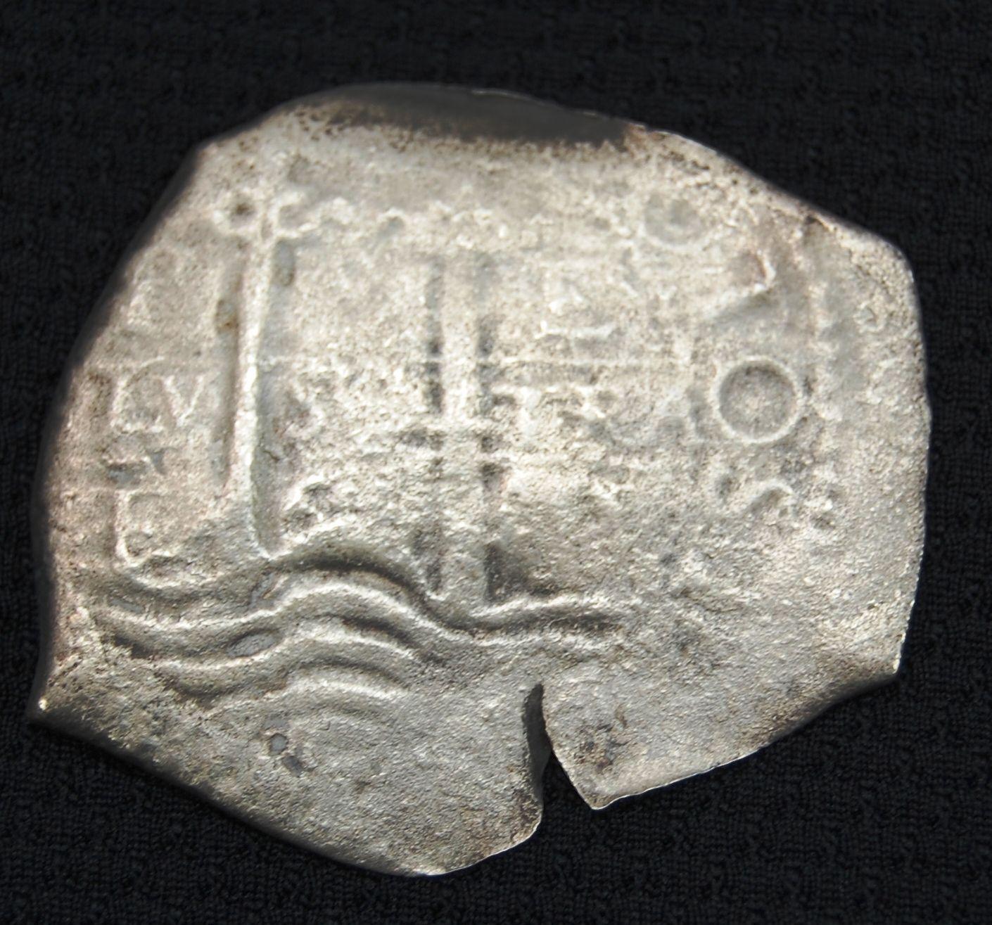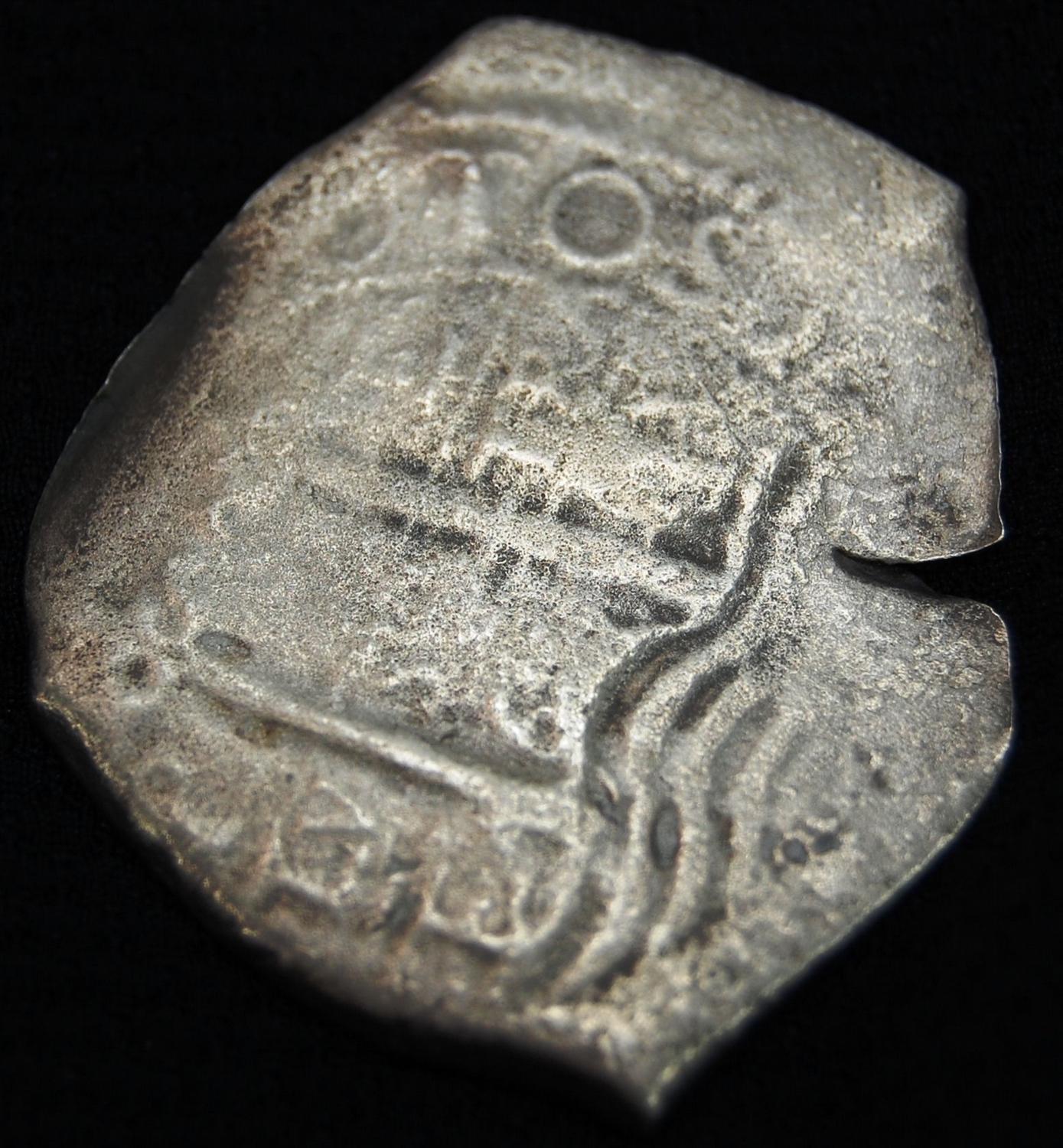 This loose Spanish Silver Eight Reale was salvaged from a pirate attacked shipwreck, "Consolacion", that sank in 1681, near a remote island off Ecuador. This coin was minted in Potosi, Bolivia. The coin has a nice partial cross strike with a mint mark "P", and lion and castle marks visible on one side. On the reverse side, the mint, assayer, and a partial date appear, along with part of the word Potosi, written out on the coin, which is a hard feature to find on these coins. This coin was salvaged in 2008 by treasure divers. The total weight of the coin i 15.8 grams, and it is accompanied by a Certificate of Authenticity.