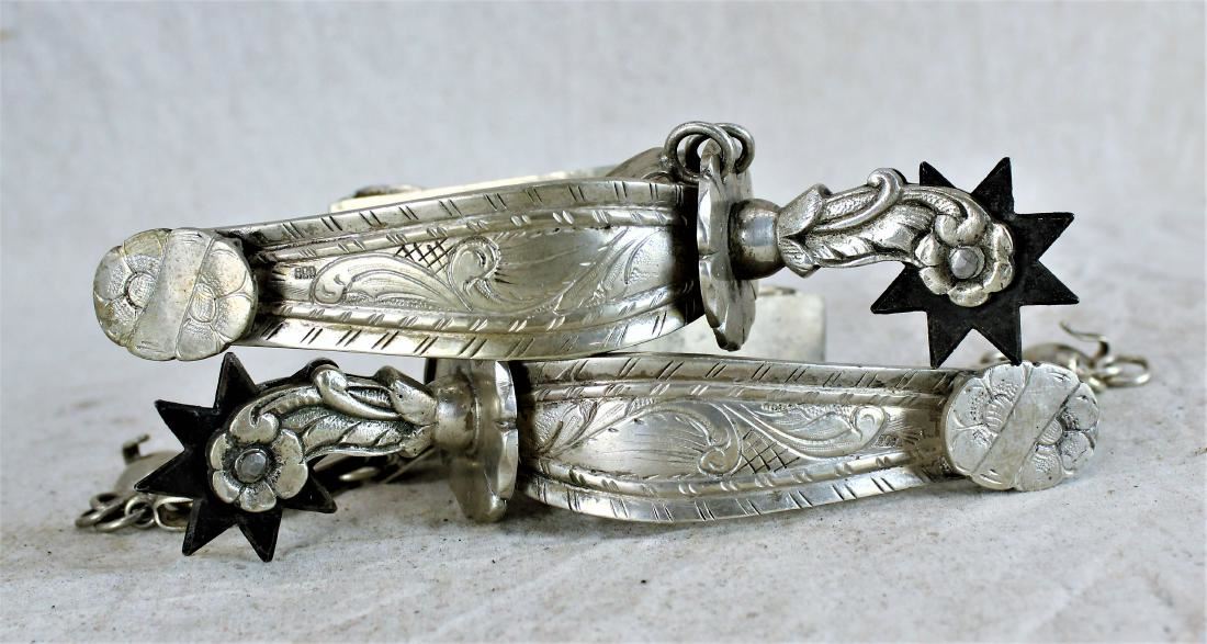Wonderful solid silver spurs, deeply engraved with scroll design, molded shanks, and multi-point rowels.