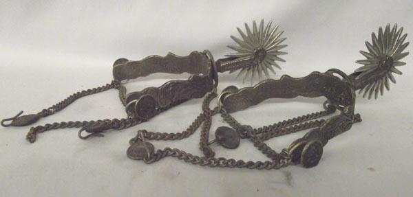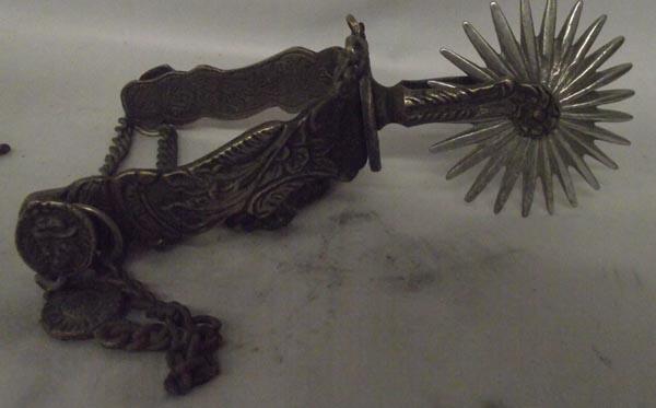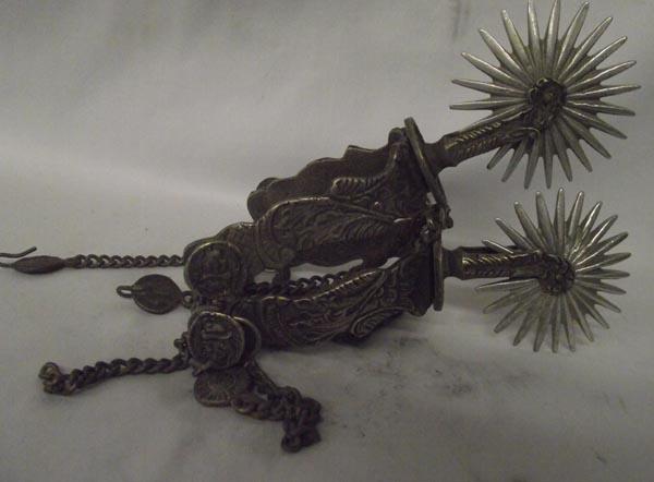 Pair of Spanish spurs. 3'' rowel, heel width 4''. Intricate pattern inside and out. Heel and ankle chains. Buyers Pay Actual Shipping and Handling Charges(see terms and conditions for more information).