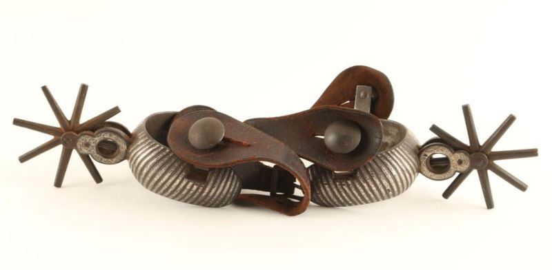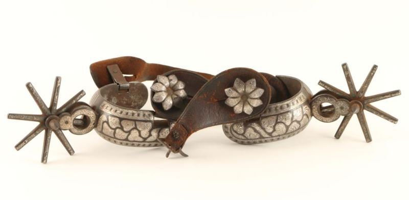 Silver overlay with a leaf design. Large rowels with a floral motif leather button. Brown leather straps. Show age, use and wear.