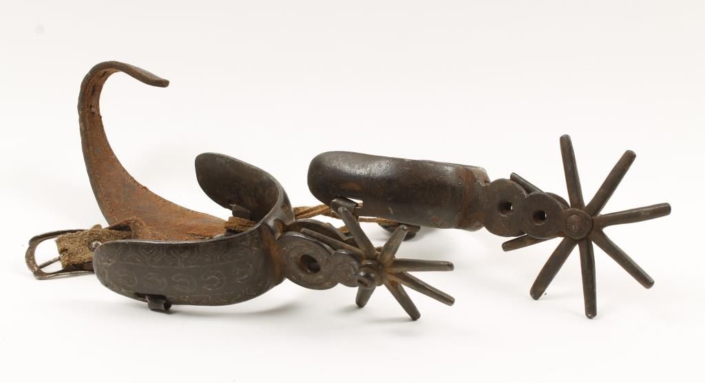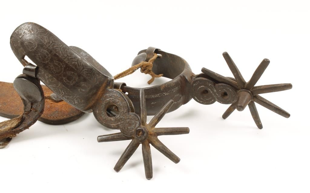 Antique steel spurs. 2 spurs that are similar but not an exact pair. Both have the long tine Spanish rowels and heavy steel body. Both have a horseshoe and bar motif around the heelpiece. The steel has turned to brown. Only one has the leather strap to buckle over the top of the boot upper. The other has a leather thong only. The strap is well tooled and relatively supple. Condition: Fair to good as antique.
