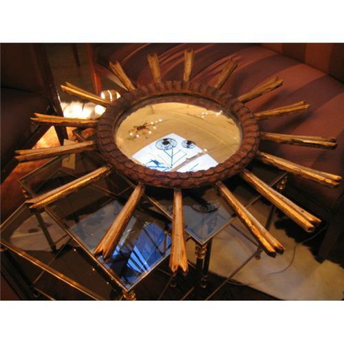 <table width="100%" border="0" cellspacing="0" cellpadding="4"><tr><td><em> </em></td></tr><tr> <td width="100%"> Vintage Spanish sunburst mirror with gilded rays and mercury glass convex mirror. </td></tr><tr> <td> </td></tr><tr> <td>Reference #: BB2055b</td></tr><tr><td>Condition:great</td></tr><tr><td>Year:1960</td></tr><tr><td>Country:Spain</td></tr><tr><td>Height:35.5</td></tr><tr><td>Depth:2</td></tr><tr><td>Width:35.5</td></tr><tr><td>Title:Spanish Sunburst Mirror</td></tr><tr><td>Materials:gilded hand-carved wood, mercury glass</td></tr><tr><td>Location:Austin, TX</td></tr></table>