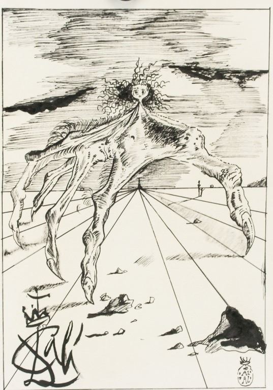 Ink on paper. Featuring surrealist composition of a spider-hand with a head on top. Signed "Dali" in the bottom left corner. 29.5 x 21 cm (11.6 x 8 in). Provenance: This lot carries limited provenance from an Upper New York estate