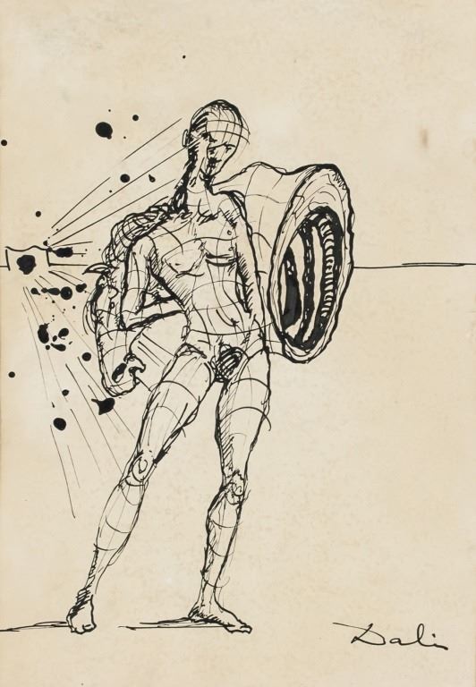 Ink on paper. Featuring a surrealist landscape composition scene. Signed Dali on the lower right corner. Label affixed to verso inscribed No. 00695. 24 x 16 cm (9.5 x 6.25 inches). PROVENANCE: Private European collection