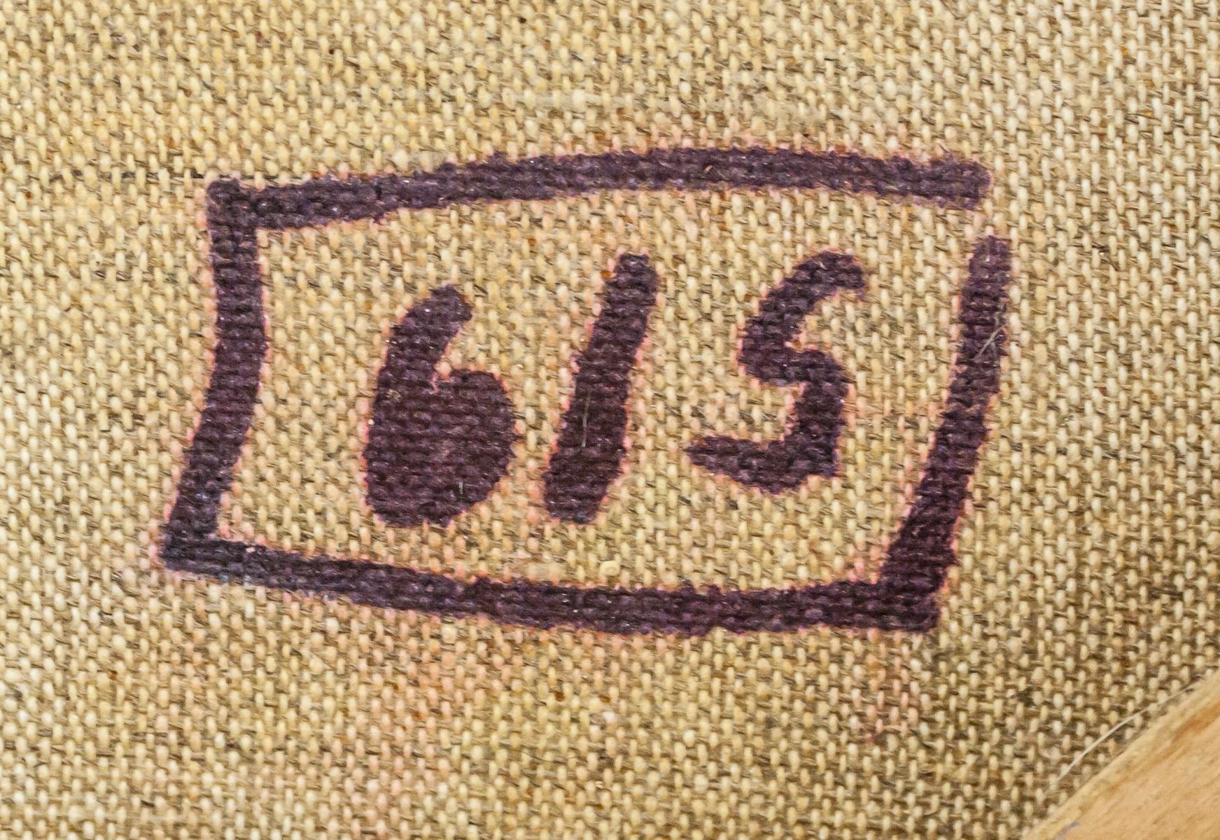 Oil on canvas. Featuring surrealist composition of a pair of eyes peering out of the sky with glowing shapes beneath and beside the eyes. Signed "Dominguez" to the bottom left corner. Oil paint damaged in corners. "2065" inscribed on verso in red marker over an illegible stamp. "615" inscribed on verso in marker. 55 x 46 cm (21.75 x 18 inches).