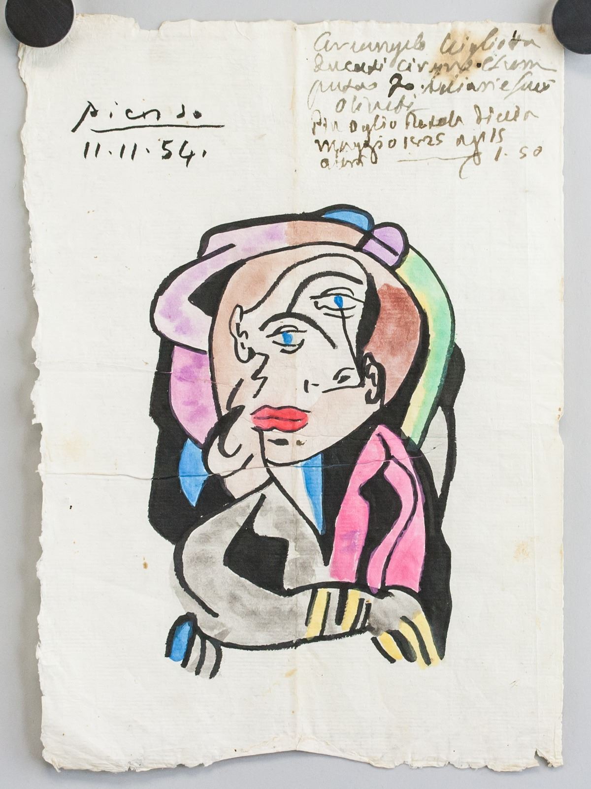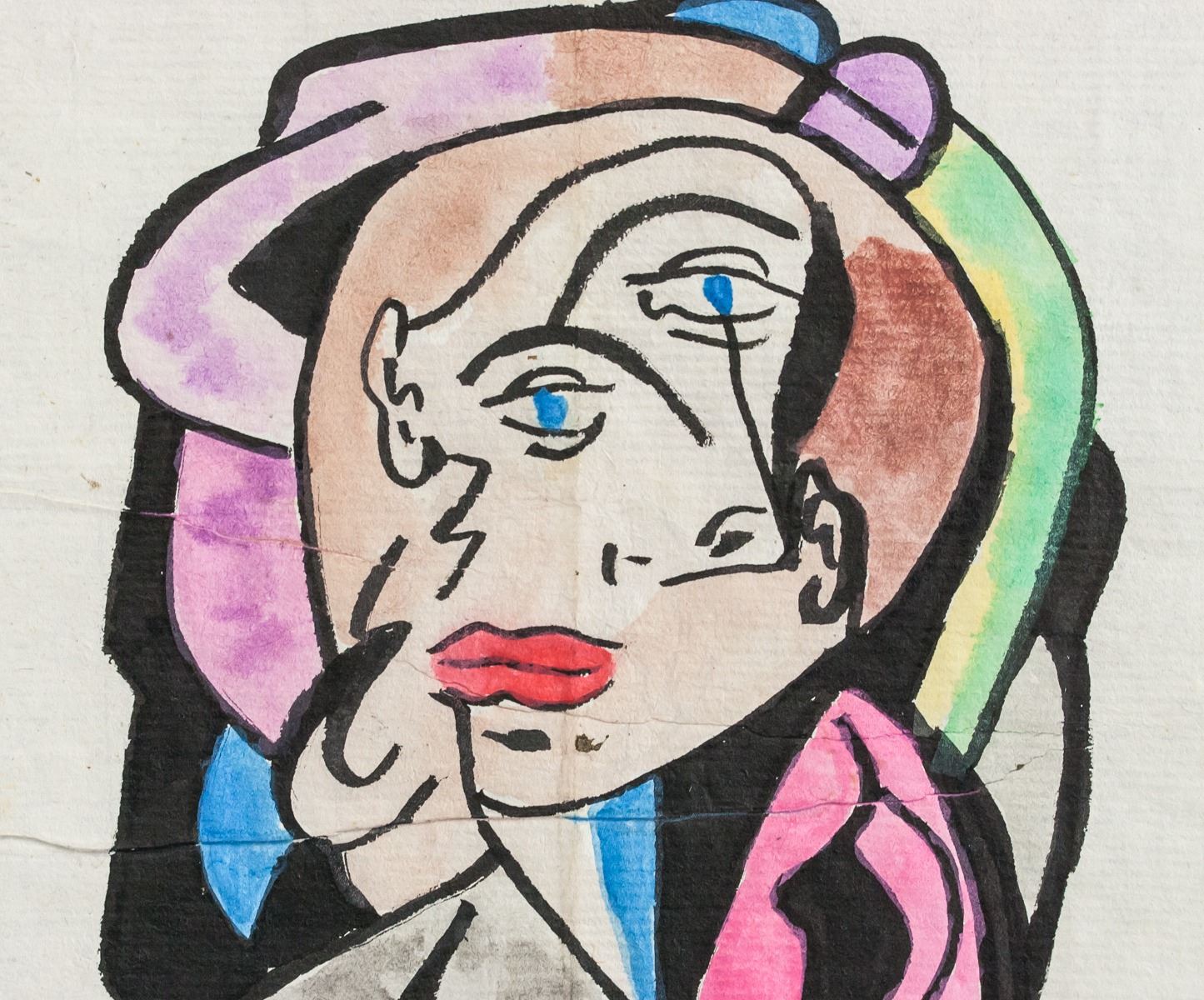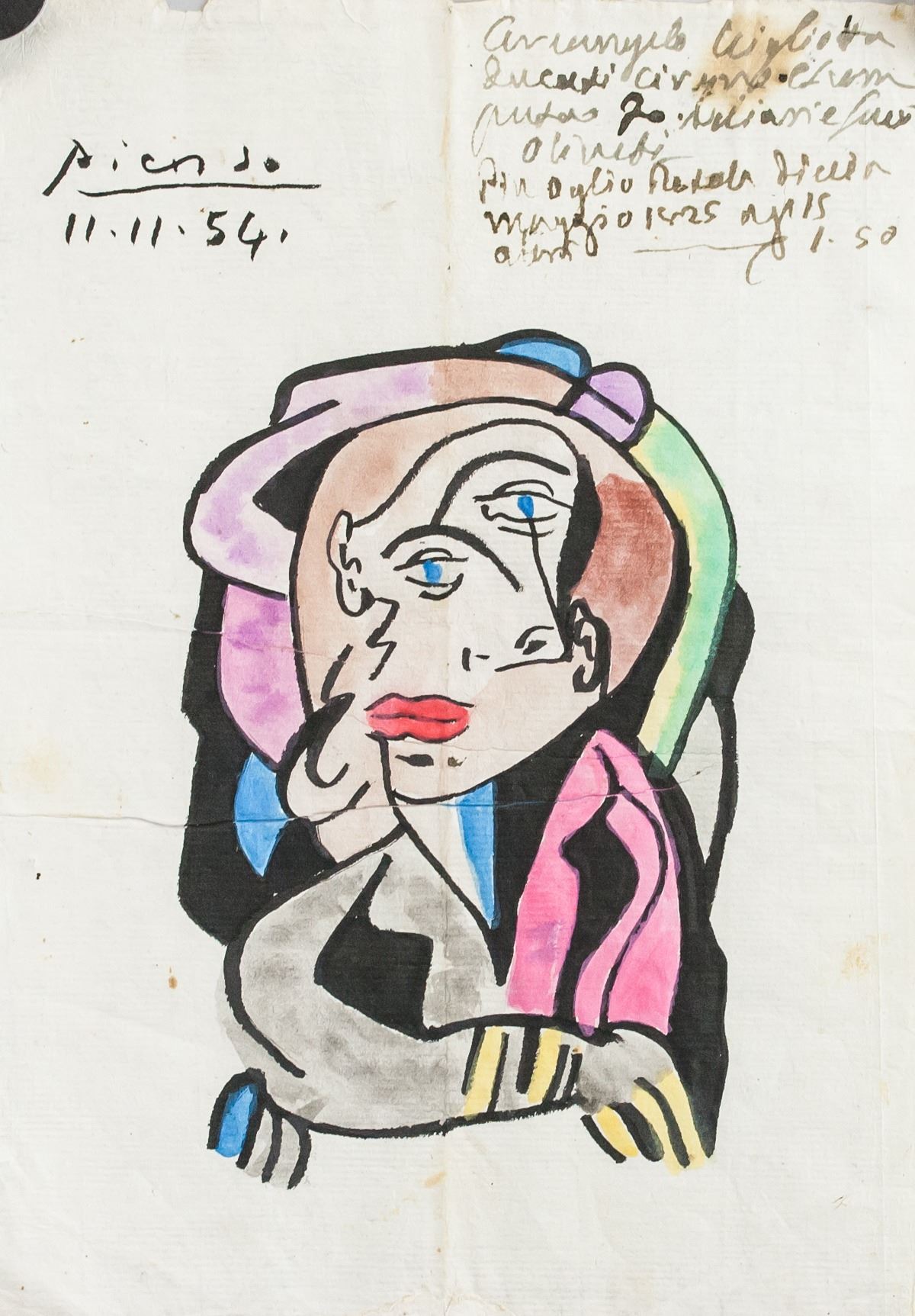 Watercolor and ink on paper. Featuring a cubist portrait. Signed Picasso and inscribed 11.11.54 on the upper left corner. Inscribed on verso. 27.5 x 19 cm (10.75 x 7.5 inches). Provenance: This lot carries limited provenance from an Upper New York estate