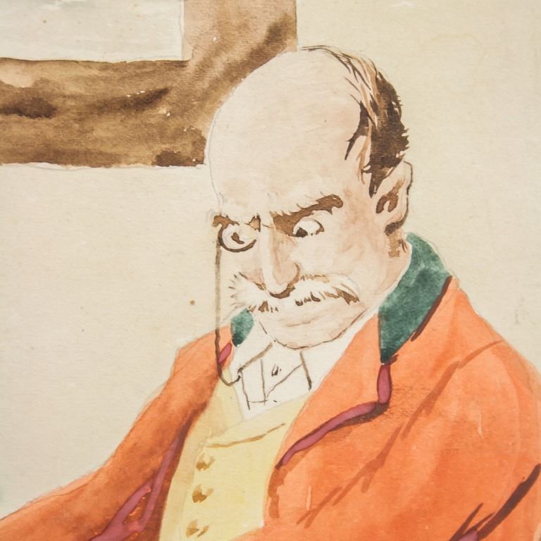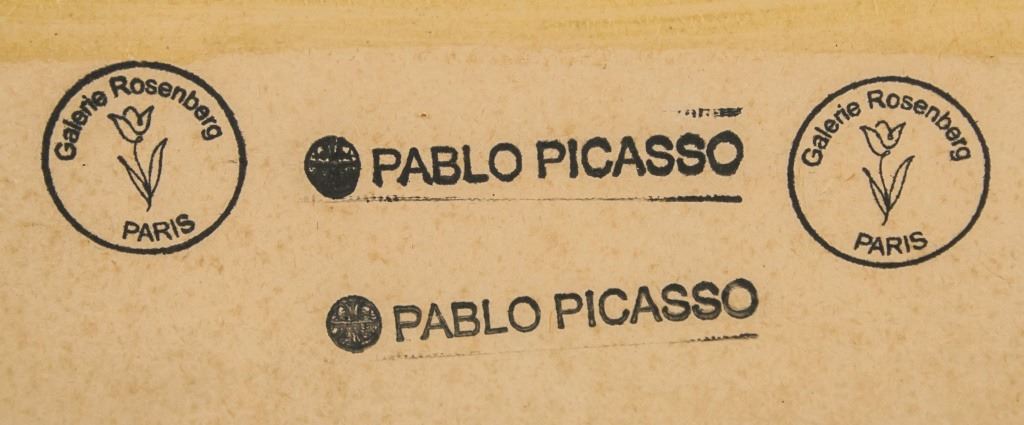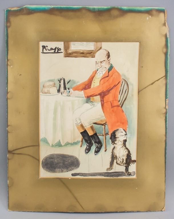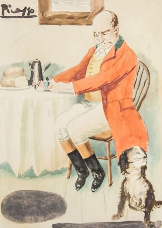 Watercolor on paper. Featuring man at the breakfast table with a dog by his feet. Signed "Picasso" to the top right. Stamps on verso read "Galerie Rosenberg PARIS" and "PABLO PICASSO". 47 x 37.5 cm (19 x 14.7 inches). 31.5 x 22.5 cm (12.5 x 9 inches).