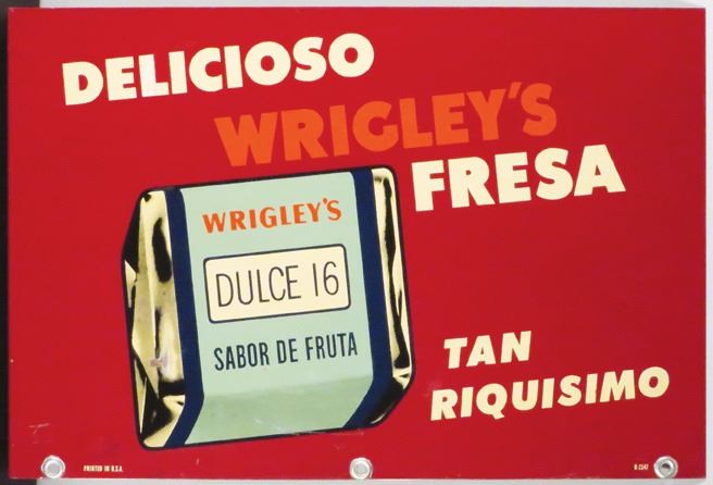 Spanish Wrigley's Tin Flange Sign. "Delicioso" A few light scratches otherwise very good condition. 18 1/4 X 12 inches.