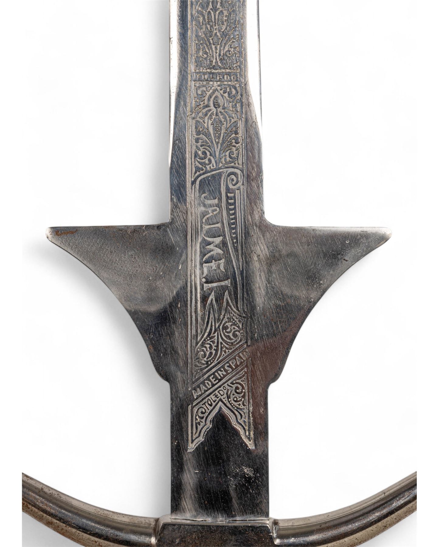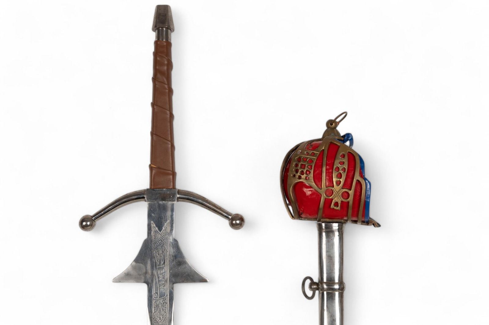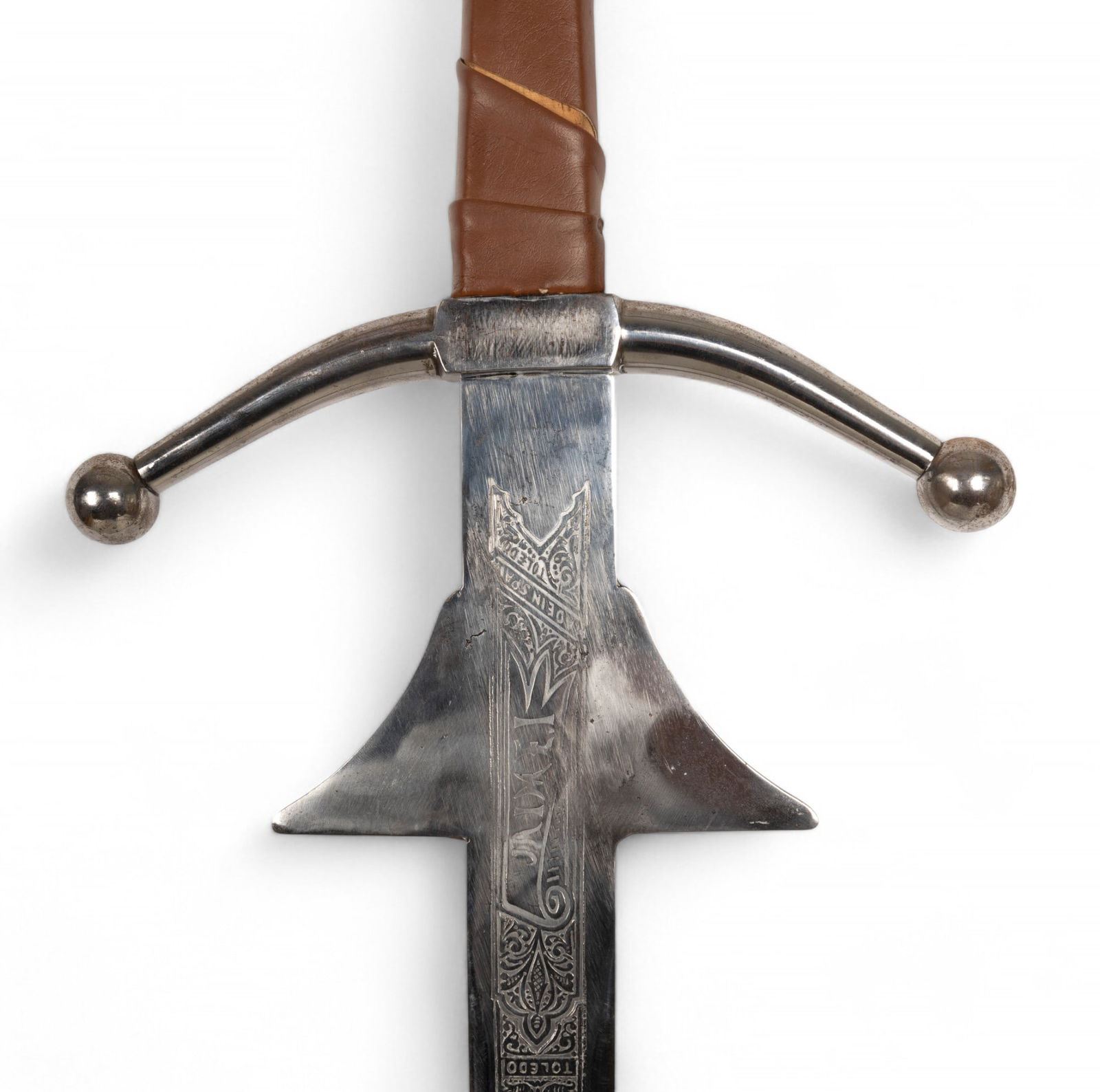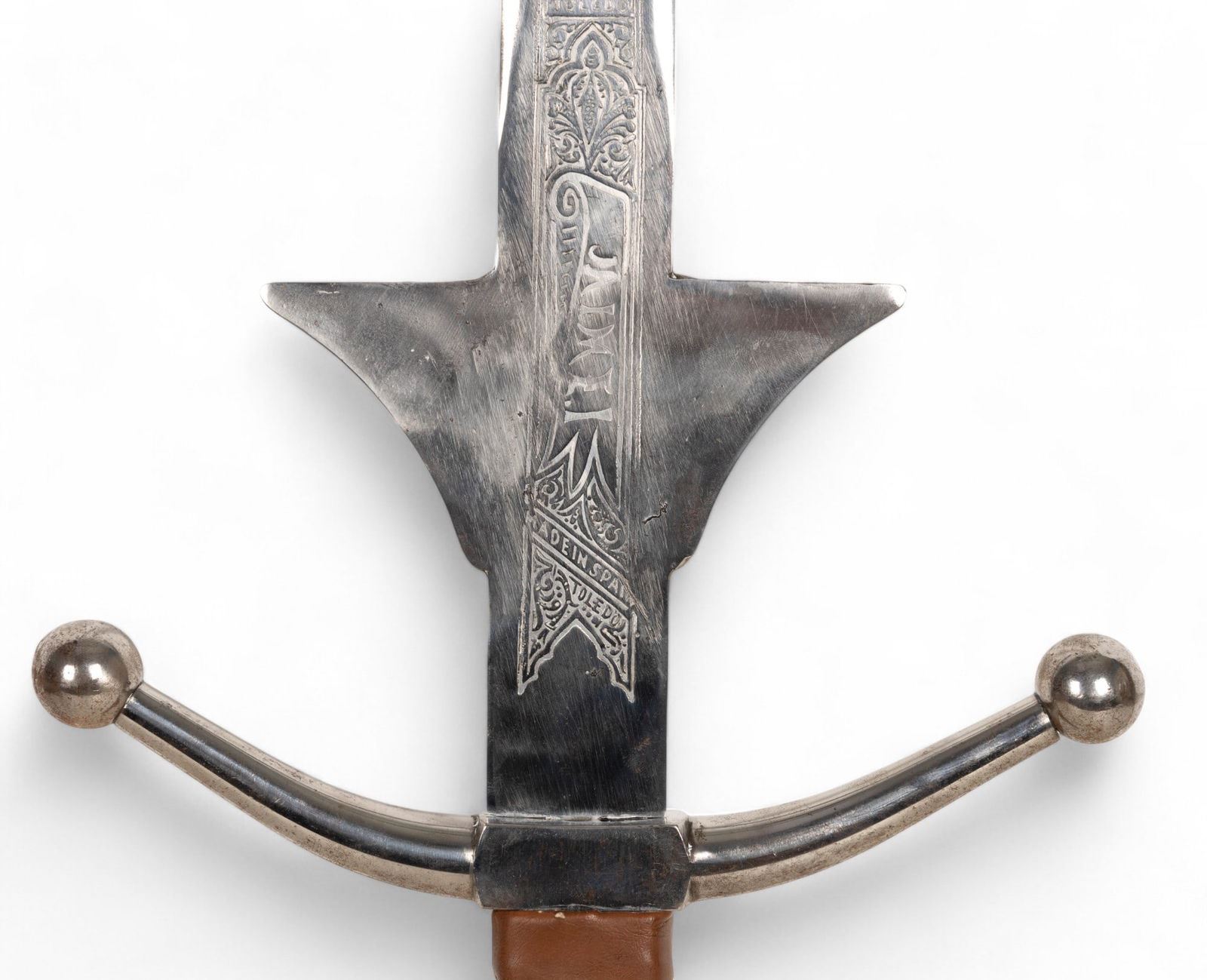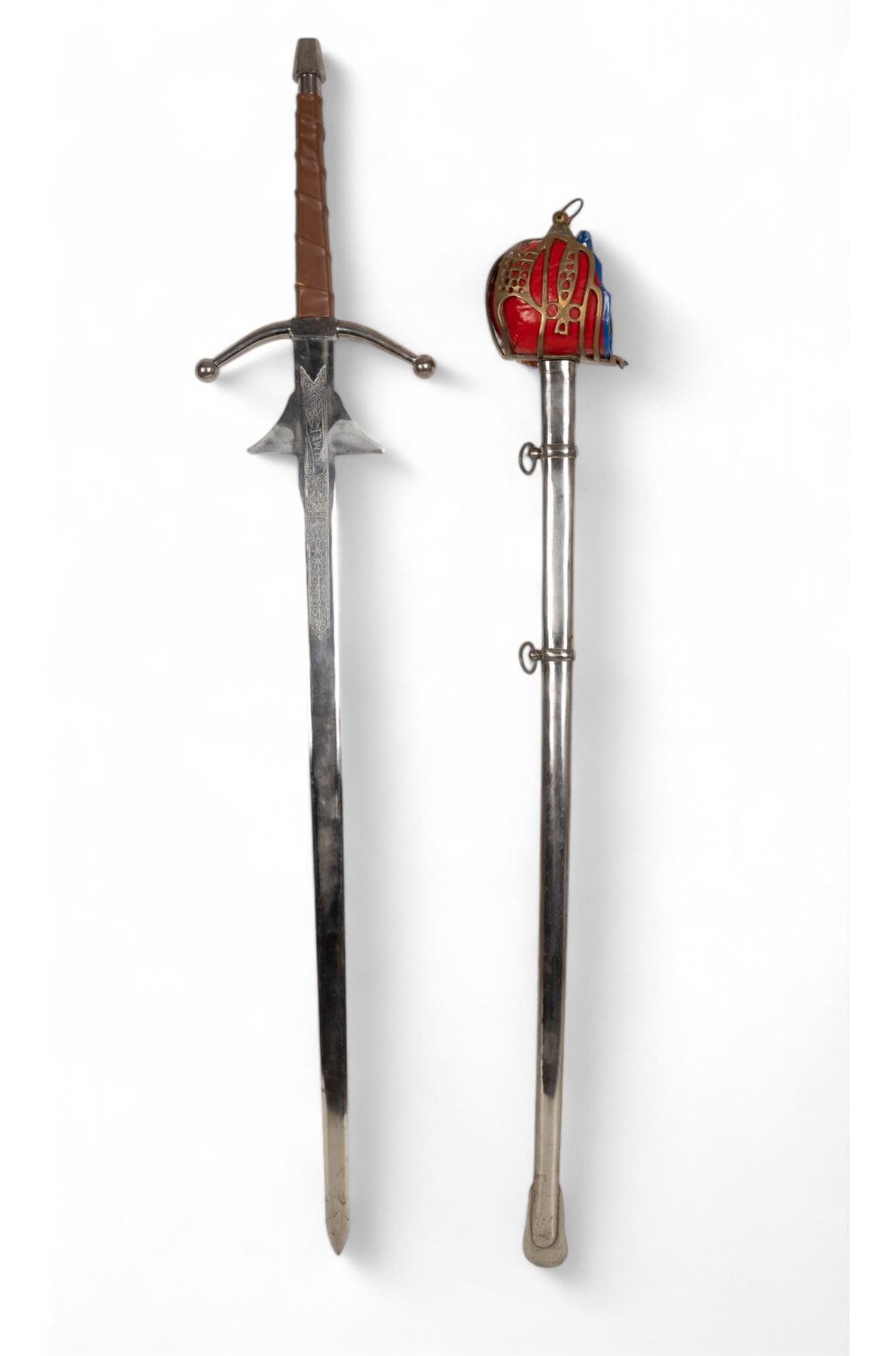 Jaime I decorative sword marked "Made in Spain - Toledo" with blade approx. 38" L and 50" total. Blade has etched designs and some oxidation on metal; handle is wrapped in brown leather. Unmarked Scottish officer's sword with metal scabbard and hand crafted guard accents measuring approx. 44" L.