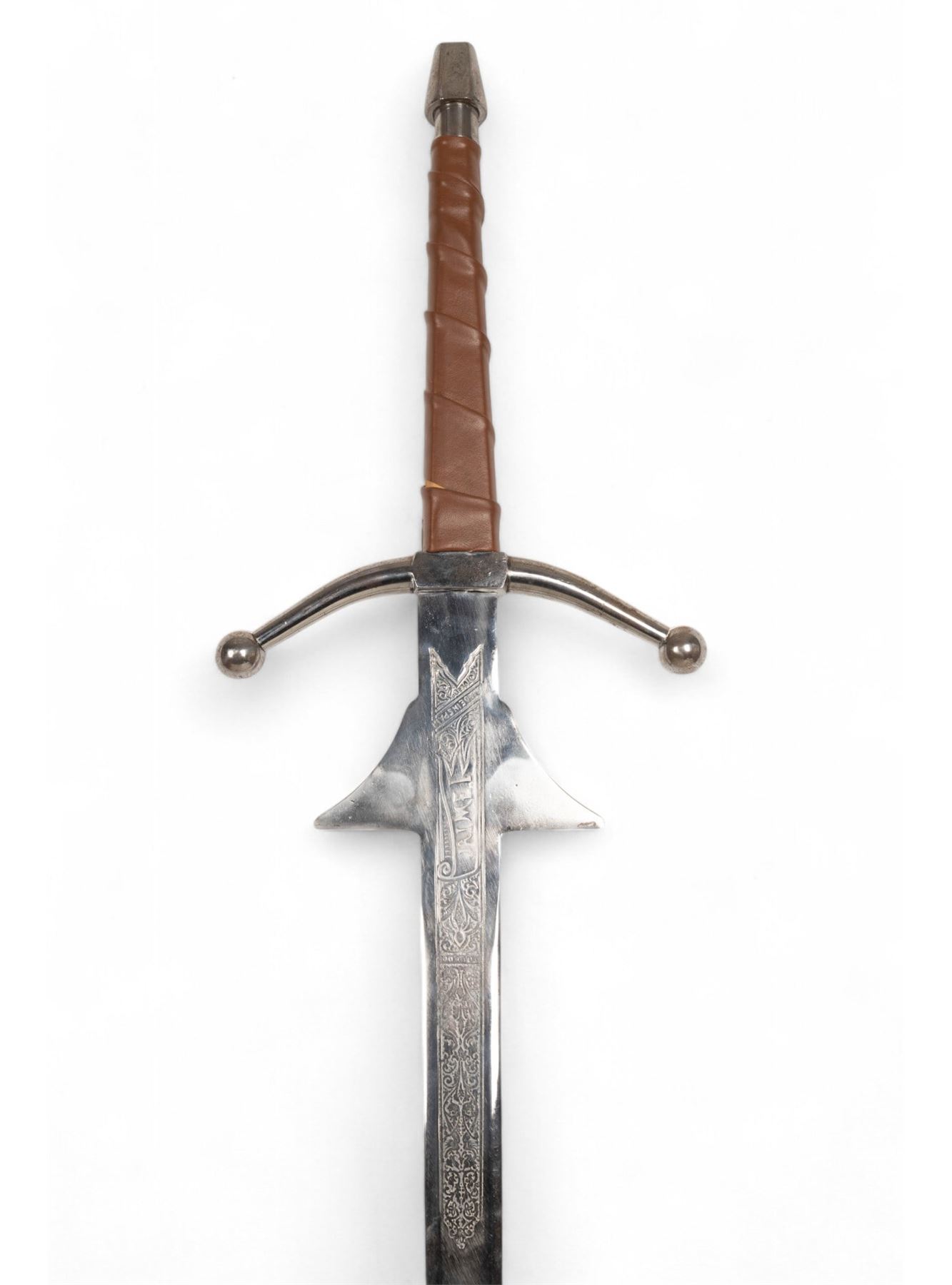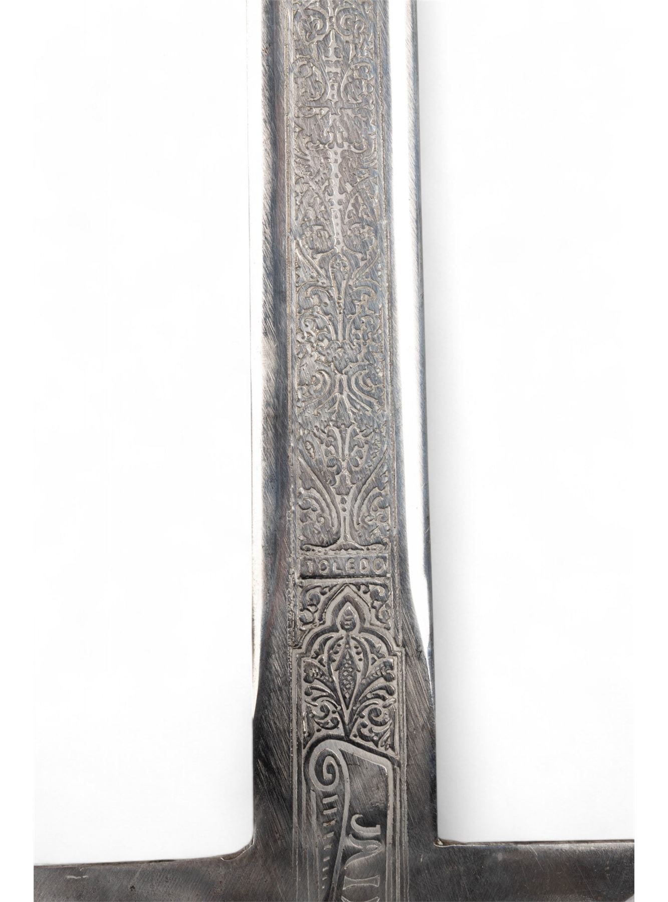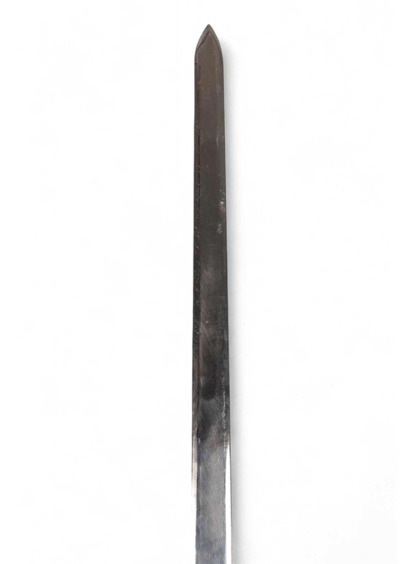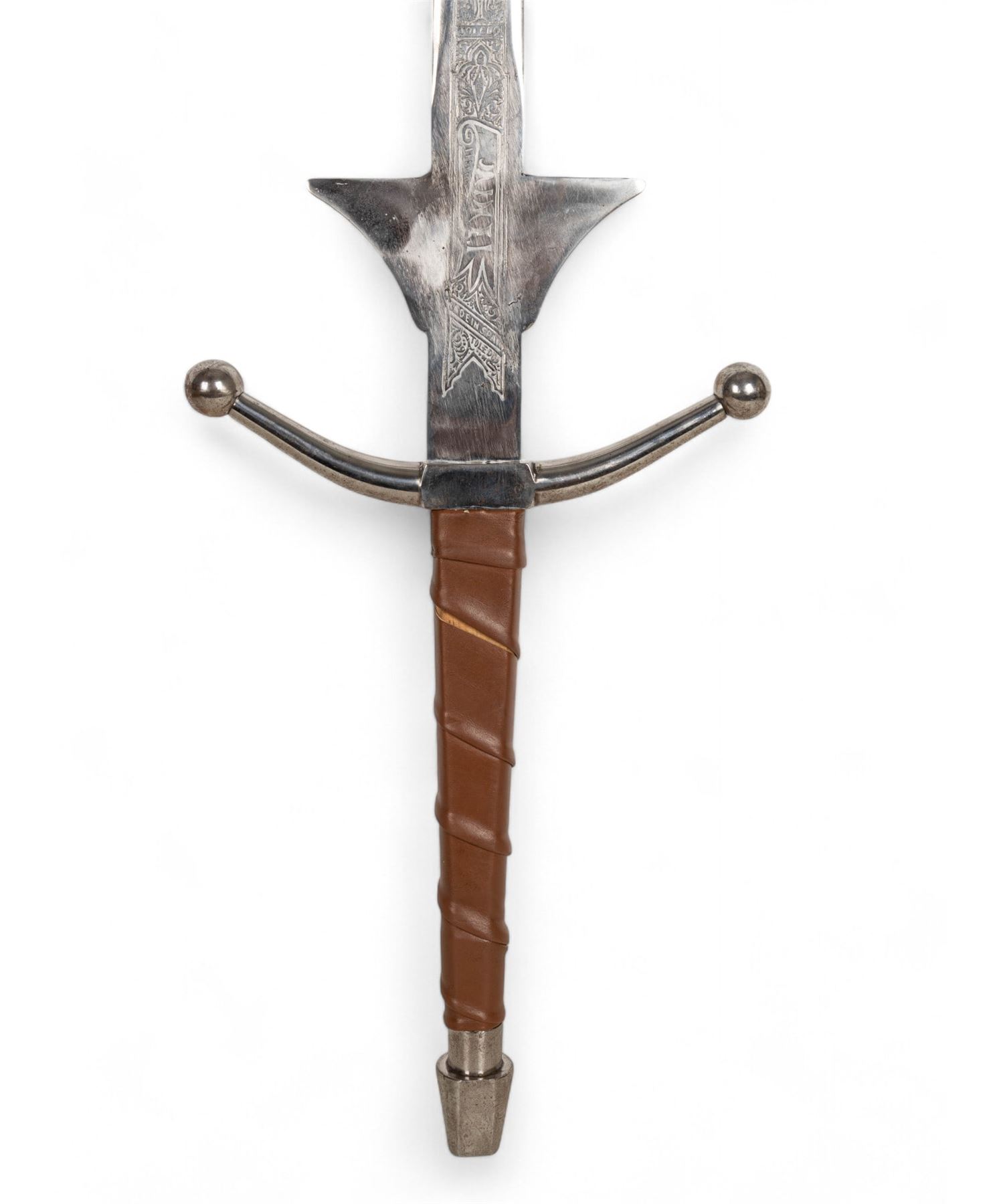 Jaime I decorative sword marked "Made in Spain - Toledo" with blade approx. 38" L and 50" total. Blade has etched designs and some oxidation on metal; handle is wrapped in brown leather. Unmarked Scottish officer's sword with metal scabbard and hand crafted guard accents measuring approx. 44" L.