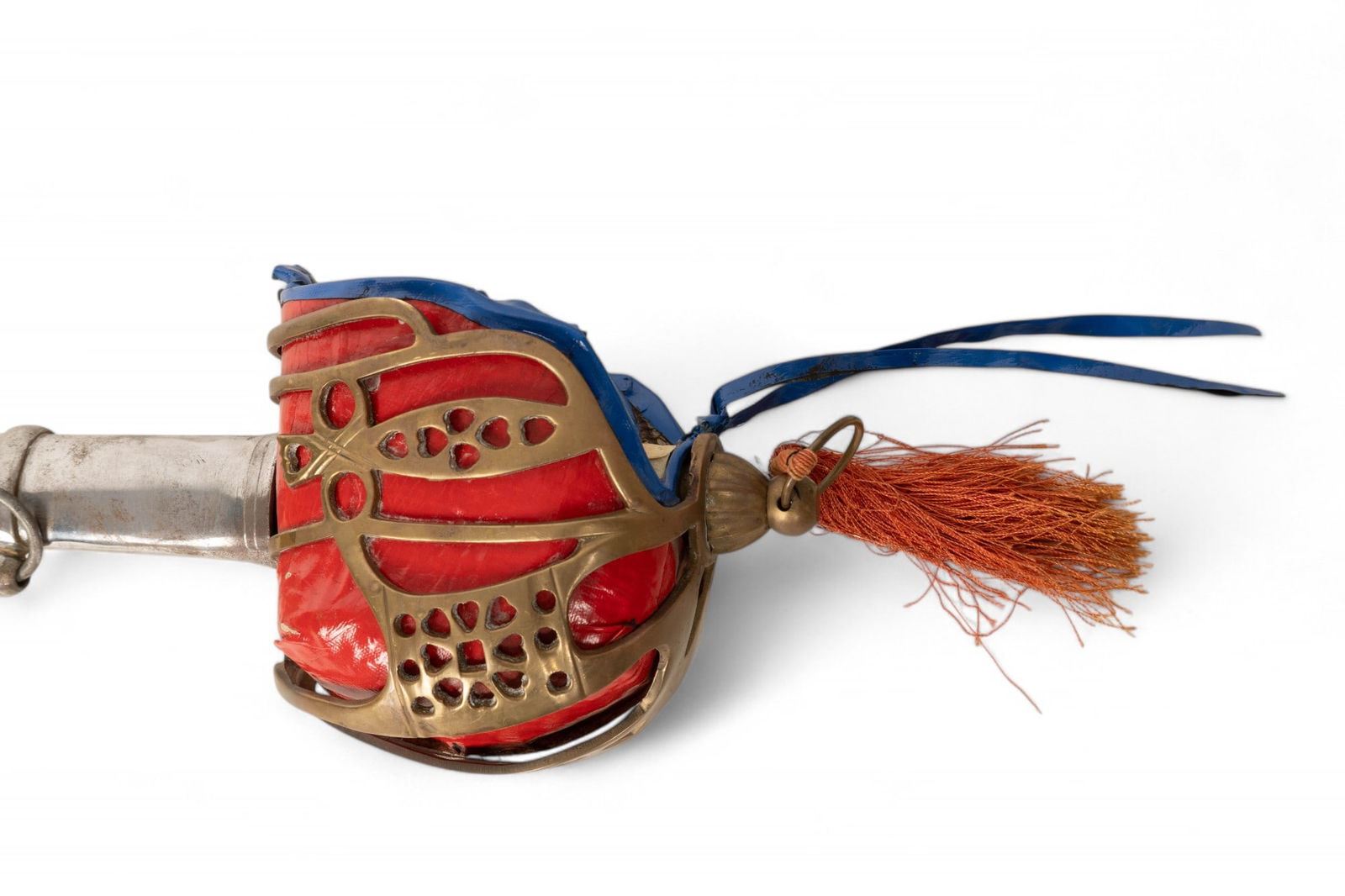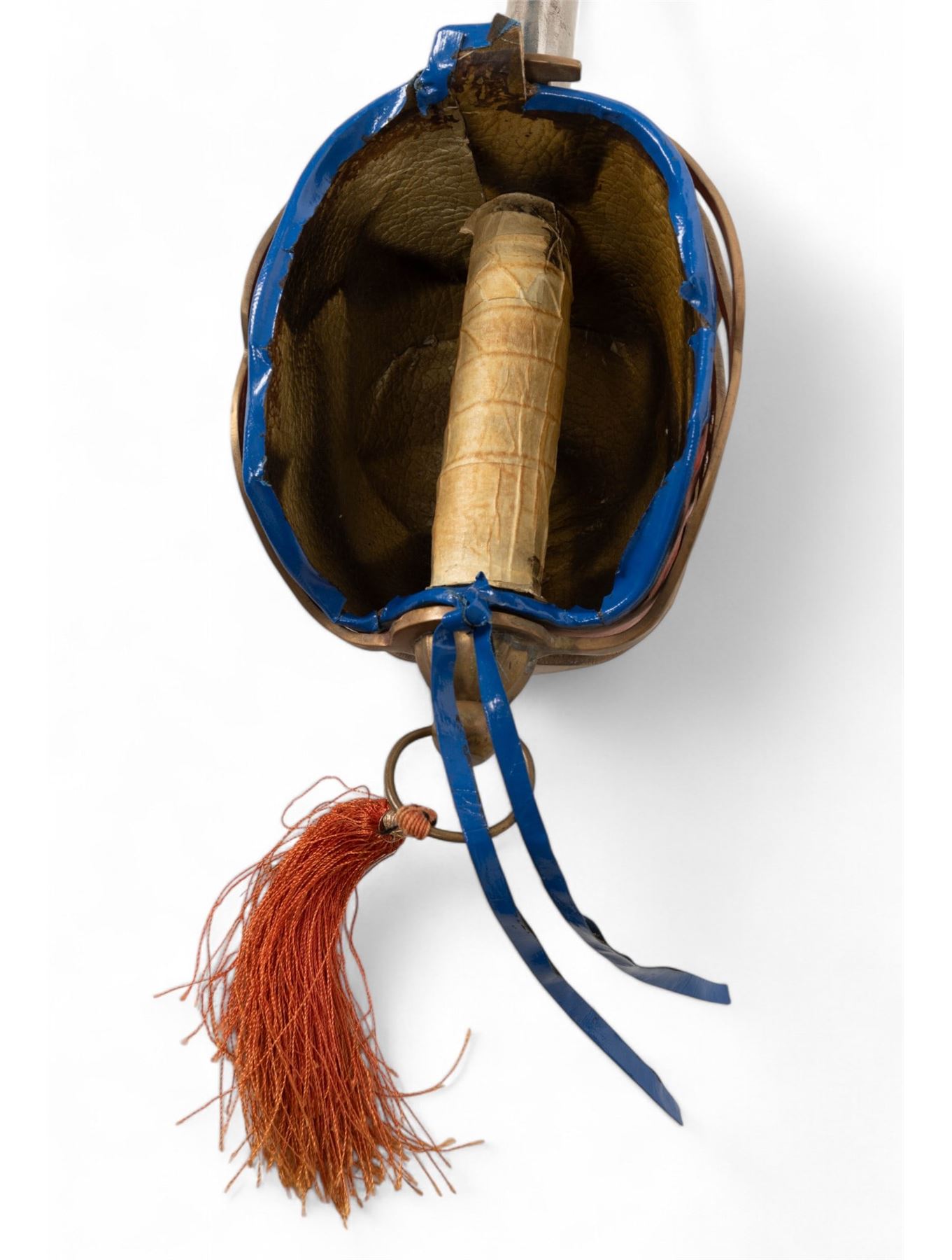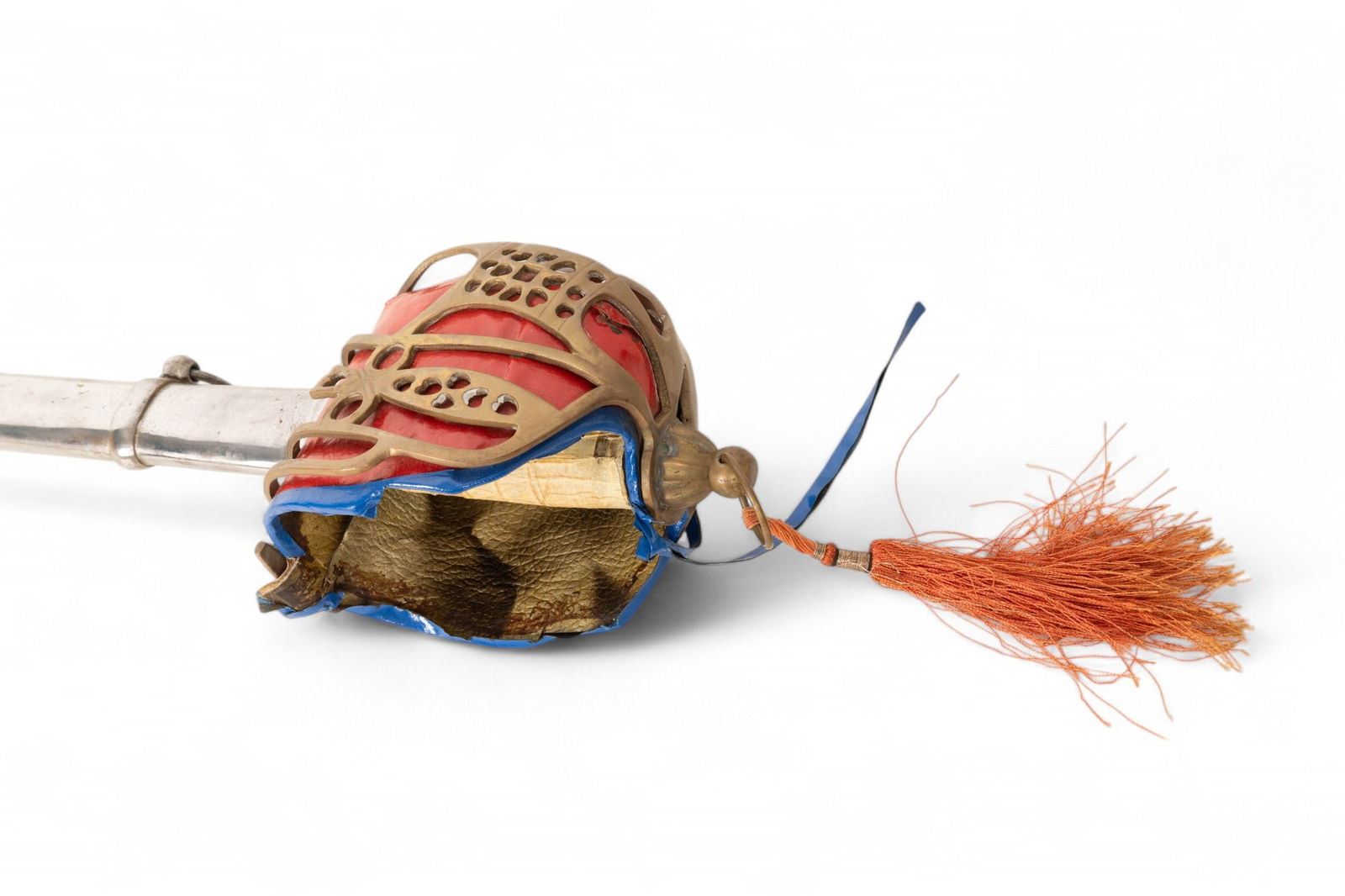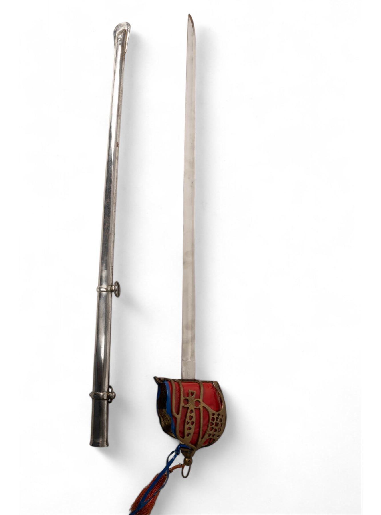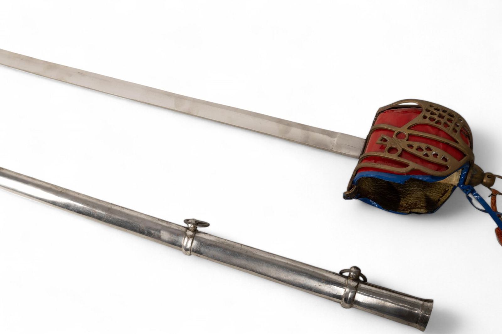 Jaime I decorative sword marked "Made in Spain - Toledo" with blade approx. 38" L and 50" total. Blade has etched designs and some oxidation on metal; handle is wrapped in brown leather. Unmarked Scottish officer's sword with metal scabbard and hand crafted guard accents measuring approx. 44" L.