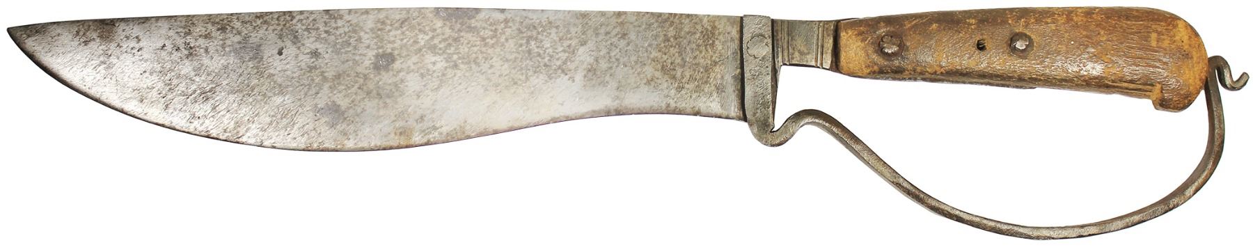 Spanish colonial side knife with "D" guard, late 1700s. 324 grams, 15" overall length, 9" blade length. Hand-forged knife (with forge marks clearly visible) typical of the Spanish frontier (found in Mexico) in a simple design with D-guard secured to blade by forged rivet, decoration on end, simple wood grips with file decoration on tang, the metal bright with some age toning, very few pitted areas, still very sharp. Pedigreed to our Auction #18, with original lot-tag #1219, and pedigreed to the Stuart Auerbach collection (see lot 4).