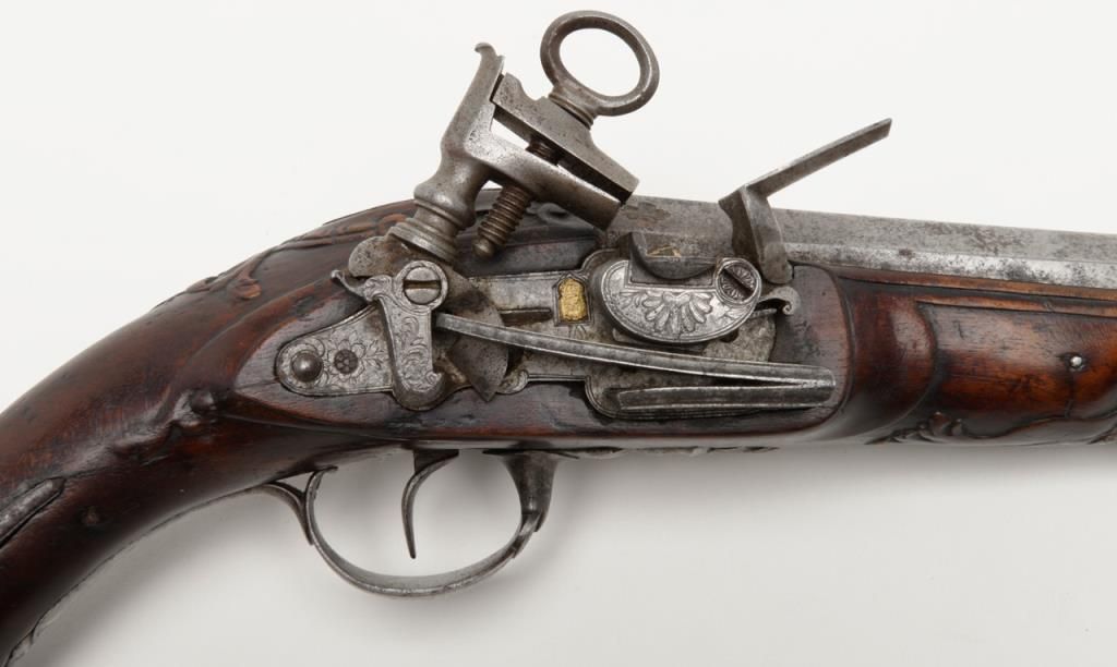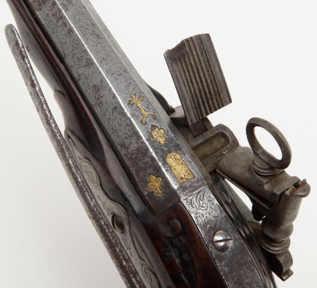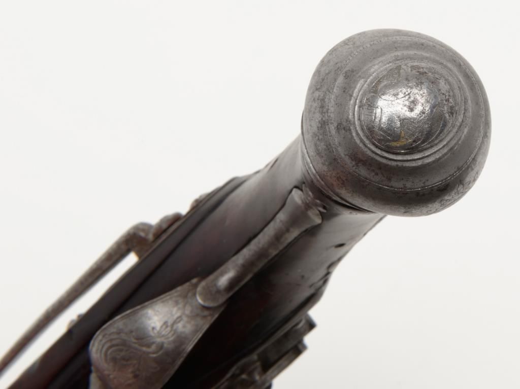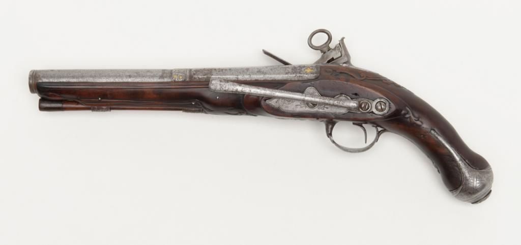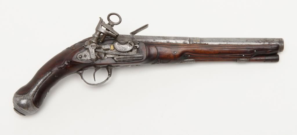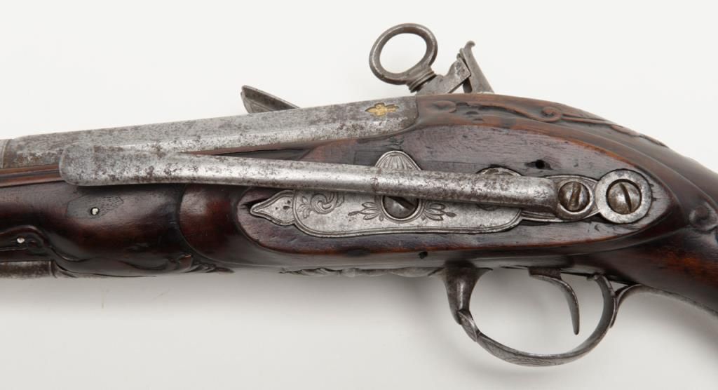 Spanish flintlock pistol circa 18th century showing Hallmarked barrel by Bustindui and the lock showing heart Hallmarks and the initials “G.A. B.O.” The pistol measures 16” overall with 9 ½” barrel of .70 caliber smoothbore. The barrelshows good Spanish quality with turned rings and engraving with small areas of gold inlay still intact. The mounts are lightly engraved and the metal shows some cleaning which is aging back to patina with some minor pitting. The stock is ingood condition also showing some light refreshing and minor cleaning. An old wooden ramrod is included and the original belt hook is retained. Spanish flintlock pistols of this era were carried to the Americas in the colonial era and even used in the southwest and early California. Est.: $1500-$3000