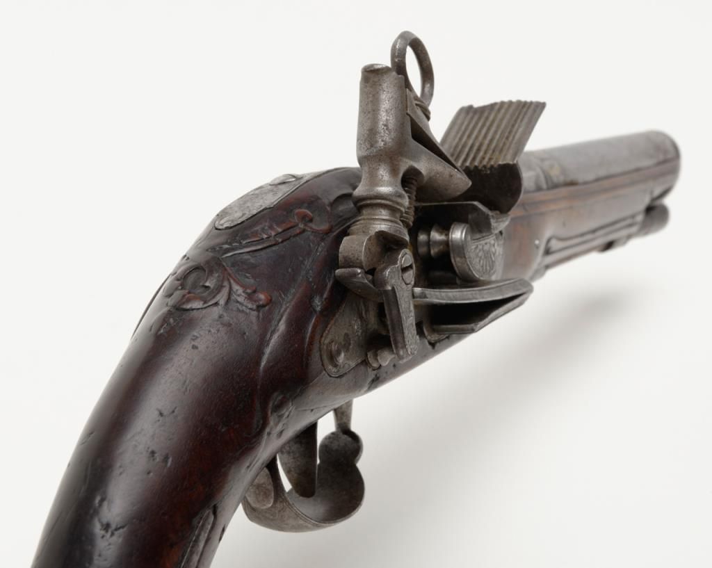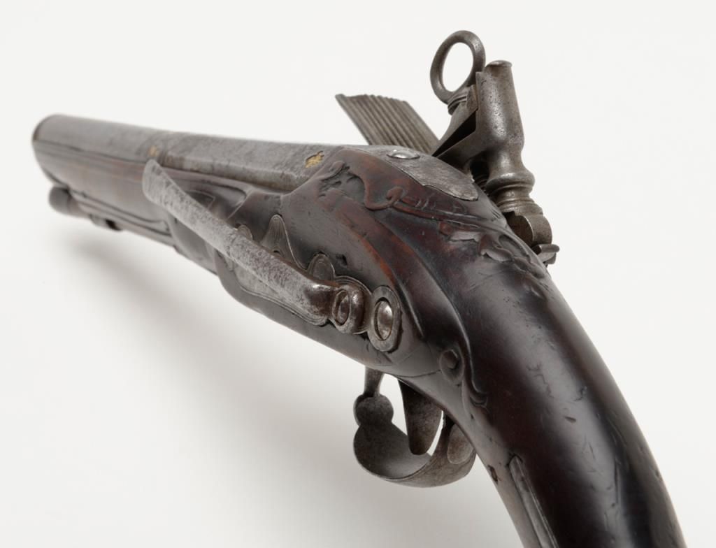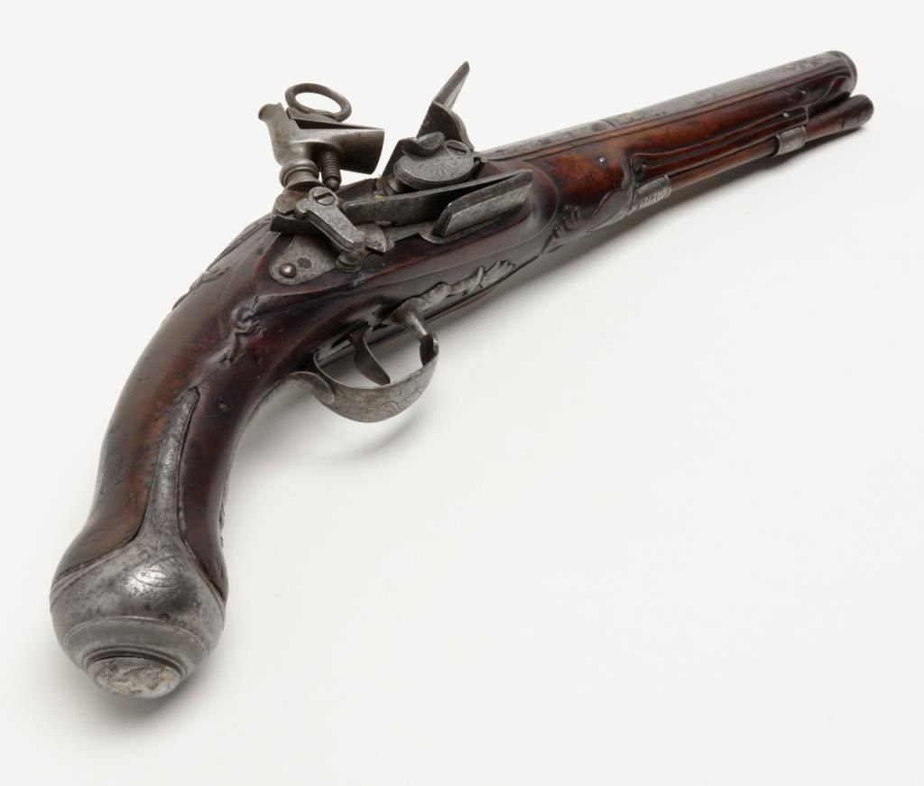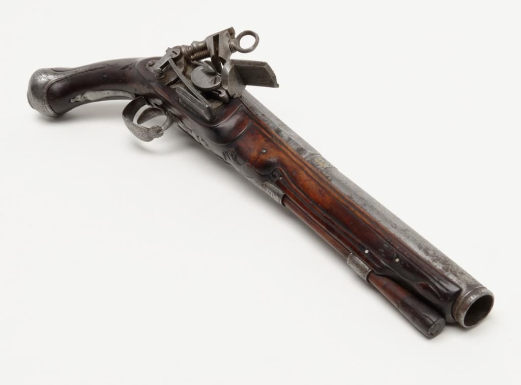 Spanish flintlock pistol circa 18th century showing Hallmarked barrel by Bustindui and the lock showing heart Hallmarks and the initials “G.A. B.O.” The pistol measures 16” overall with 9 ½” barrel of .70 caliber smoothbore. The barrelshows good Spanish quality with turned rings and engraving with small areas of gold inlay still intact. The mounts are lightly engraved and the metal shows some cleaning which is aging back to patina with some minor pitting. The stock is ingood condition also showing some light refreshing and minor cleaning. An old wooden ramrod is included and the original belt hook is retained. Spanish flintlock pistols of this era were carried to the Americas in the colonial era and even used in the southwest and early California. Est.: $1500-$3000