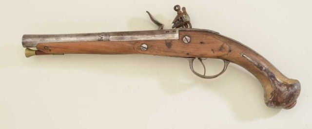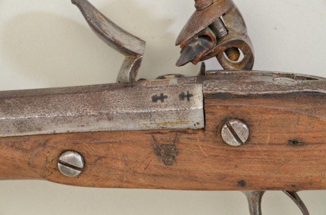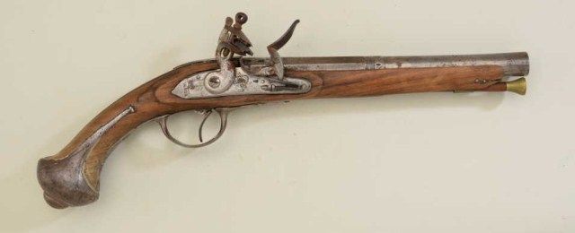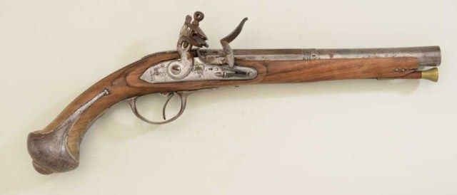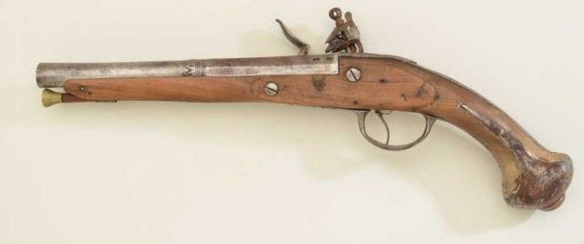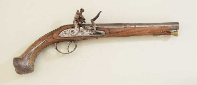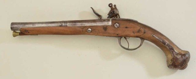 Spanish flintlock pistol with old period replaced British lock showing Tower arsenal marks and broad head proof. The pistol measures 17” overall with 9-3/8” barrel of approx. .64 caliber smoothbore. The metalsurfaces are good with light rust; the stocks have been cleaned and repaired and are dried out. The breech end of the barrel shows typical Spanish inlays and maker’s mark “PA over CA over MS”; a correct style ramrod isincluded; in need of slight restorations. Est.: $400-$800.