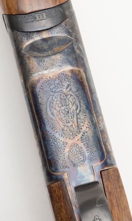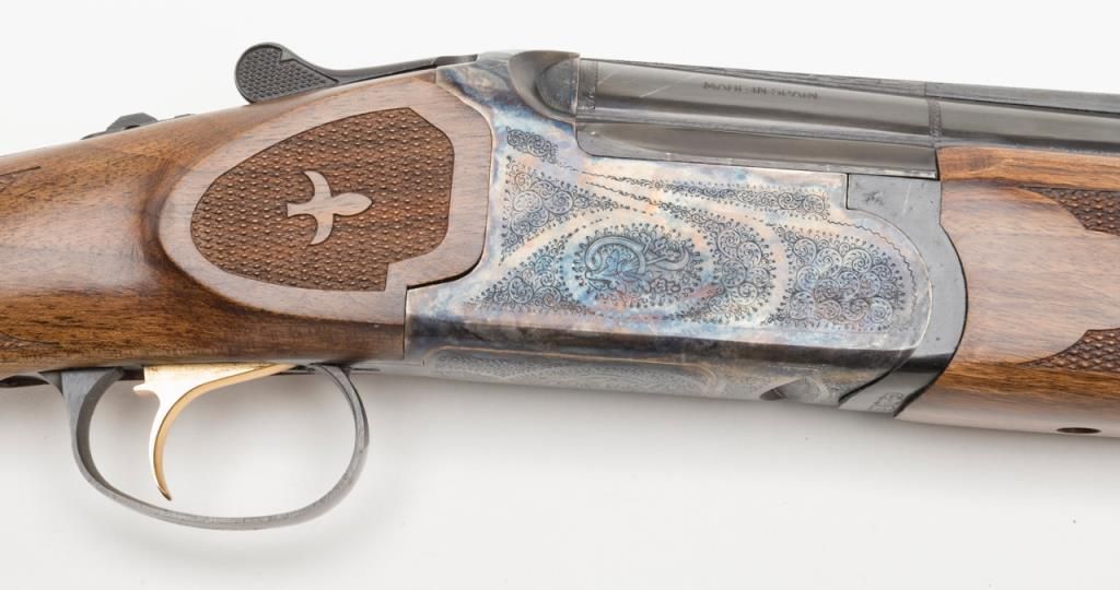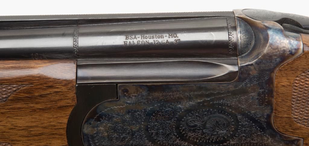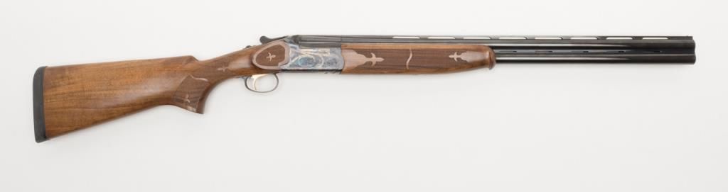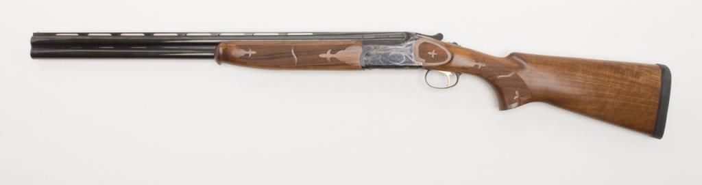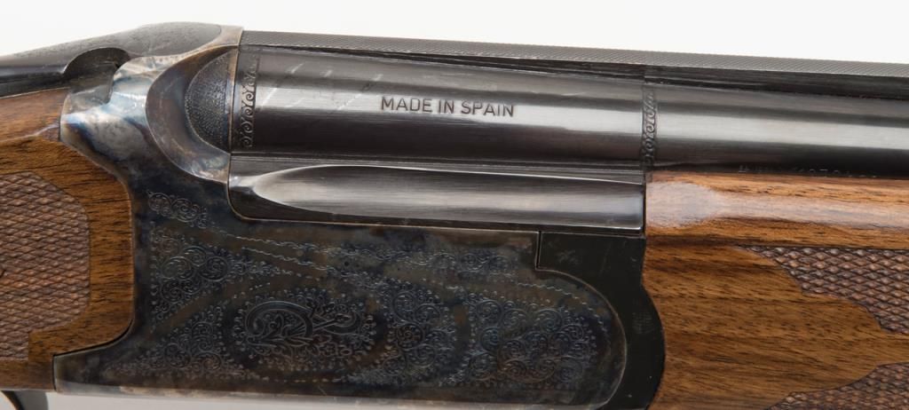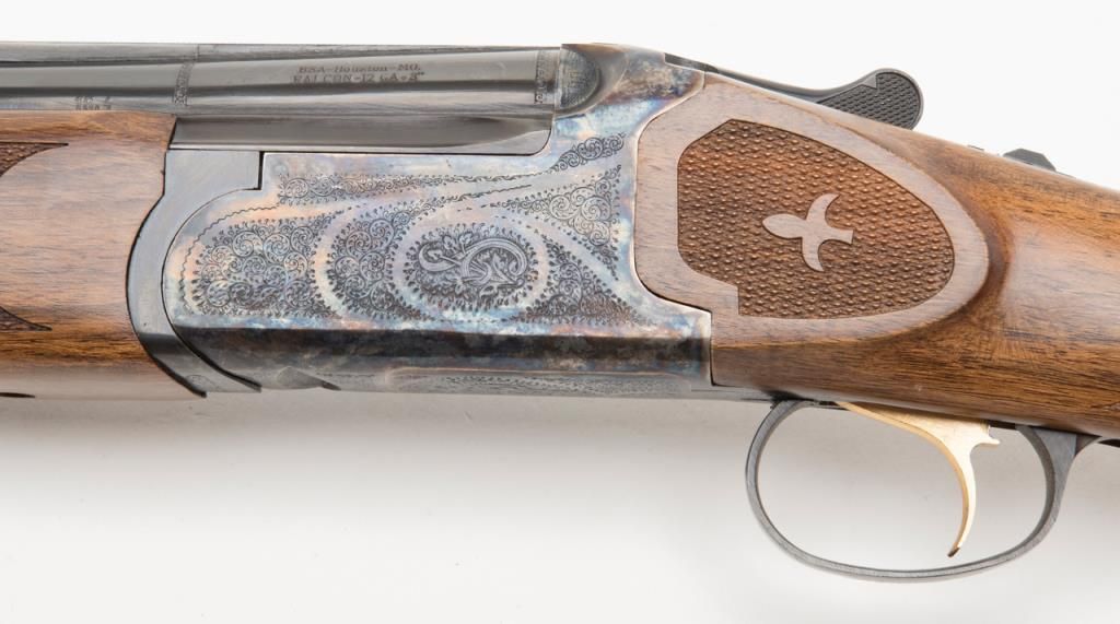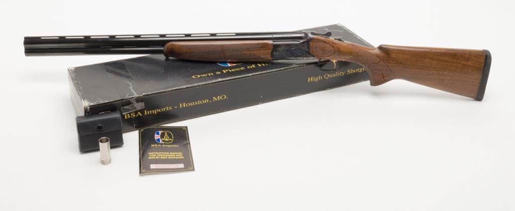 Spanish-made BSA Imports O/U shotgun, 12 gauge, 26” ventilated rib barrels with screw in chokes and extra choke, auto ejectors, blue and case hardened finish, engraved receiver, deluxe checkered wood stocks, single gold trigger, hardrubber butt pad, length of pull from trigger to end of butt pad is 14-1/2”, serial #60-03-4861 03. This gun is in like new condition showing little use or handling; accompanied by instructions manual and factory cardboard two piece box.(Modern). Est.: $600-$1,200.