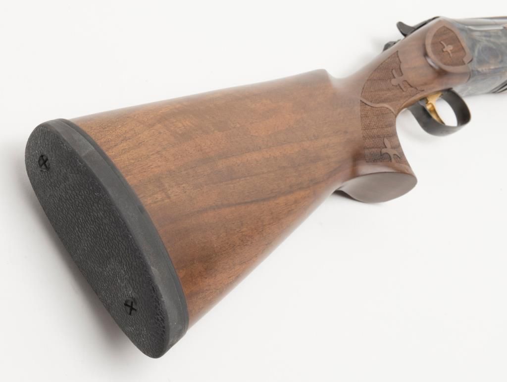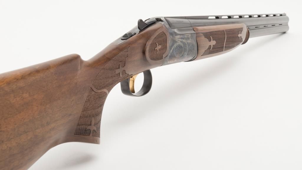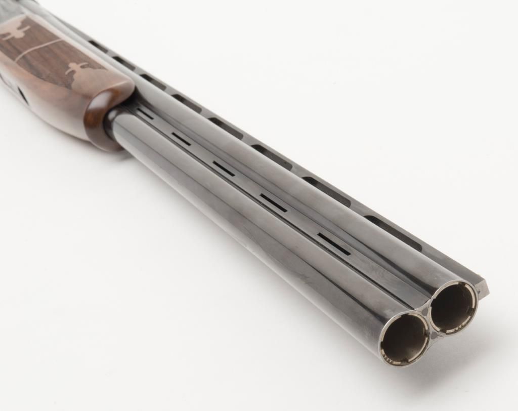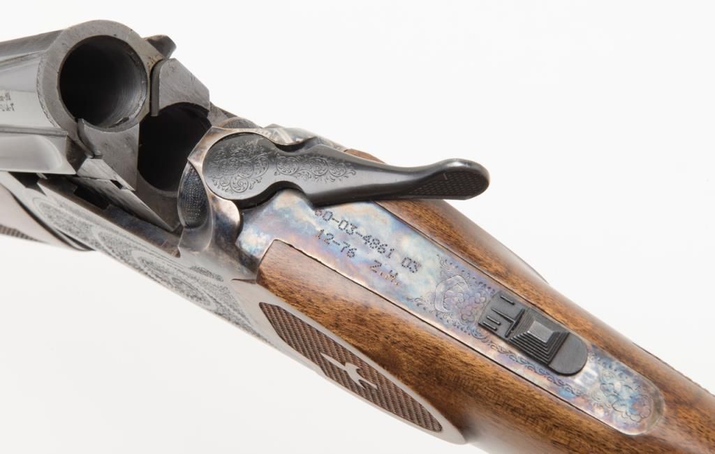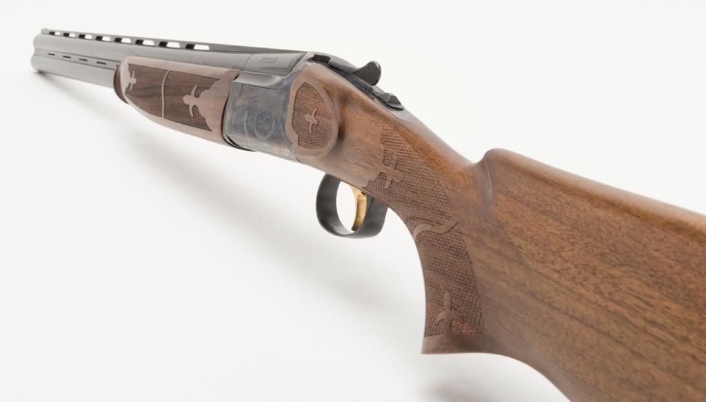 Spanish-made BSA Imports O/U shotgun, 12 gauge, 26” ventilated rib barrels with screw in chokes and extra choke, auto ejectors, blue and case hardened finish, engraved receiver, deluxe checkered wood stocks, single gold trigger, hardrubber butt pad, length of pull from trigger to end of butt pad is 14-1/2”, serial #60-03-4861 03. This gun is in like new condition showing little use or handling; accompanied by instructions manual and factory cardboard two piece box.(Modern). Est.: $600-$1,200.