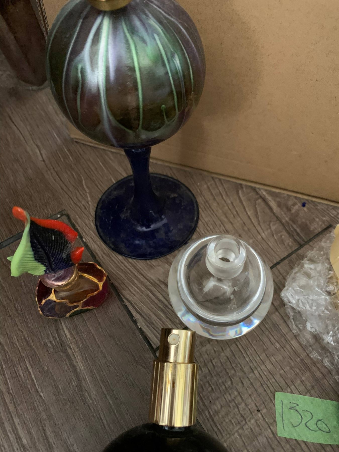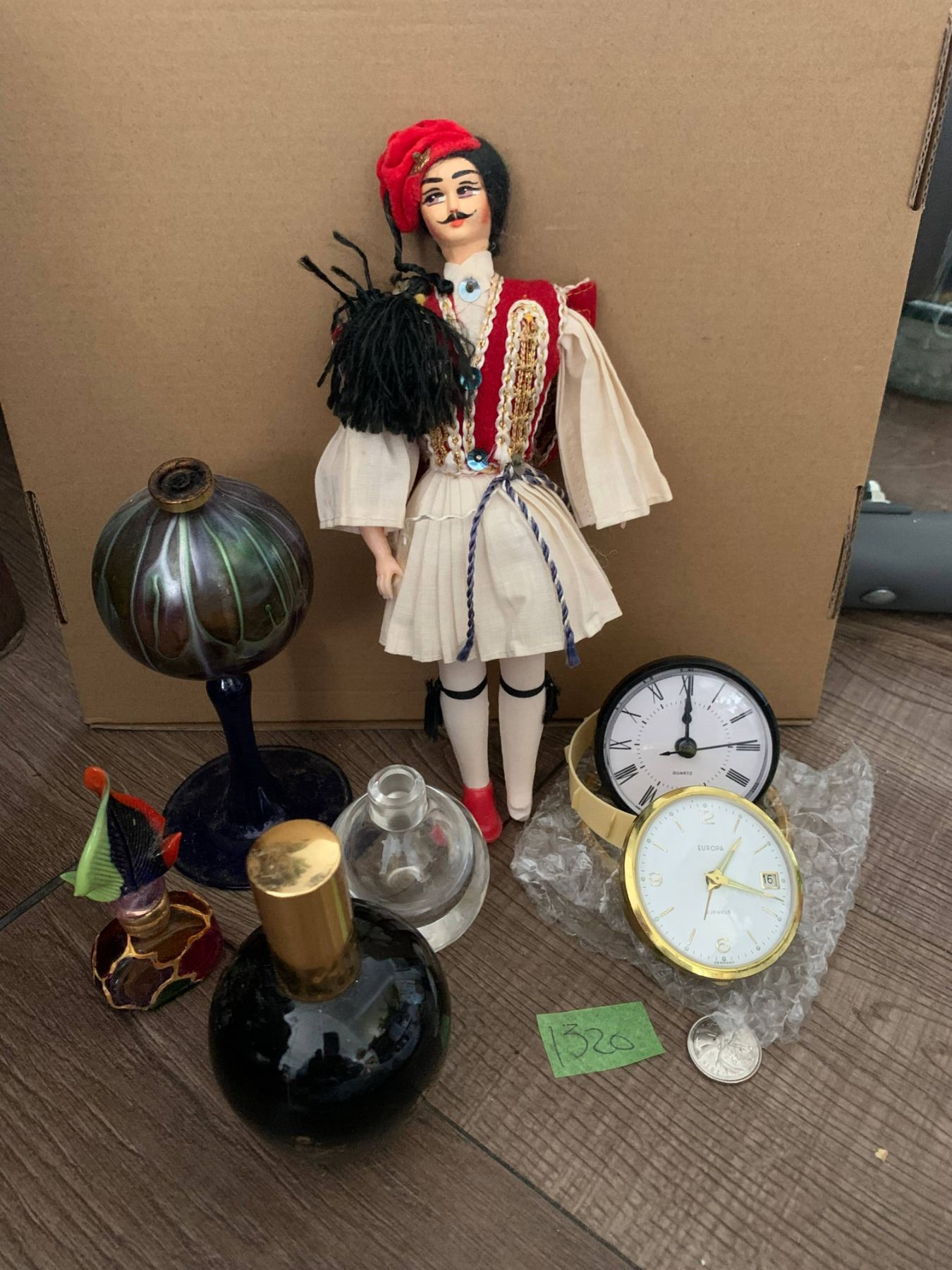 Spanish matador, three perfume holders, two replacement clocks - black one is new and never used the other is a wind up clock