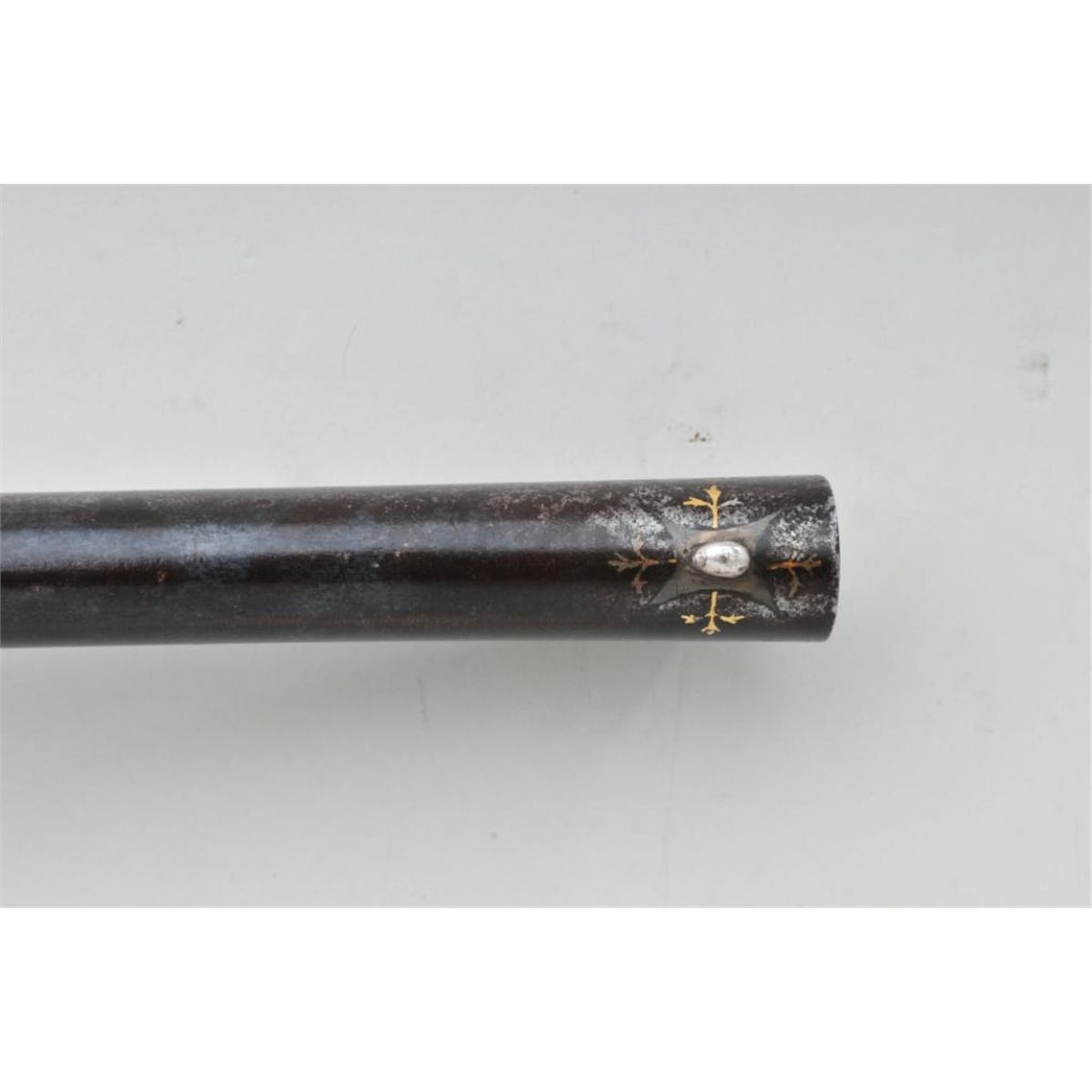 Spanish miquelet flintlock sporting shotgun, approx. 16ga, 35” barrel, 51” overall, half stocked, inlaid in gold “D. RRADURAS” in block letters on top of barrel. The breech shows full complement of maker’s stamps withgold inlays on breech, lock, and rear portion of lock. The gun shows a two-stage octagon to round barrel with good quality engraving and chiseling. The metal surfaces show a deep brown patina with scattered light tomoderate erosion. There is fancy gold and silver inlays around the front sight. The stock shows good checkering and classic Spanish styling. The gun is high quality throughout. The stock is good and would bevery good other than chips around the lockplate at the bottom edge and some losses of wood that are minor, could be restored. A correct to the period horn-tipped ramrod is included. The gun is very light and pointsbeautifully. Est: $2,000 - $4,000