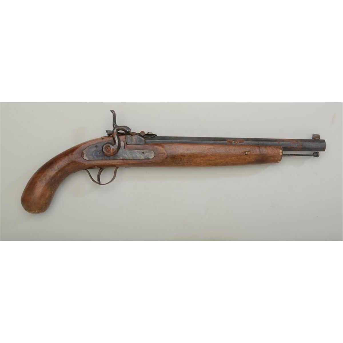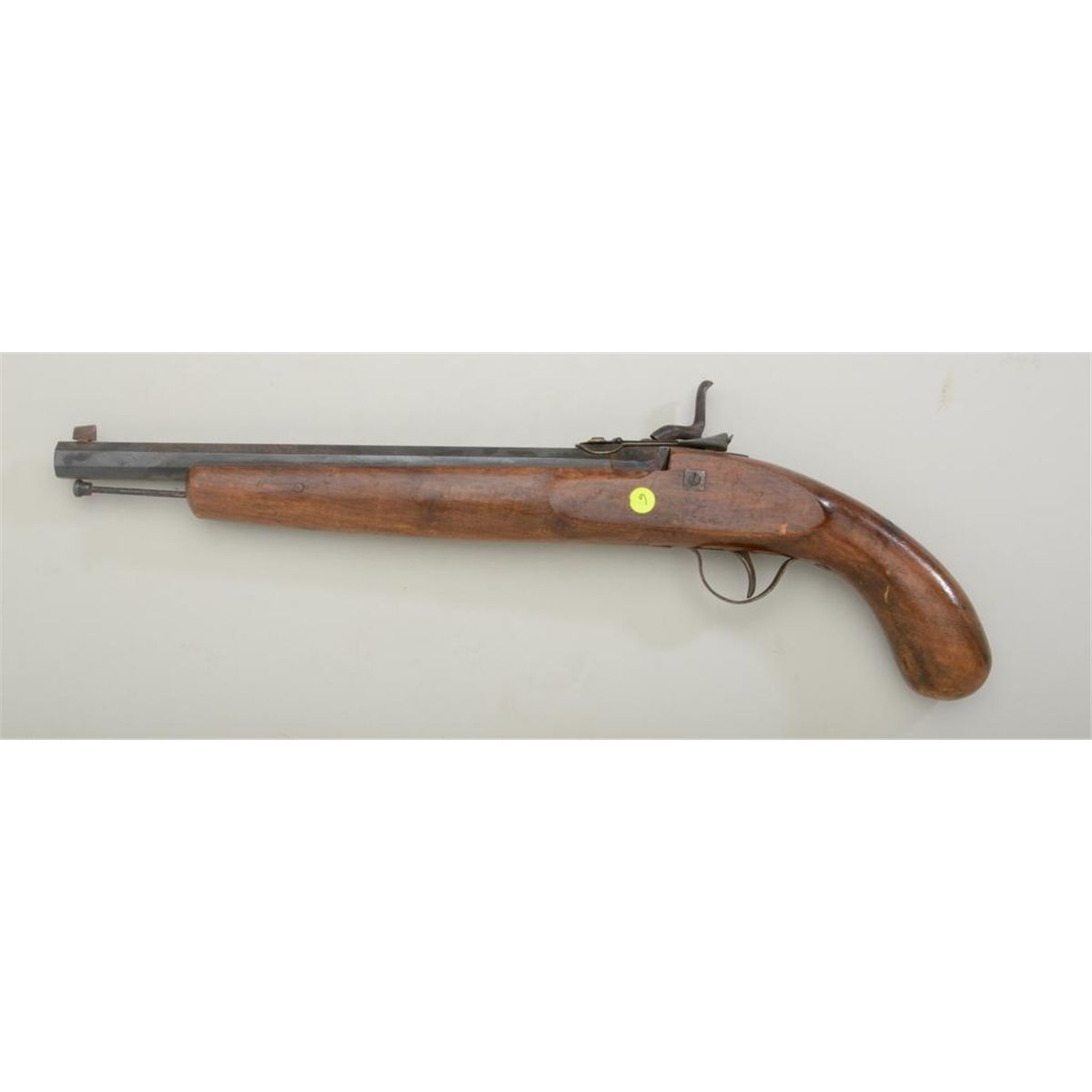 Spanish modern copy of a percussion single shot pistol, .52 cal., 12” barrel, blue and case hardened finish, wood stock, #14279. This gun is in overall good condition but stored poorly showing scattered surface rustareas; would benefit from a careful cleaning and oiling. Est.: $40-$80.
