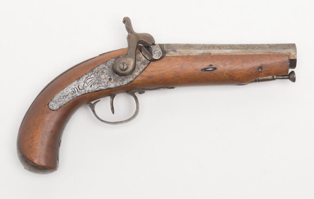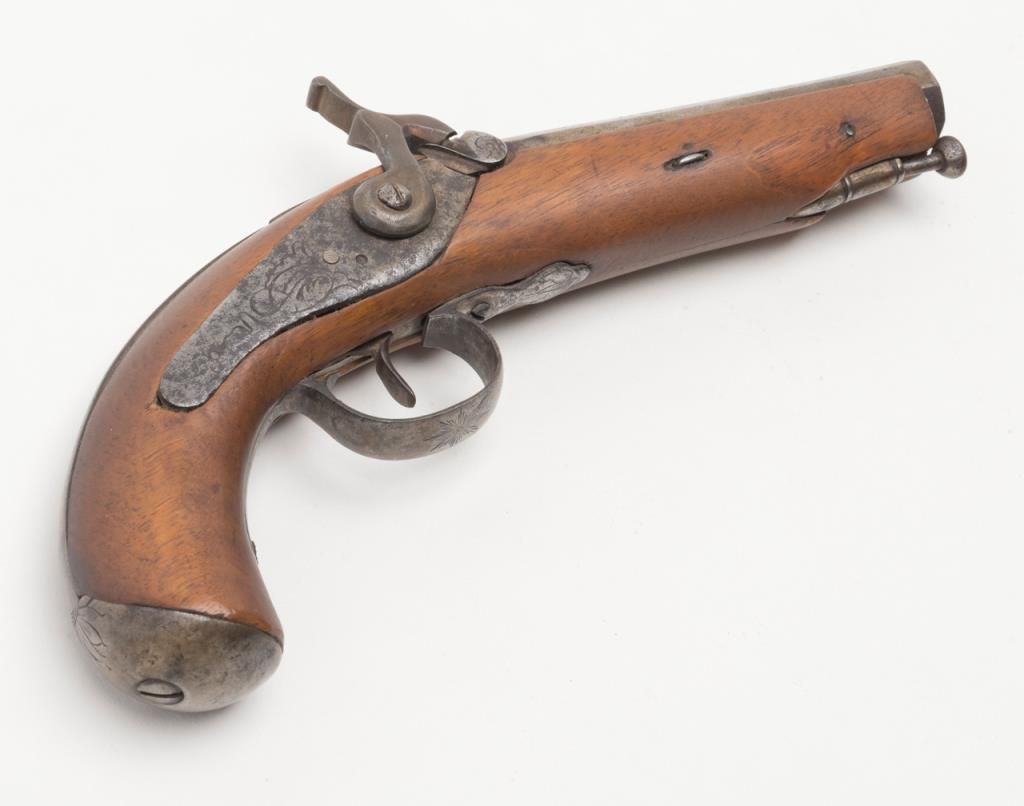 Spanish percussion single shot pistol, .69 cal., 5” octagon barrel, back action lock, re-stocked wood, iron ramrod, in overall good condition as re-stocked; good action, decorated barrel. (Antique). Est.: $225-$350.