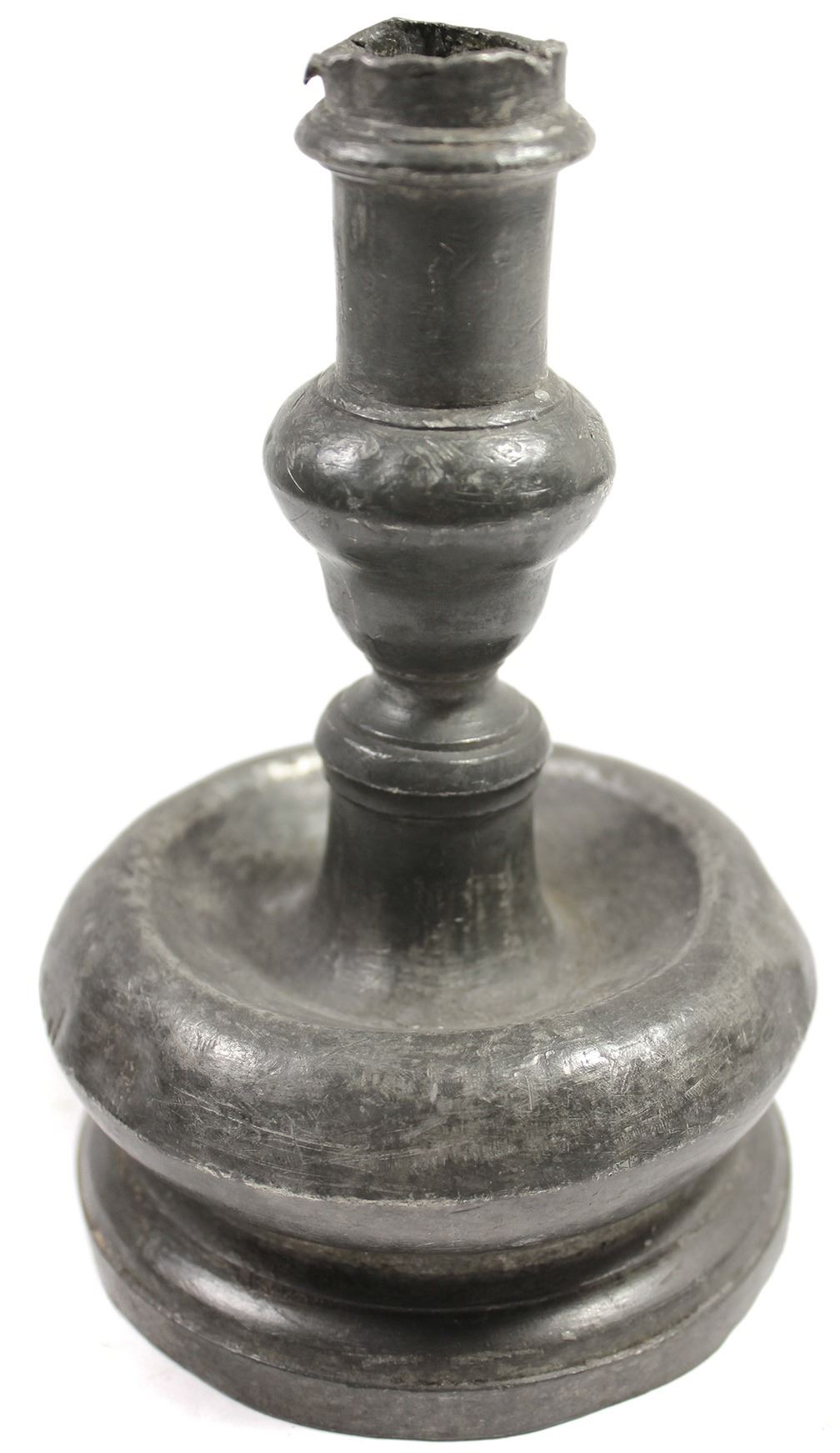 Spanish pewter candlestick holder, ca. 1680. 384 grams, 5-3/4" tall, 3-1/2" diameter. Hollow, bulbous pewter holder with scratches and dents to immortalize its long history. A simple and functional remnant of how life used to be lived.