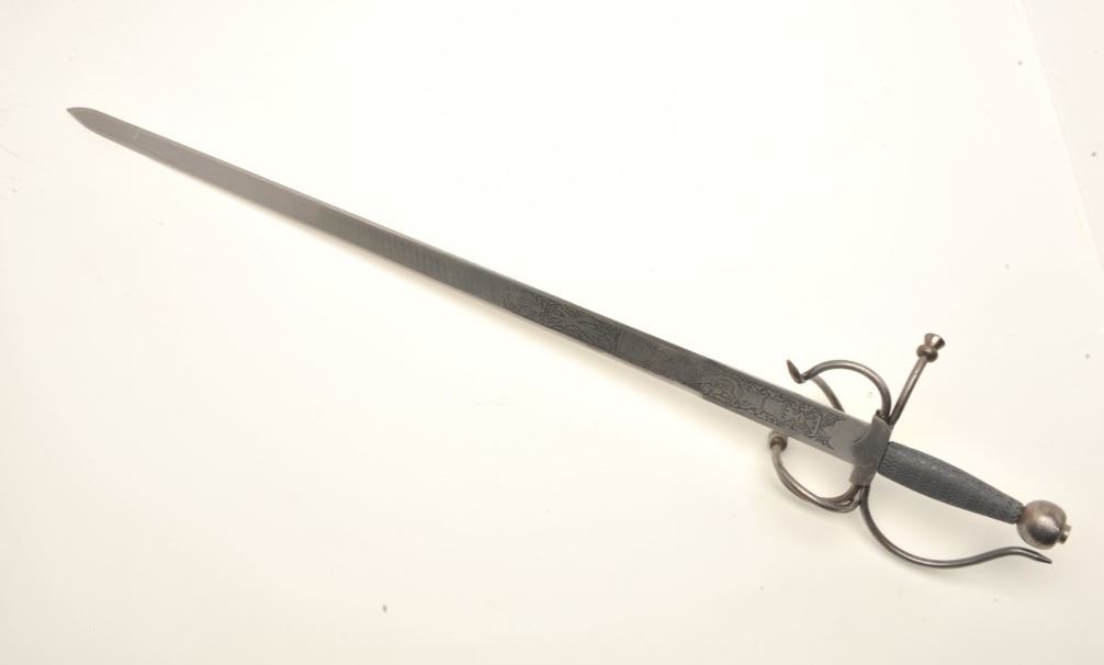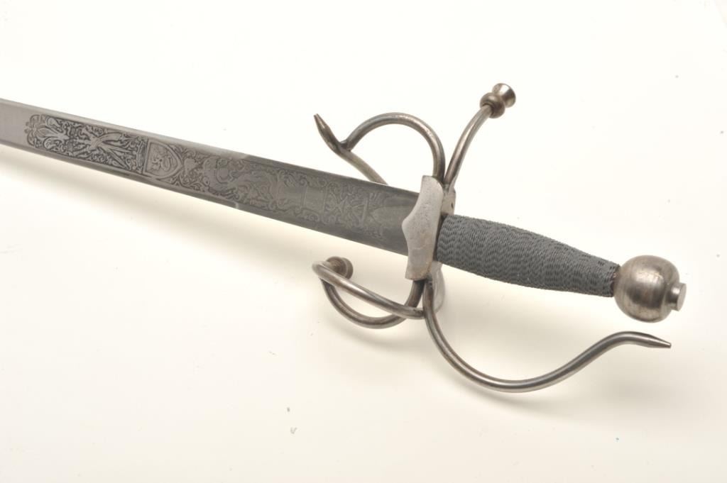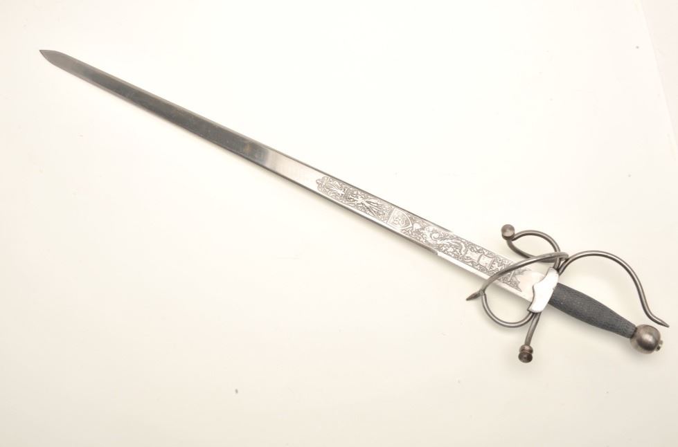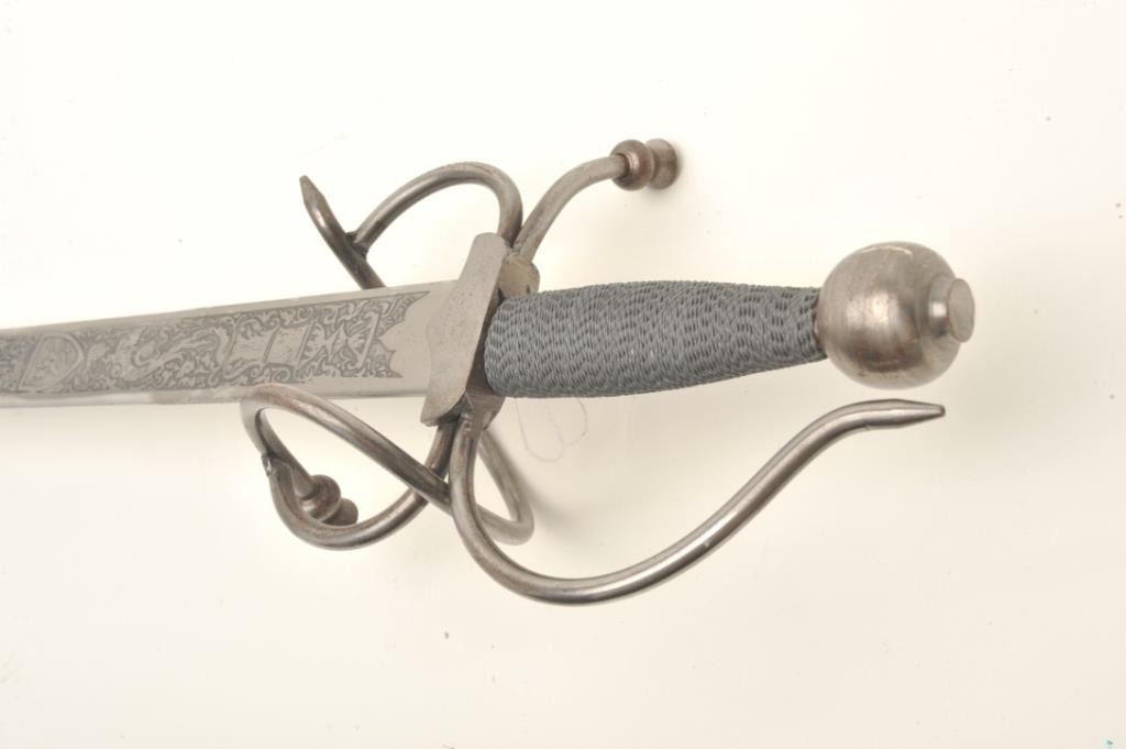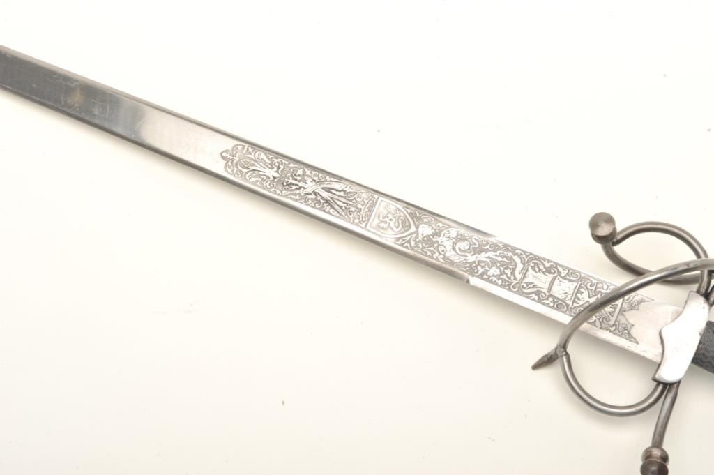 Spanish serpentine hilt sword, approximately 38” overall with a “Made in Spain”-marked and decorated blade. Est.: $125-$250.