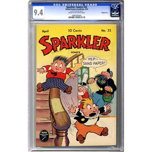 <B>Sparkler Comics #32 Double Cover (United Features Syndicate, 1944) CGC NM 9.4 Cream to off-white pages.</B></I> The top-ranked copy in CGC's census has one heck of a bonus in the form of a double cover. Our cover stars, the Captain and the Kids (aka the Katzenjammer Kids), are joined by Nancy, Tarzan, and others. CGC notes, "1st cover 9.4, interior cover 9.2." Overstreet 2006 NM- 9.2 value = $220. CGC census 4/06: 1 in 9.4, none higher.
