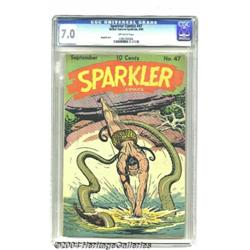 Sparkler Comics #47 (United Features Syndicate, 1945) CGC FN/VF 7.0 Off-white pages. The one and only Burne Hogarth makes a splash with this riveting cover. Of the two copies currently surveyed by CGC, this admirable specimen, with sharp corners and a sturdy spine, is breathing down the neck of the 7.5 copy ranked only slightly higher. Overstreet 2003 FN 6.0 value = $164; VF 8.0 value = $220. Important notice: Heritage usually auctions material at the rate of 200-250 lots per hour. On some occasions eBay Live bid software or the Internet may not be able to keep up with the pace of the auction. We recommend placing a realistic absentee bid now as insurance to avoid disappointment. Occasionally the auctioneer may eliminate or reject an eBay Live bid, and the auctioneer may also reopen a lot after the close of the eBay live bidding (usually because we missed an audience bid), and may reject your bid even if it shows you as the winning bidder. By bidding via eBay Live, you agree that Heritage may award the lot to another bidder at its sole discretion under the circumstances described above or any other reasonable circumstances. Since eBay bids are not shown to us until we open the lot on the floor, we treat those bids just like floor bids. In most cases the floor responds before the eBay bid is presented to us, due to Internet lag time, so for consistency we have made it a policy that floor bids are always considered first over tie eBay live bids. Also please note that all Heritage lots purchased through eBay Live carry a 20% Buyer's Premium. Please make sure you read the Terms and Conditions before you bid.