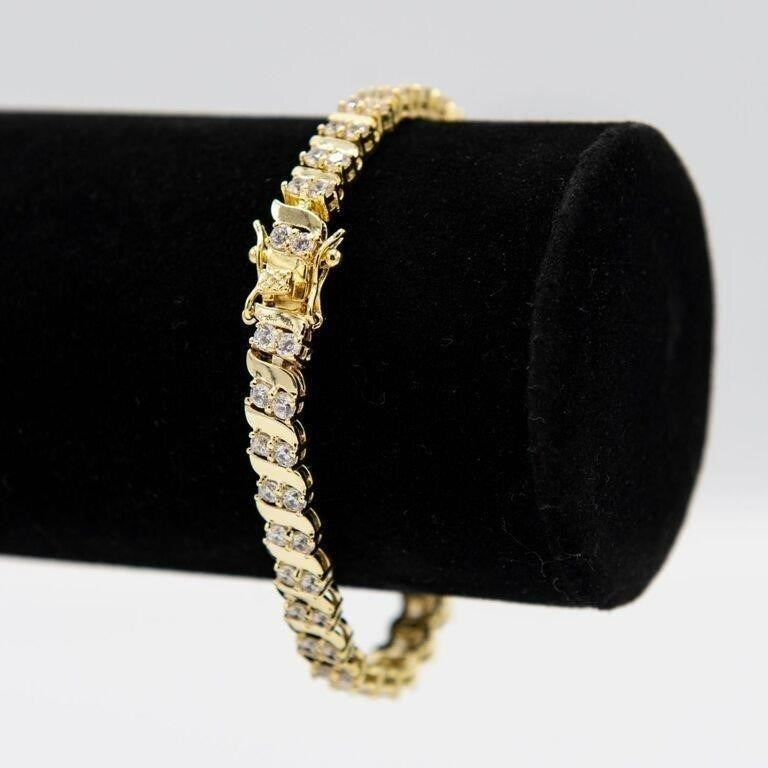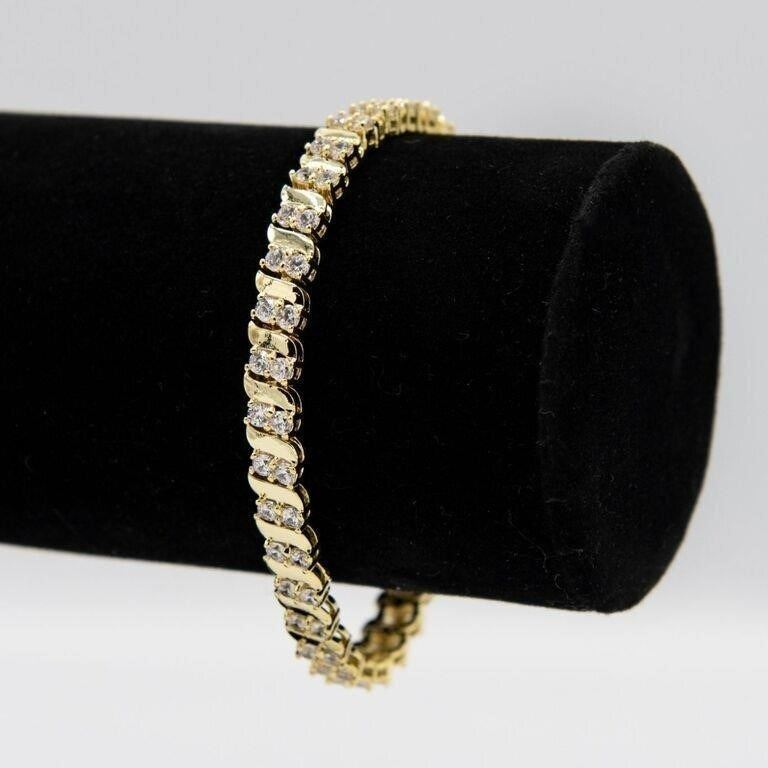 Ladies Sparkling 14 Kt Gold Plated Tennis Bracelet. These Lab Simulated Diamonds Are VVs1 Near Flawless and Mounted In 14 Kt Yellow Gold Overlay. Approx.7.0" Long And 14.5 Total Grams.