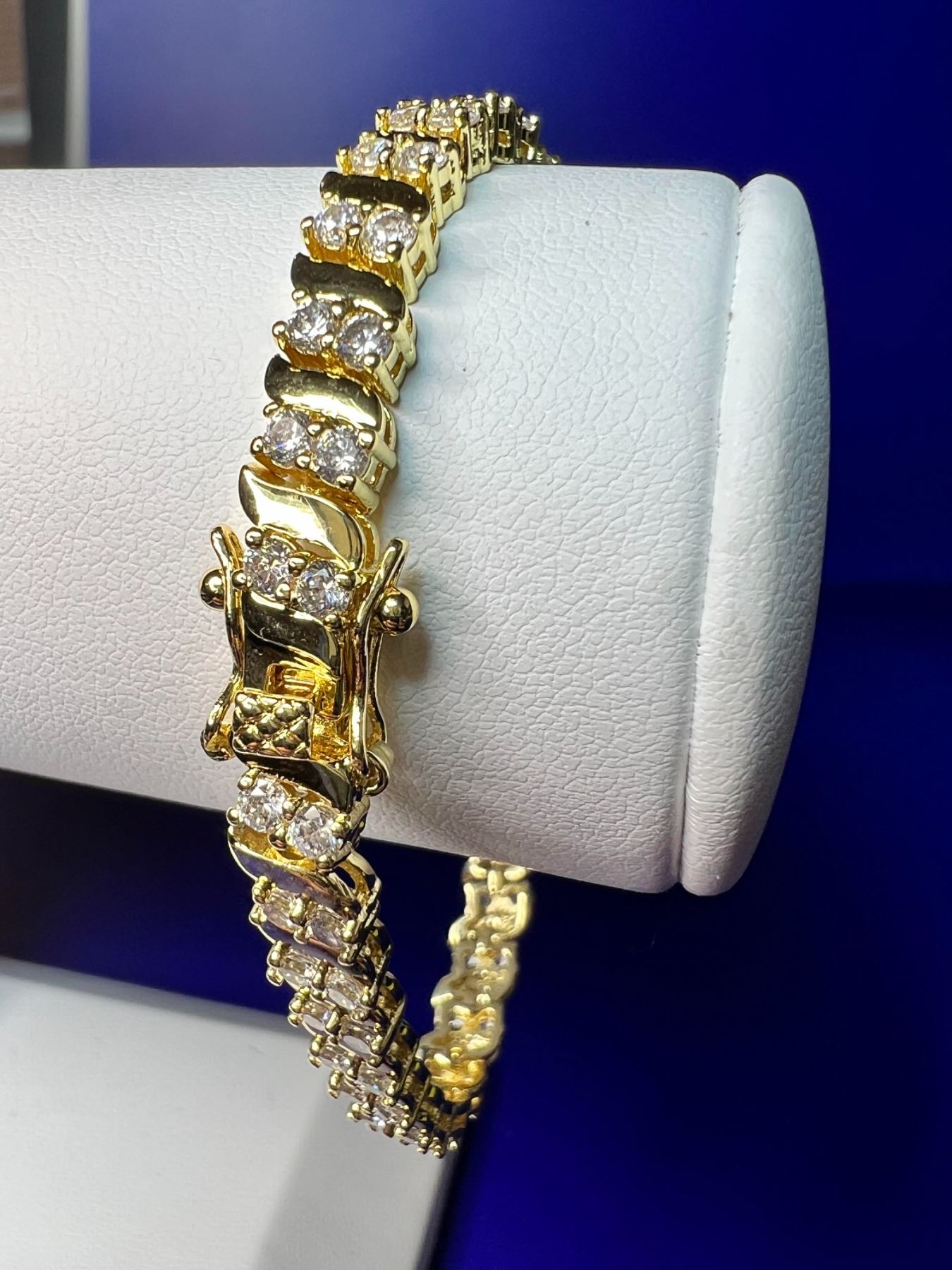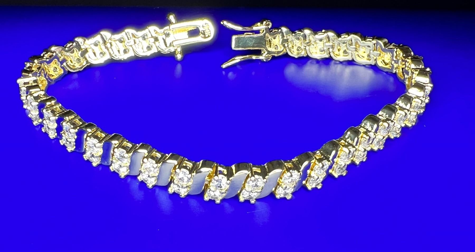 Ladies Sparkling 14 Kt Gold Plated Tennis Bracelet. These Lab Simulated Diamonds Are VVs1 Near Flawless and Mounted In 14 Kt Yellow Gold Overlay. Approx.7.0" Long And 14.5 Total Grams.