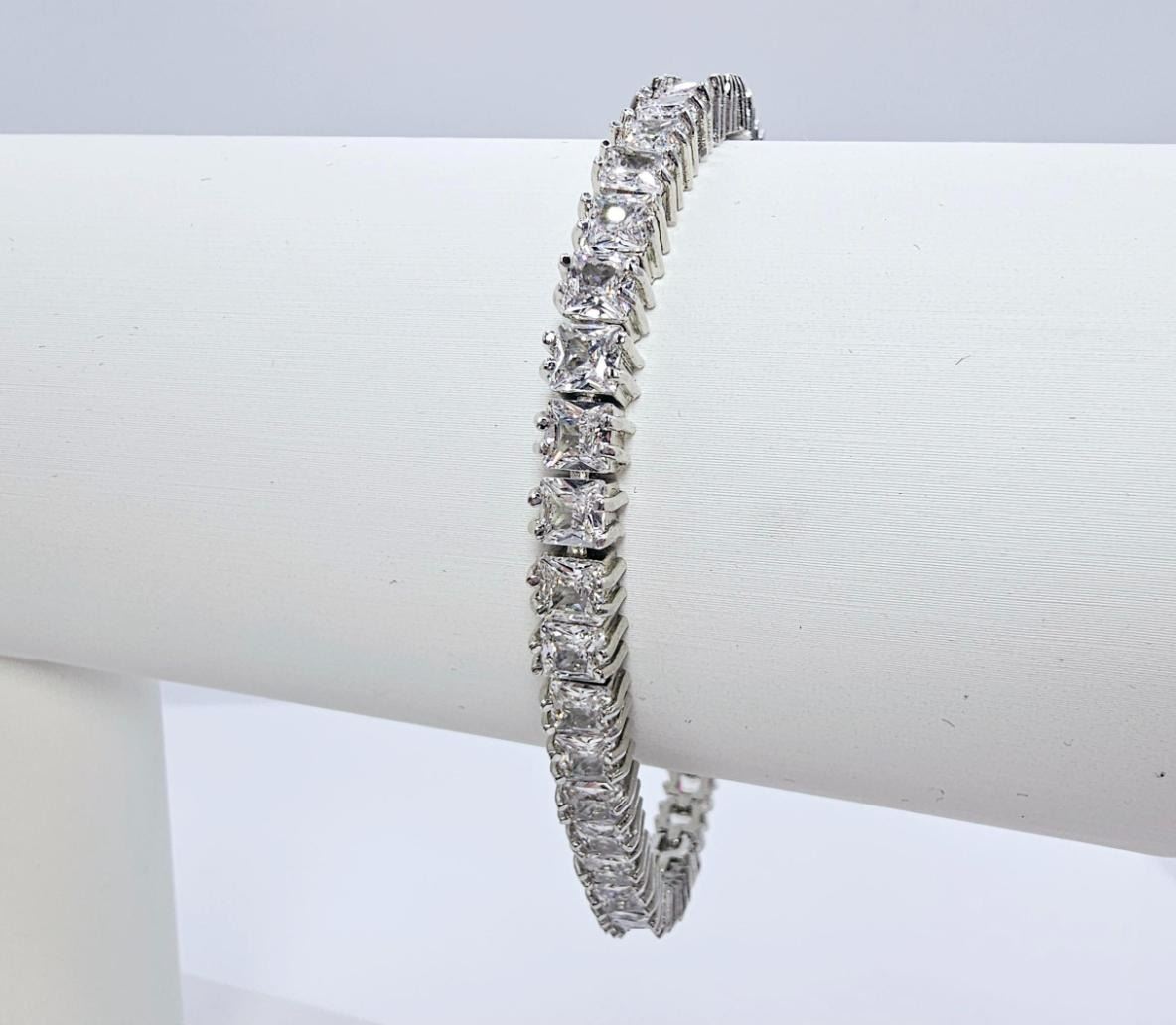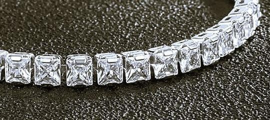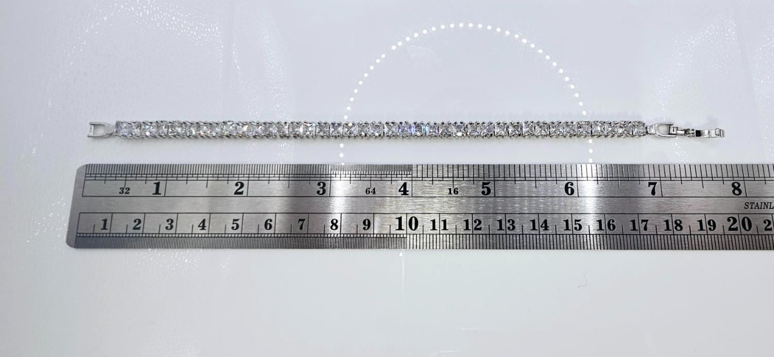 Sparkling 7.25 Ctw White VVs1 39 Stone Count Rare Princess Cut Lab Simulated Diamond Tennis Bracelet. These 39 Fine Gemstones are all Princess Cut measuring 5 mm They are eye-clean and mounted in tri-layered 14 Kt White Gold. Approx. 7.5" Long.16.7 Total Grams. Absolutely Stunning, Sporty and Classy all at the same time. Don't miss this one!!!