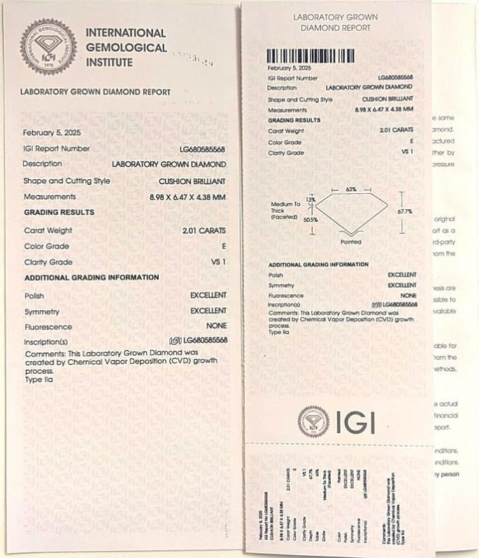 This IGI Certified 2.01 Ct VVS1 White E Lab Grown Diamond Is a Near Flawless Cushion Cut. It Measures 7 x 6.84 x 4.57 mm.. It is Bursting Out with a Full Spectrum of Colors. This Lab Grown Diamond has the Exact Chemical Compounds as a Mined From The Earth Diamond , So It Measures a Perfect 10 on the Mohs Hardness Scale . This Lab Grown Diamond will test positive for an earth mined diamond on any diamond tester. In addition the Lab Grown Diamond is Earth Friendly and Conflict Free, Not to mention it has all the beauty and characteristics of a natural diamond at only a fraction of the cost. The Lab Grown Diamond Really Is A "Brilliant Choice" !!!