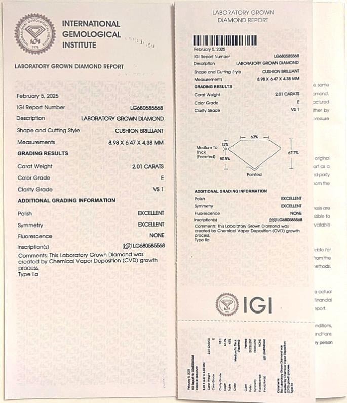 This IGI Certified 2.01 Ct VVS1 White E Lab Grown Diamond Is a Near Flawless Cushion Cut. It Measures 8.98 x 6.47 x 4.38 mm. It is Bursting Out with a Full Spectrum of Colors. This Lab Grown Diamond has the Exact Chemical Compounds as a Mined From The Earth Diamond , So It Measures a Perfect 10 on the Mohs Hardness Scale . This Lab Grown Diamond will test positive for an earth mined diamond on any diamond tester. In addition the Lab Grown Diamond is Earth Friendly and Conflict Free, Not to mention it has all the beauty and characteristics of a natural diamond at only a fraction of the cost. The Lab Grown Diamond Really Is A "Brilliant Choice" !!!