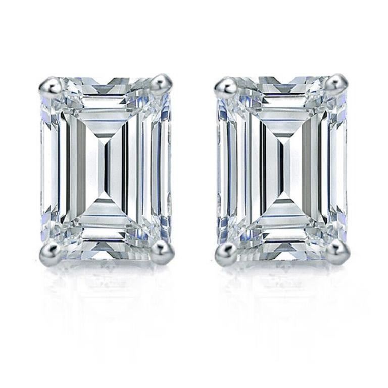 These 2 Sparkling Fire Moissanites are Vvs1 Emerald and F-G in color 7 x 5 mm Emerald Cuts. These Moissanite are near flawless and bursting out with a full spectrum of colors. They are mounted in .925 solid sterling silver complimented 14 Kt White Gold Overlay. The total gram wt. is 2 grams.