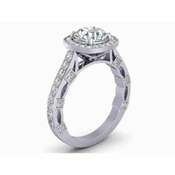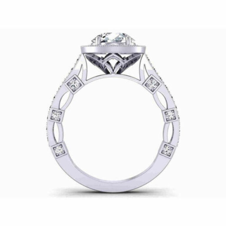 This Ice Blue Fire Moissanite is a VVS1 Brilliant Round Cut Measuring approx. 7.5 mm. This Sky Blue Fire Moissanite is near flawless and bursts out with a full spectrum of colors. It is mounted in .925 solid detailed Vintage scrolling sterling silver complimented 14 Kt White Gold Overlay, which gives the ring its high polish and shine. The Total Weight of this Ring is 4 Grams. Ring size 7.5