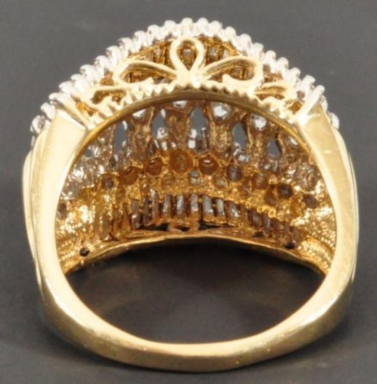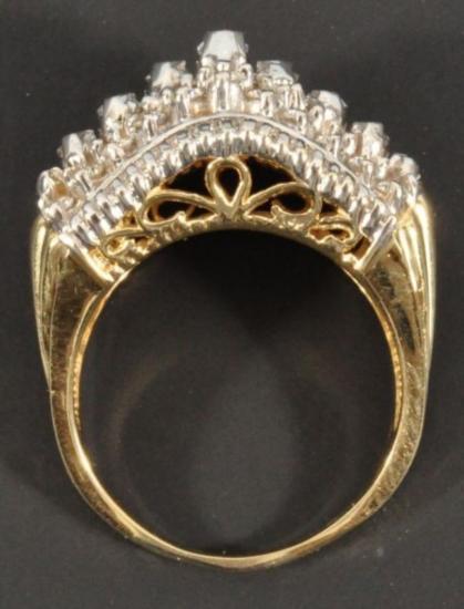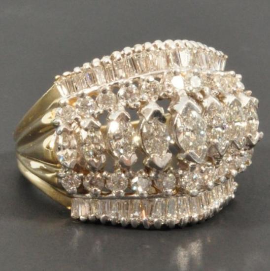 DIAMOND RING - 14 kt. Yellow Gold Diamond Ring. The ring contains nine (9) marquise cut, twenty-two (22) round brilliant cut, and forty (40) tapered baguette diamonds, weighing approx. 3.00 cts. total weight
