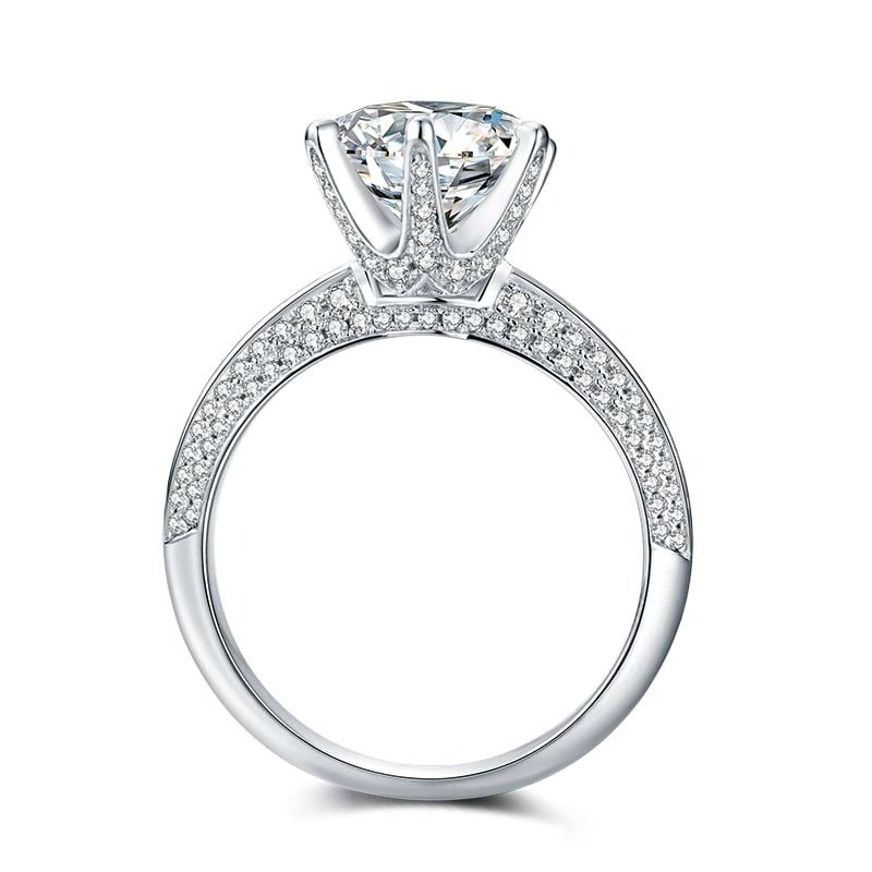 This Large 3 Ct Moissanite Centerstone is a VVS1 Brilliant 9 Cut. The Color is White G-H. It is near flawless and bursting out with a full spectrum of colors. This Moissanite Ring is complimented with cz accent stones. Mounted in .925 solid sterling silver with 14 Kt White Gold Overlay, which gives the ring its high polish and shine. With a refractive index of 2.65-2.69 exhibits more fire and brilliance than a natural diamond. Total weight of this ring is 3.9 grams. Ring size 7.