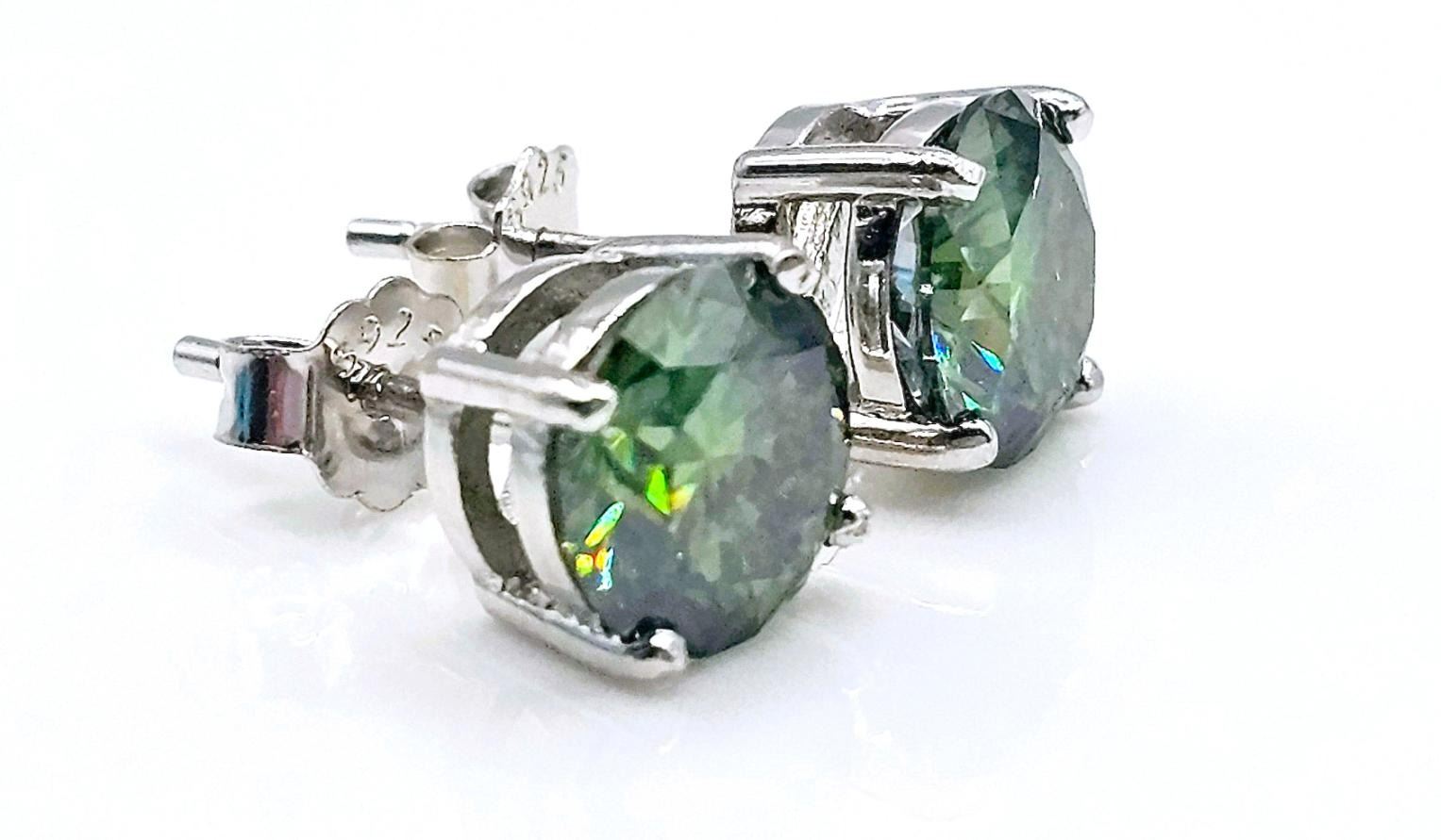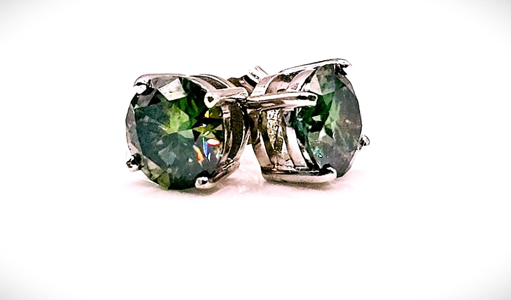 These Beautiful VVS1 Moissanite Earrings Are Near Flawless and bursting out with a full spectrum of colors. The Color is a sparkling emerald green. They are Brilliant Round Cuts Measuring Approx 8mm each and mounted in 14 Kt White Gold Over Solid .925 Sterling Silver, which gives these earrings their high polish and shine. They are also tarnish resistant. The total weight is approx 2.4 grams. With a refractive index of 2.65-2.69, this Moissanites exhibit more brilliance and fire than a natural diamond thanks to a dispersion that is 2.4 times higher. With the measurement of 9.25 hardness on the mohs hardness scale these moissanites will test positive for a diamond on almost every diamond tester. They are also conflict free and earth friendly. Pictures do not do these earrings justice. They Dance With Sparkle!!! You'll love this magnificent pair of earrings.