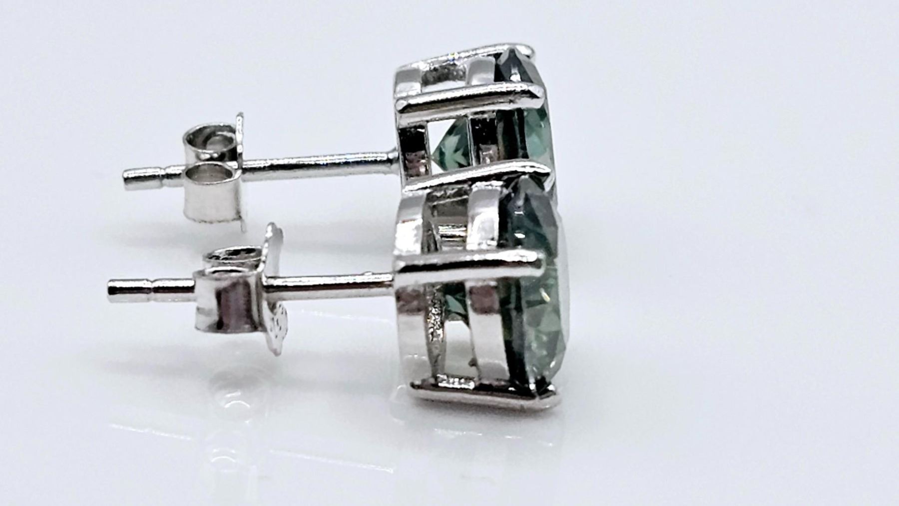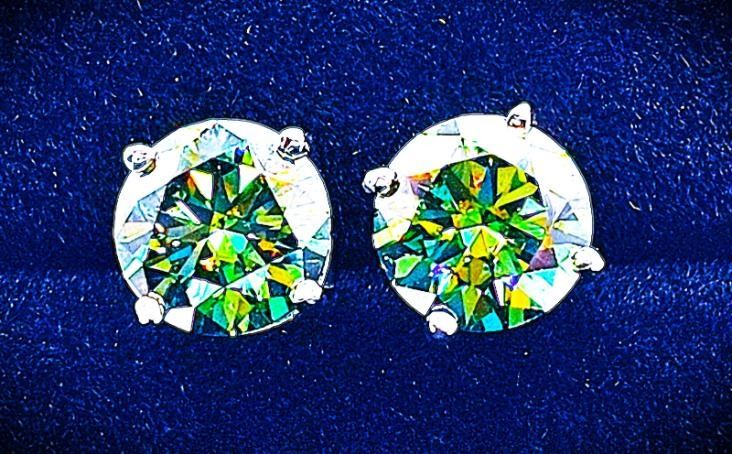 These Beautiful VVS1 Moissanite Earrings Are Near Flawless and bursting out with a full spectrum of colors. The Color is a sparkling emerald green. They are Brilliant Round Cuts Measuring Approx 8mm each and mounted in 14 Kt White Gold Over Solid .925 Sterling Silver, which gives these earrings their high polish and shine. They are also tarnish resistant. The total weight is approx 2.4 grams. With a refractive index of 2.65-2.69, this Moissanites exhibit more brilliance and fire than a natural diamond thanks to a dispersion that is 2.4 times higher. With the measurement of 9.25 hardness on the mohs hardness scale these moissanites will test positive for a diamond on almost every diamond tester. They are also conflict free and earth friendly. Pictures do not do these earrings justice. They Dance With Sparkle!!! You'll love this magnificent pair of earrings.