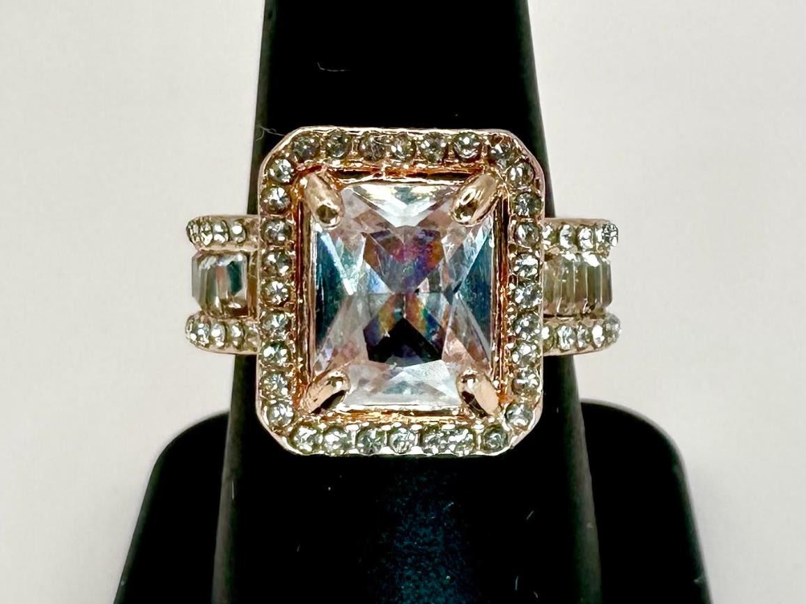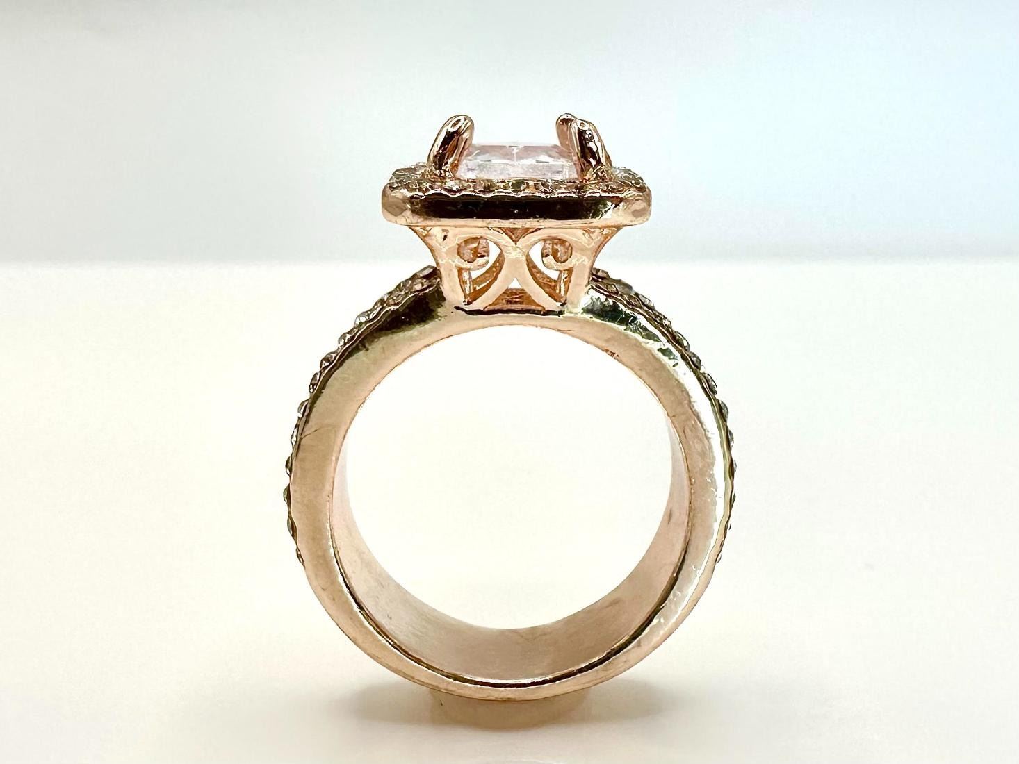 This Sparkling 5 Ct Lab Simulated Diamond Is A Radiant Cut Measuring 10mm x 8mm. It is eye clean and has a beautiful light pink hue This Centerstone Is Mounted In 14 Kt Rose Gold. Ring size 8. The total weight of this ring is 10 grams.