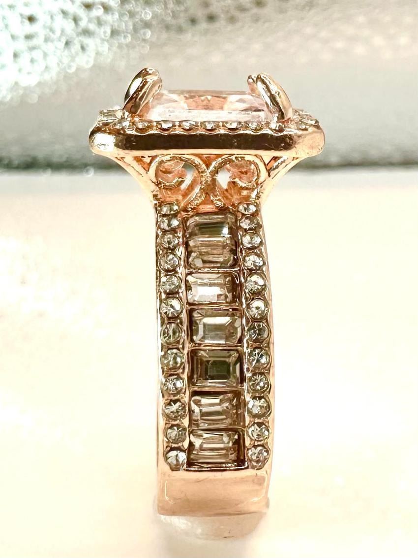 This Sparkling 5 Ct Lab Simulated Diamond Is a Radiant Cut Measuring 10mm x 8mm. It is eye clean and has a beautiful light pink hue This Centerstone Is Mounted In 14 Kt Rose Gold. Ring size 8. The total weight of this ring is 10.3 grams.