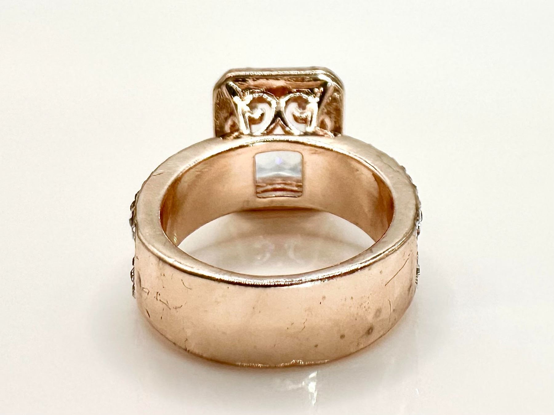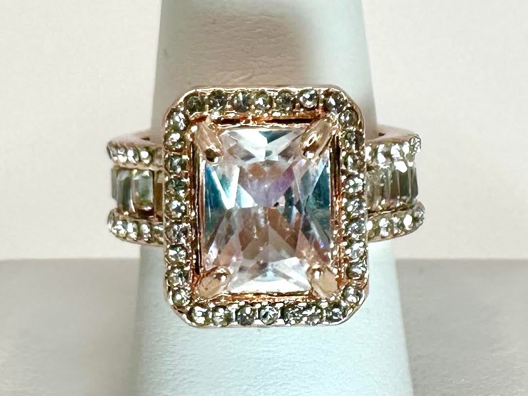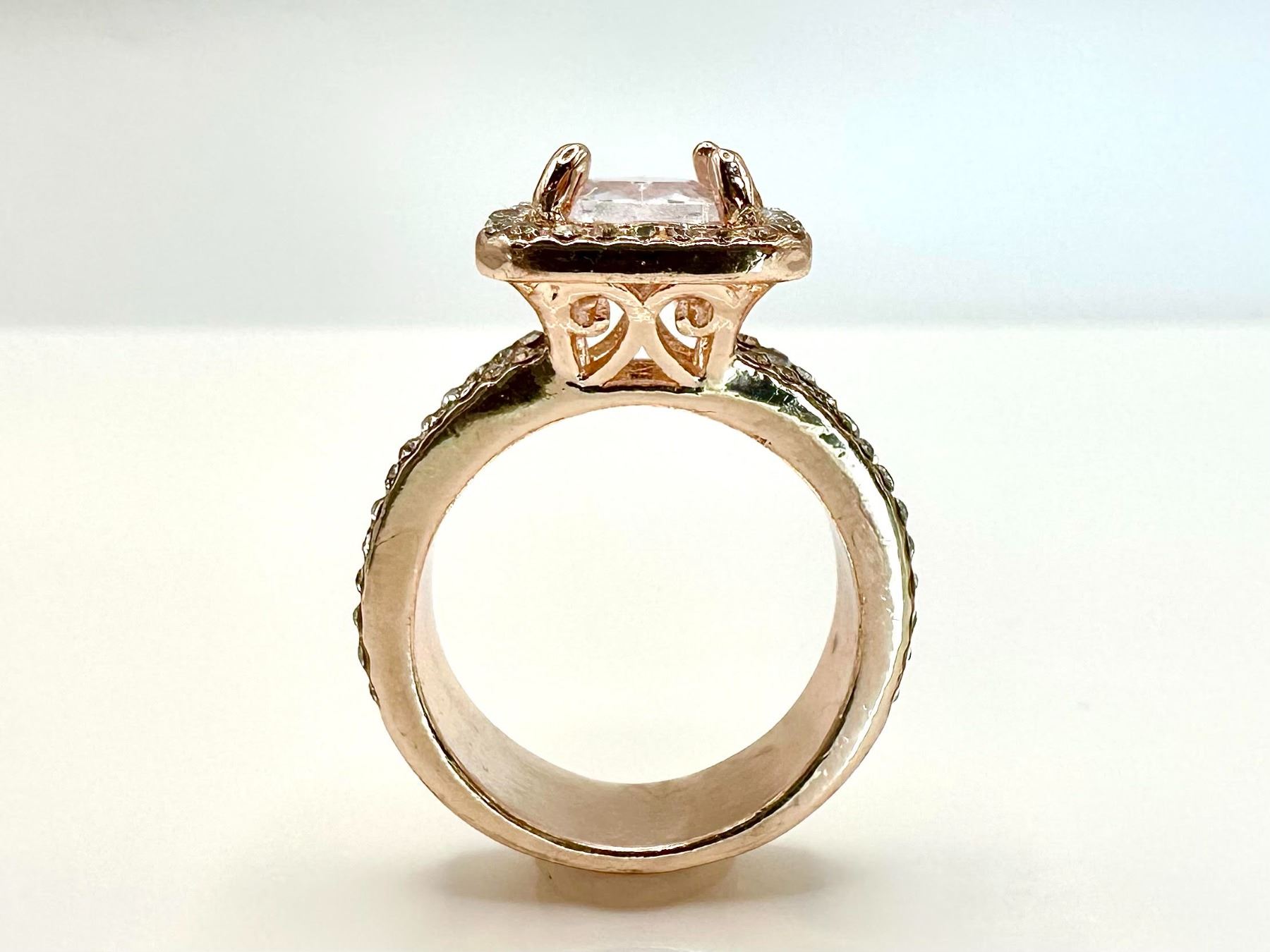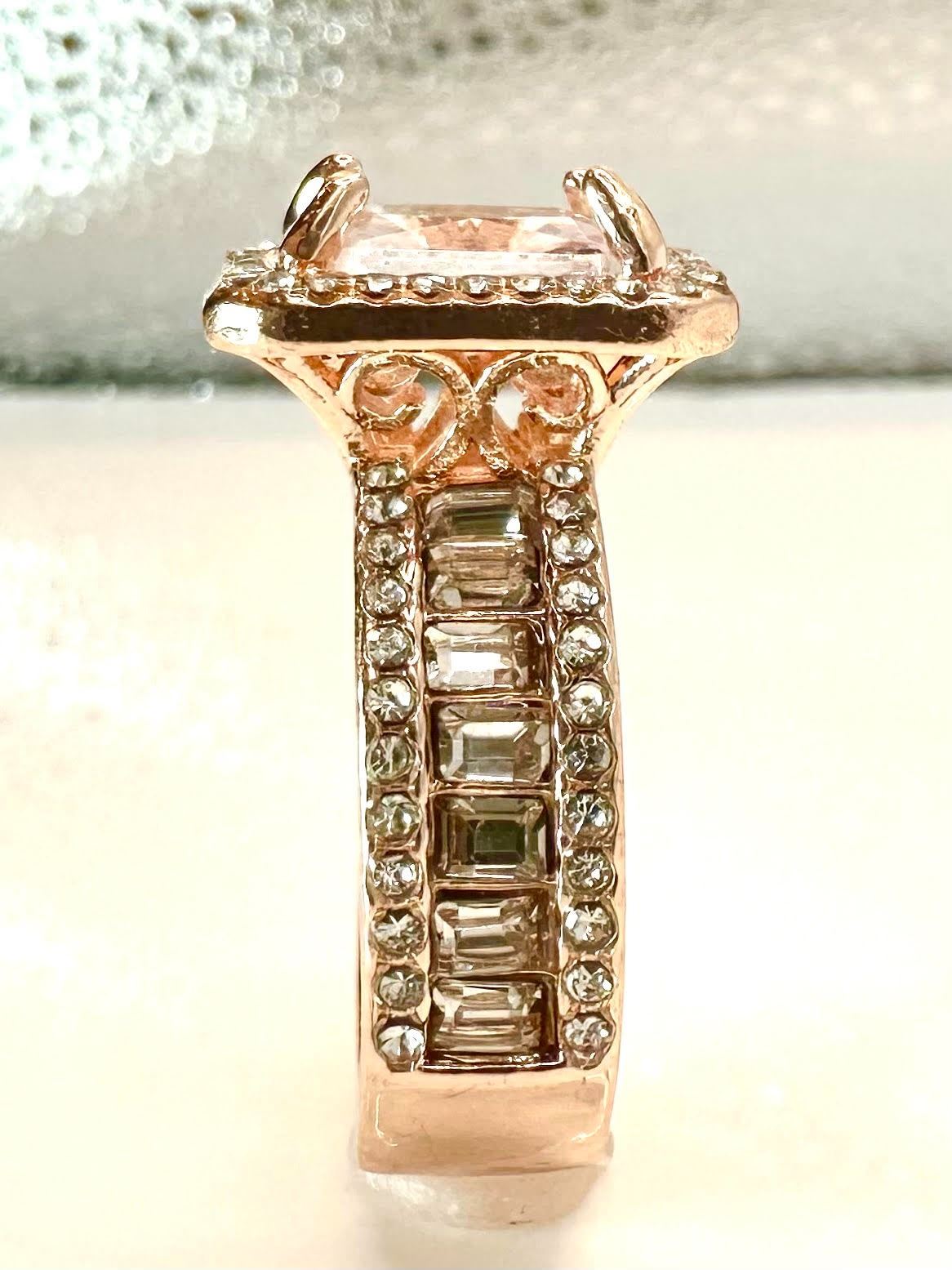 This Sparkling 5 Ct Lab Simulated Diamond Is A Radiant Cut Measuring 10mm x 8mm. It is eye clean and has a beautiful light pink hue This Centerstone Is Mounted In 14 Kt Rose Gold. Ring size 8. The total weight of this ring is 10.6 grams.