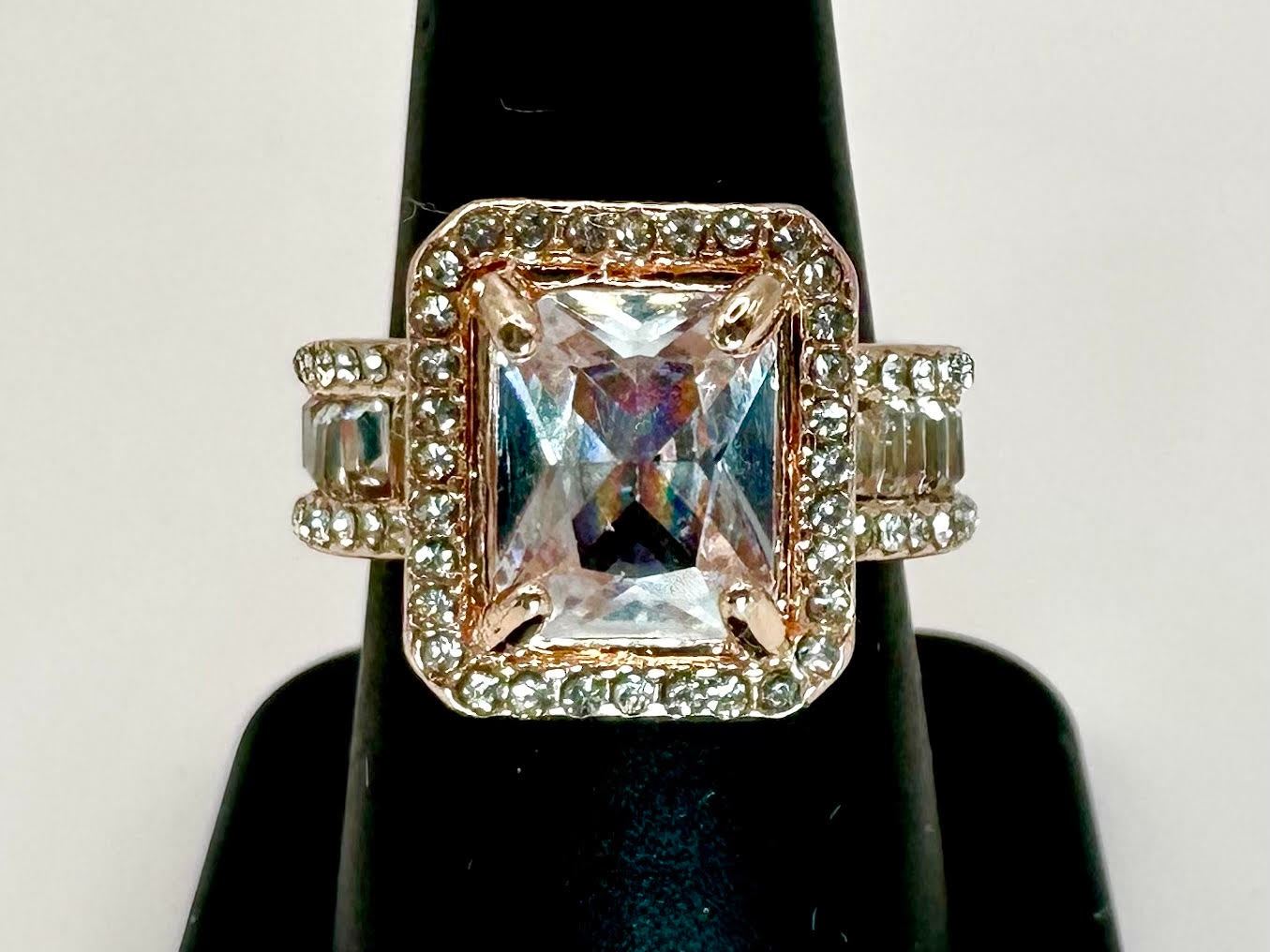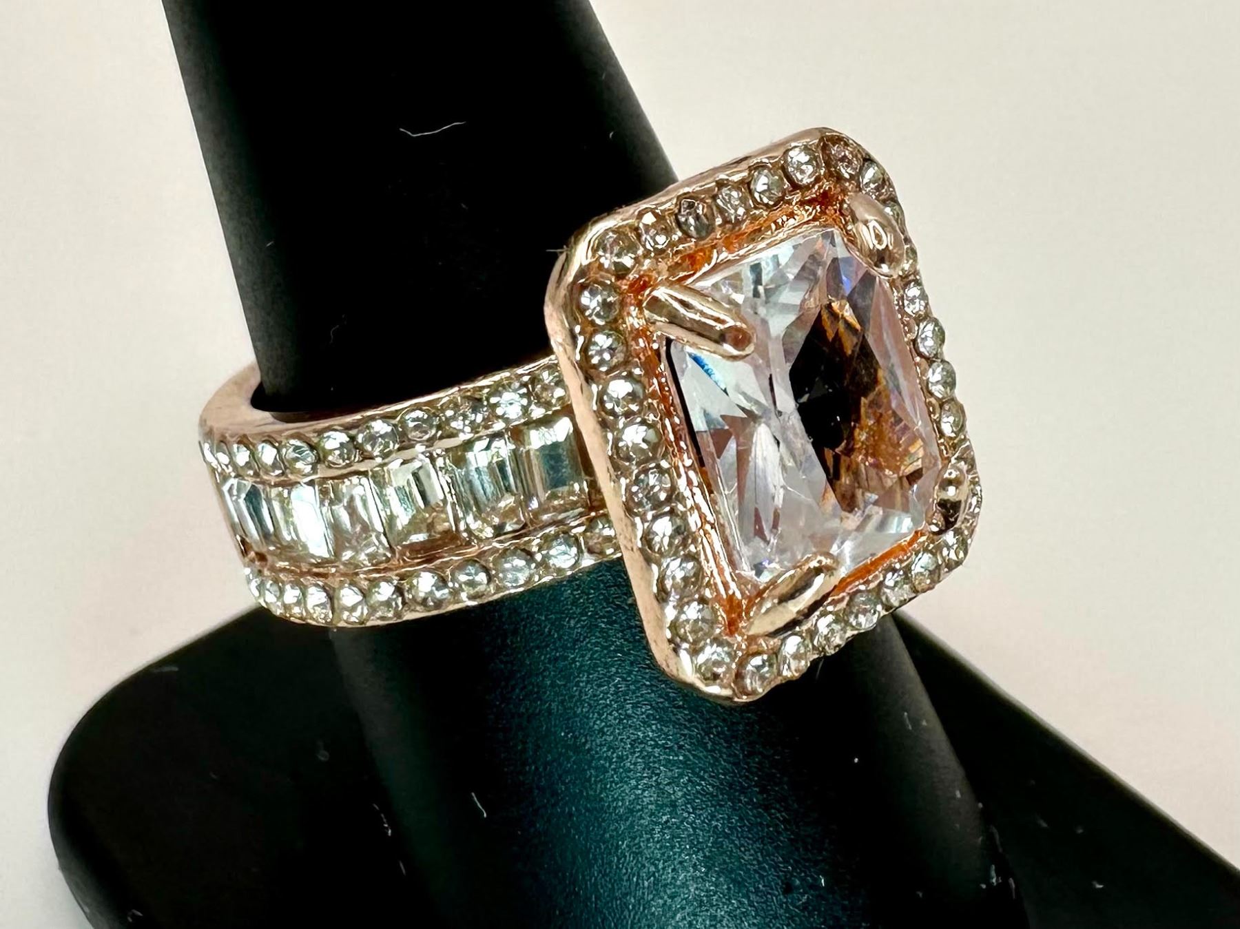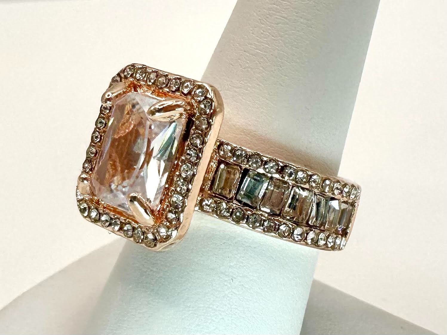 This Sparkling 5 Ct Lab Simulated Diamond Is A Radiant Cut Measuring 10mm x 8mm. It is eye clean and has a beautiful light pink hue This Centerstone Is Mounted In 14 Kt Rose Gold. Ring size 8. The total weight of this ring is 10.6 grams.