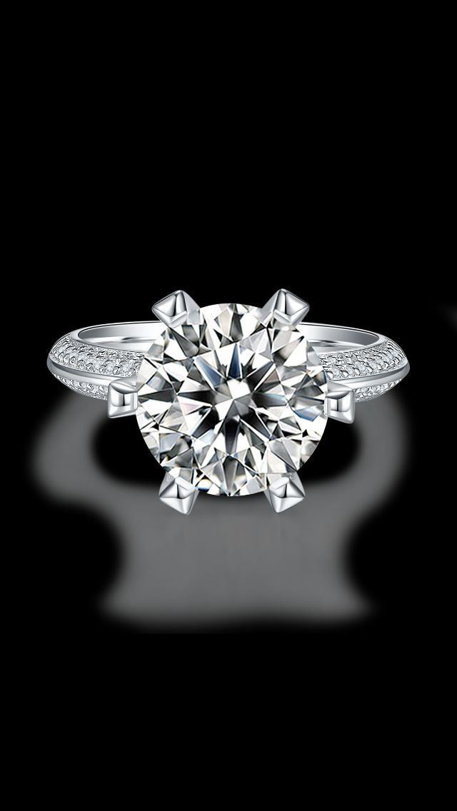 This Fire Moissanite is a VVS1 Brilliant Round Cut. The Color is F-G with a clarity of VVS-1. Measuring approx.10.5 mm. This Fire Moissanite is near flawless and bursting out with a full spectrum of colors and adorned with 124 accent stones. It is mounted in .925 solid sterling silver complimented 14 Kt White Gold Overlay, which gives the ring its high polish and shine. It is also tarnish resistant. With a refractive index of 2.65-2.69 exhibits more brilliance than a diamond thanks to a dispersion that is 2.4 times higher than a natural diamond. It is also conflict free and earth friendly. This exceptional Moissanite measures 9.25 on the mohs hardness scale and will test positive for a diamond with almost any diamond tester. Ring size 7. Total gram wt is approx. 4.6 total grams.